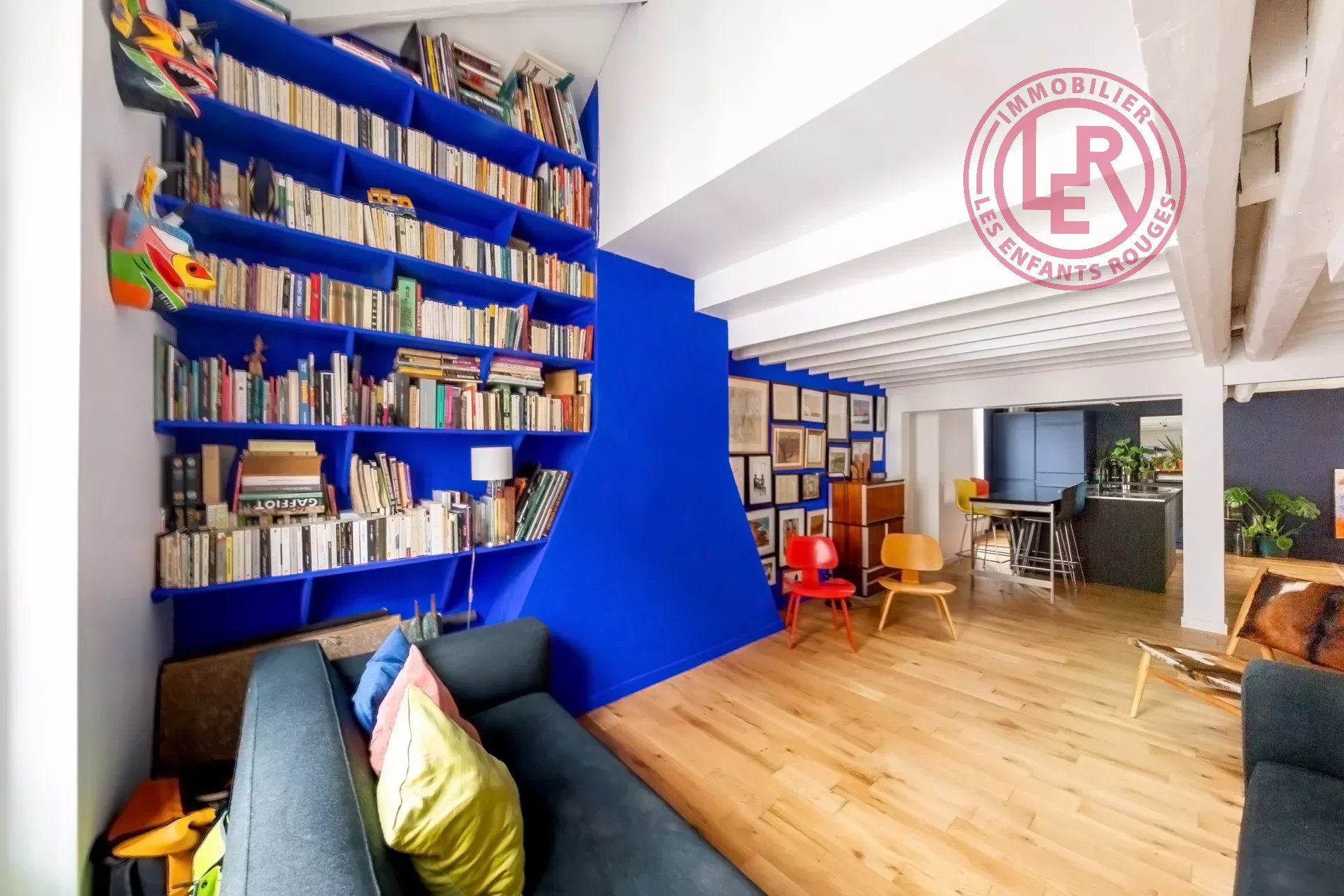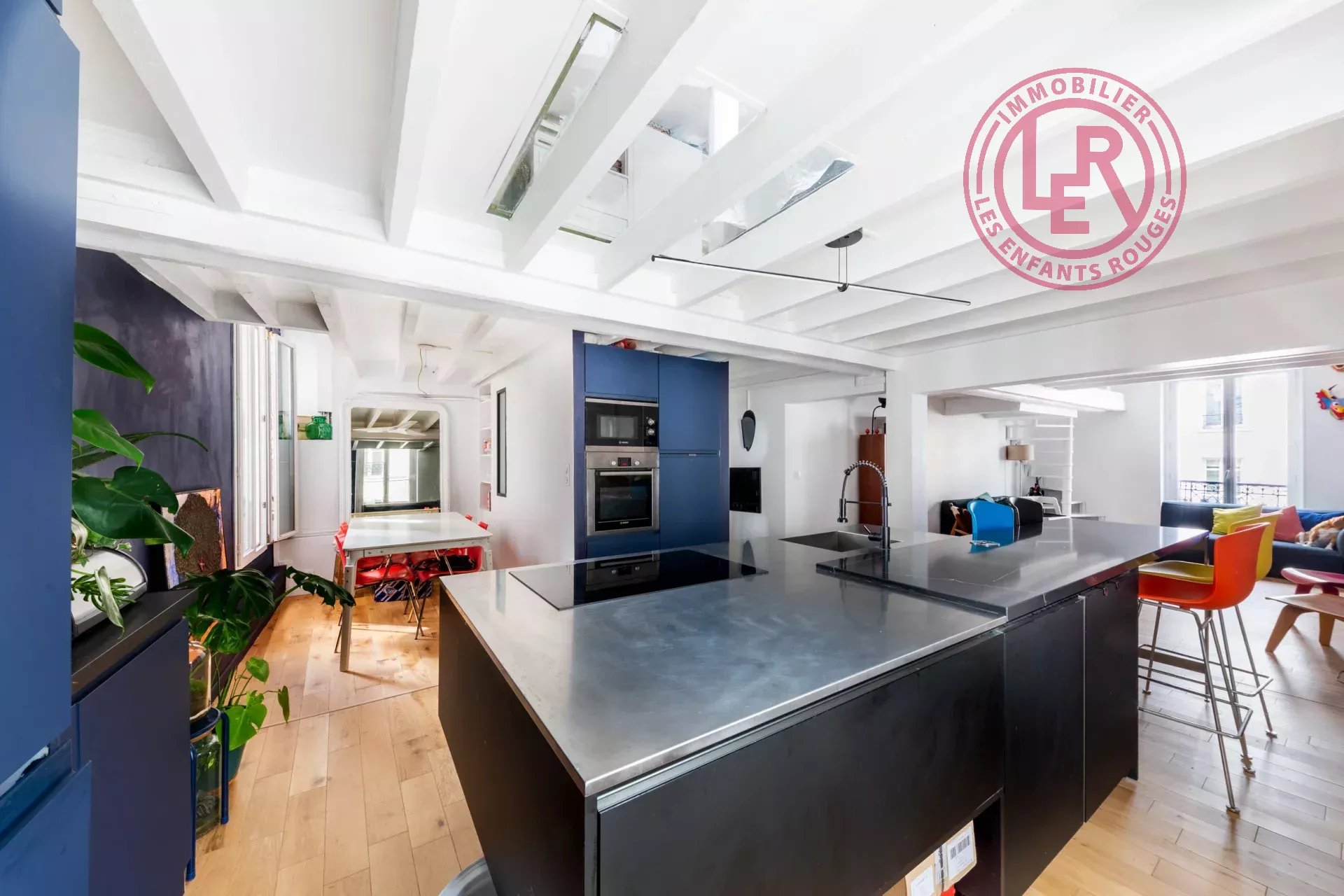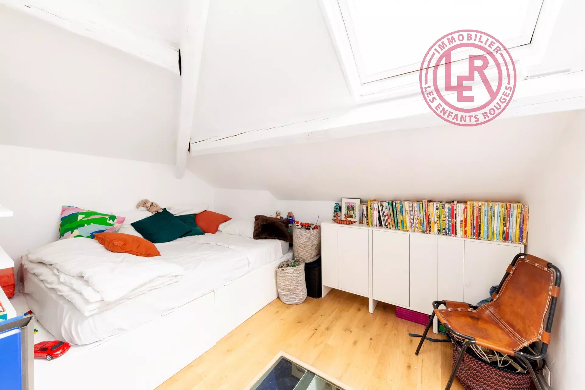 Il se compose, au premier niveau, d’une entrée desservant une salle de douche avec toilettes, d’un salon ouvert de 43m2 sur une cuisine équipée et aménagée avec îlot central, et d’une salle à manger, pouvant être aménagée en chambre. À l’étage, l’espace nuit est composé de deux chambres et d’une salle de bain avec toilettes. L’ensemble a été récemment rénové avec des matériaux de qualité. Un local à vélos est accessible dans la cour de l’immeuble.