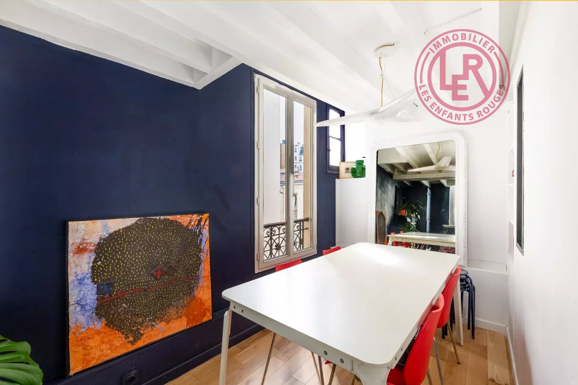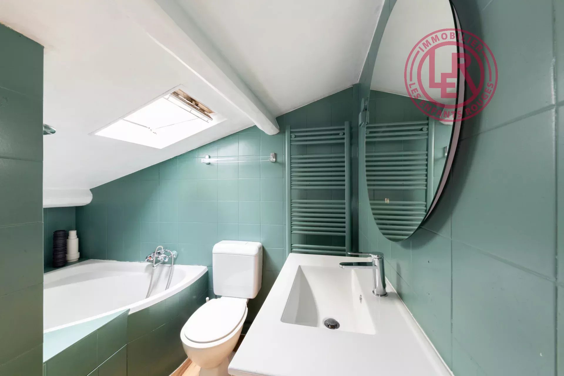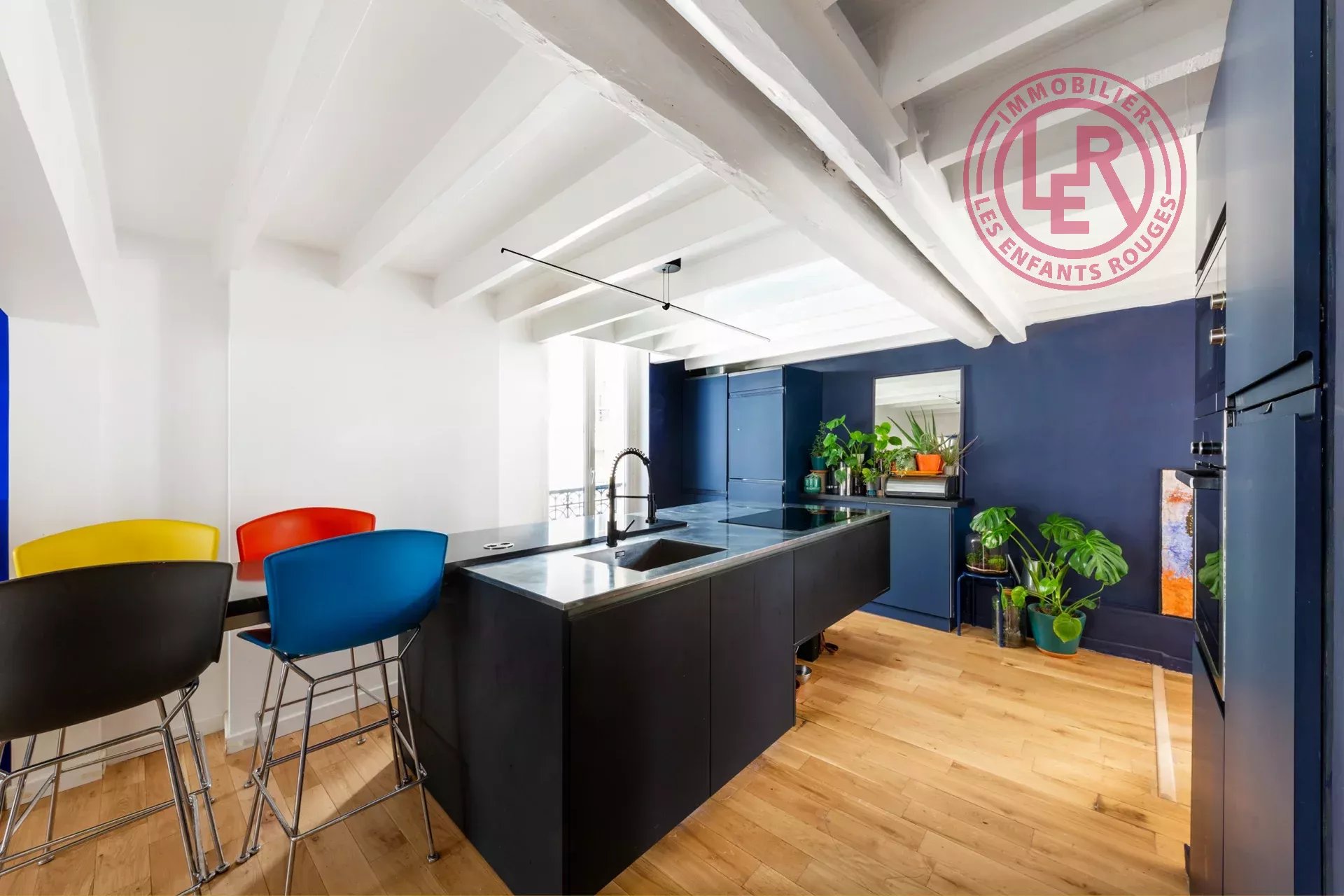 Il se compose, au premier niveau, d’une entrée desservant une salle de douche avec toilettes, d’un salon ouvert de 43m2 sur une cuisine équipée et aménagée avec îlot central, et d’une salle à manger, pouvant être aménagée en chambre. À l’étage, l’espace nuit est composé de deux chambres et d’une salle de bain avec toilettes. L’ensemble a été récemment rénové avec des matériaux de qualité. Un local à vélos est accessible dans la cour de l’immeuble.
