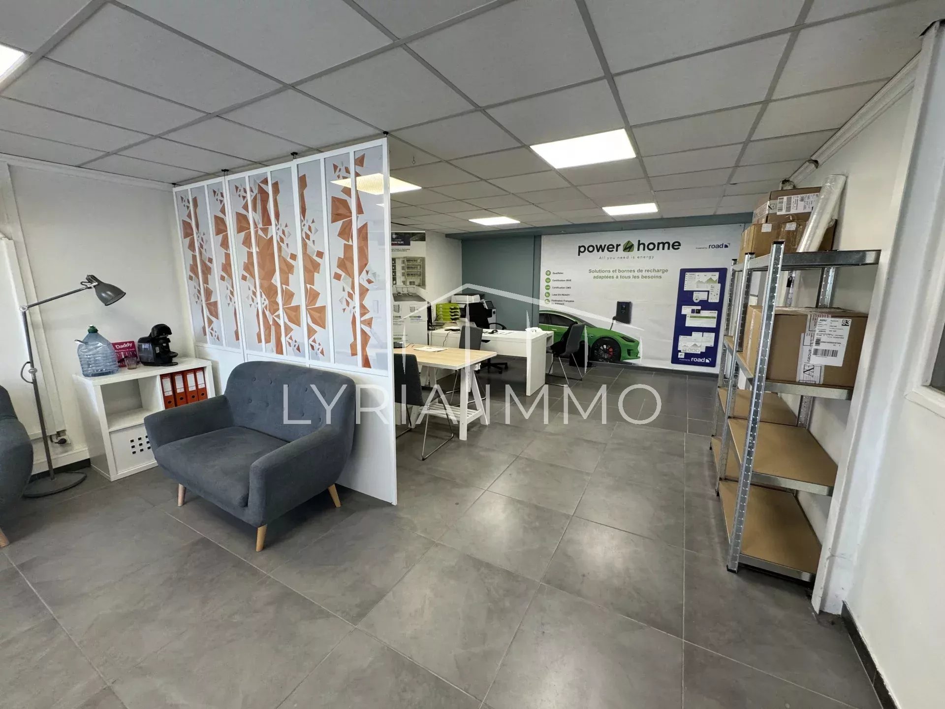 Idéal pour des activités tertiaires, il dispose d'une surface au sol de 170 m2, d'un bloc sanitaire avec douche, et d'une mezzanine d'environ 50 m2 composée d'un espace bureau avec salle de repos et cuisine.