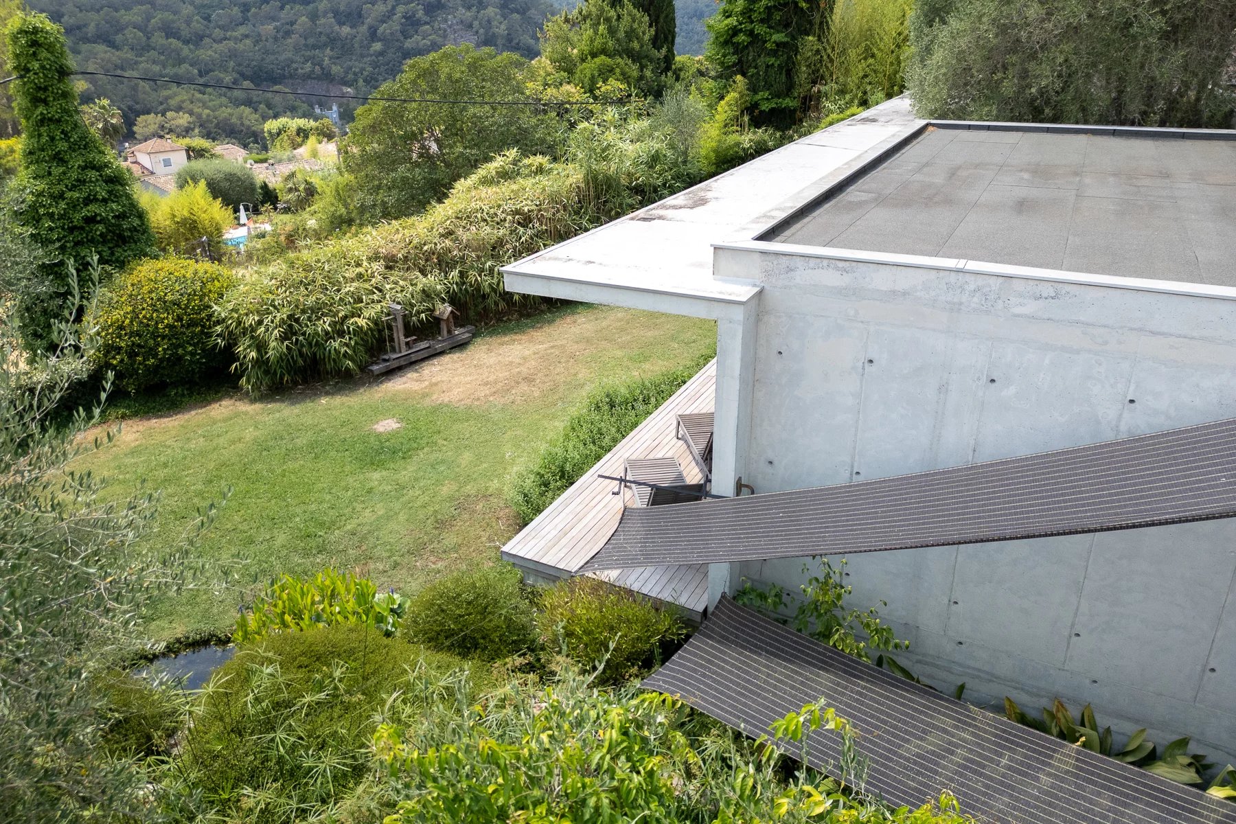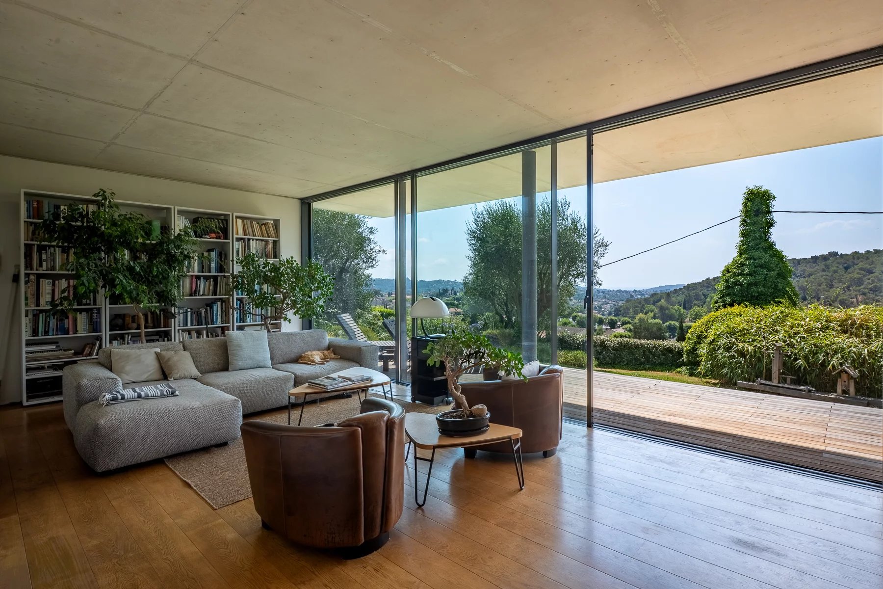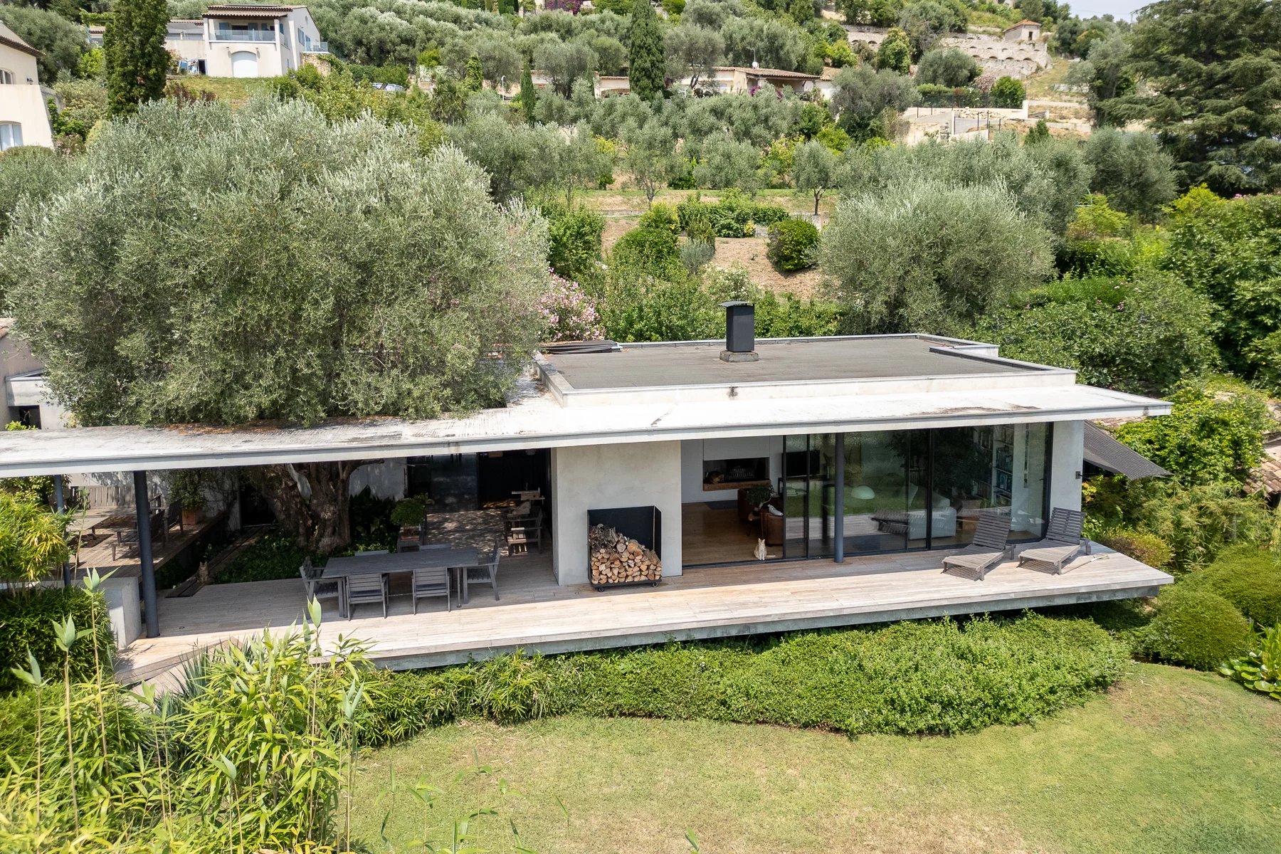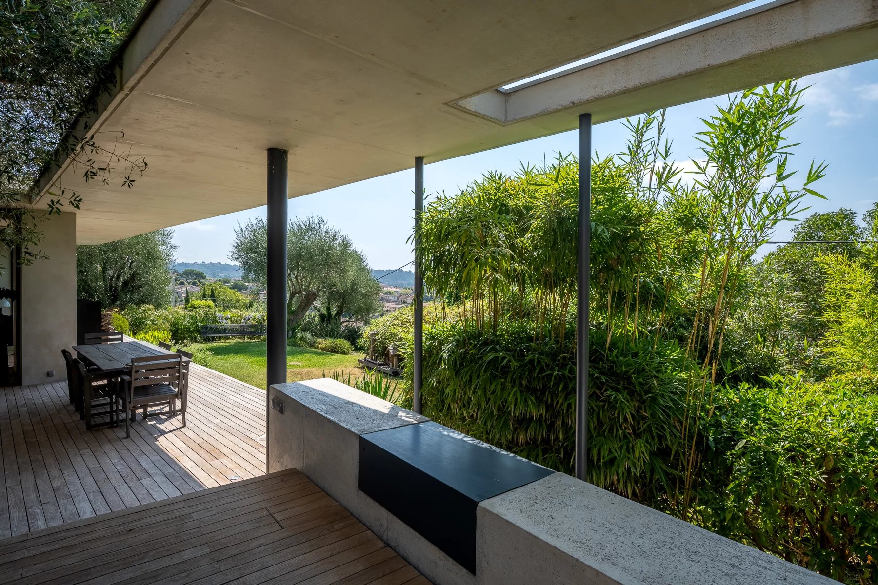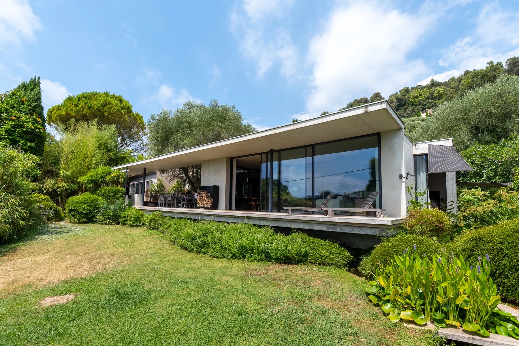 Nichée dans un écrin de verdure, à quelques pas du cœur du village de La Colle-sur-Loup, ancienne capitale de rose à parfum, cette villa de plain-pied à l’architecture néo-brutaliste de 2013, mêle avec audace lignes contemporaines, béton brut et lumière du Sud. Ici, l'esprit contemporain se conjugue à la douceur de vivre provençale. Dès l’entrée, le regard est happé par la perspective ouverte sur la mer, les collines et le village, grâce à de vastes baies vitrées qui baignent les espaces de lumière. La pièce de vie, ouverte et chaleureuse, rassemble salon avec cheminée, salle à manger et cuisine ouverte prolongée d’une arrière-cuisine discrète et fonctionnelle. Côté nuit, trois chambres, accompagnées de deux salles d'eau, deux WC et de nombreux rangements intelligemment pensés. À l’extérieur, la terrasse en teck court tout le long de la maison, véritable trait d’union entre intérieur et nature. Le jardin de 1 500 m² environ, plat, et paysagé, s’organise comme un lieu de ressourcement : bassins aux plantes aquatiques, jacuzzi enveloppé de bambous de multiples espèces, oliviers centenaires, potager, arbres fruitiers, espace barbecue intégré… Une invitation permanente à la détente, en toute intimité. Une maisonnette indépendante de 20 m² avec terrasse complète la propriété — parfait pour recevoir famille ou amis dans un cocon indépendant. Les annexes sont nombreuses et utiles : garage équipé pour véhicules électriques, remise, atelier, cave. Pensée pour un confort de vie durable, cette villa est classée A en performance énergétique (RT 2012 – BBC), équipée d’une construction anti-sismique, permis obtenu pour une piscine, située dans un site inscrit aux Monuments Historiques, à proximité immédiate du village et des commerces. Calme absolu, exposition plein Sud, vie à pied vers les commerces et les écoles : un bien rare dans un environnement préservé. Un bien d'exception, à découvrir sans tarder https://www.georisques.gouv.fr