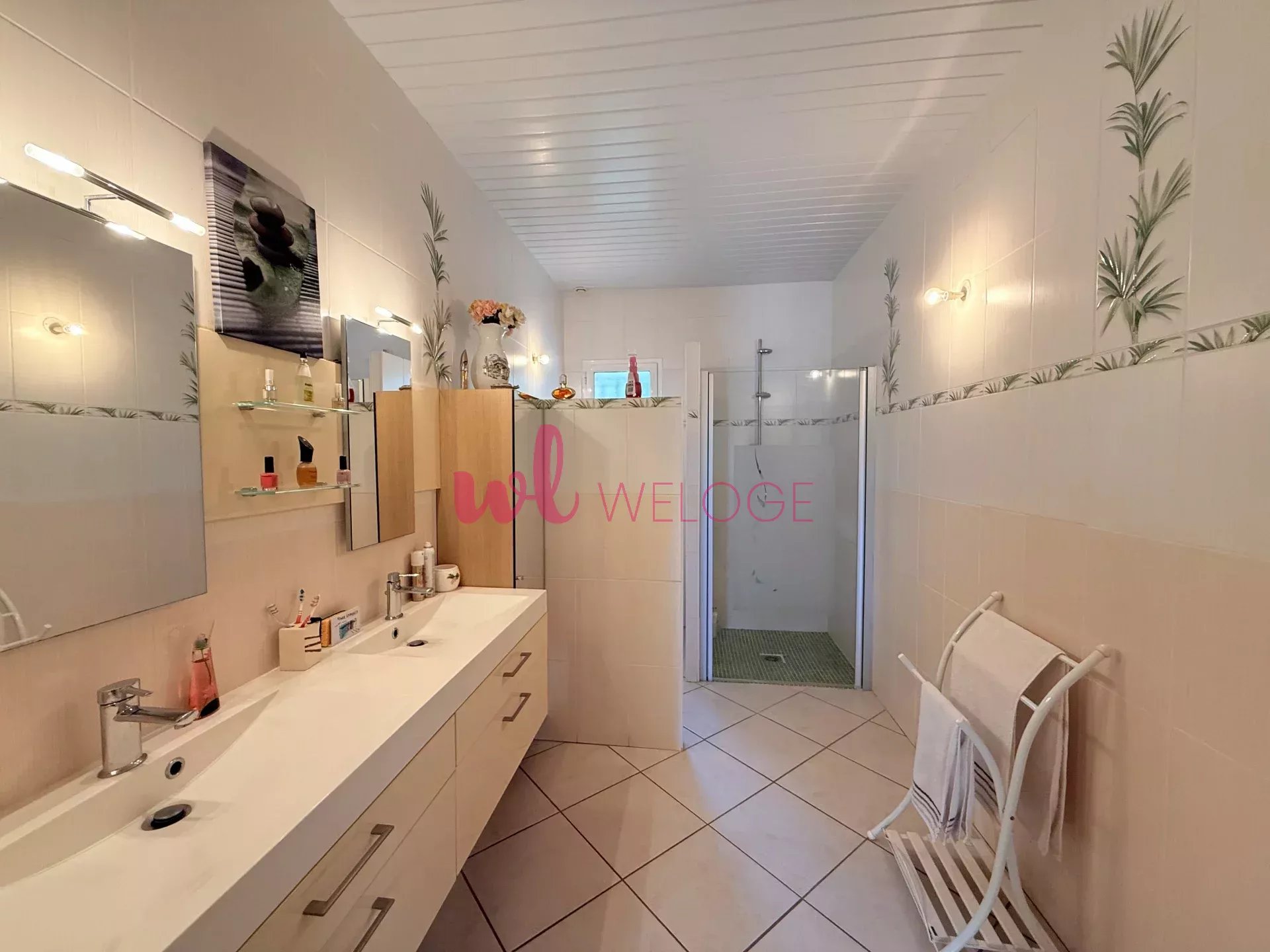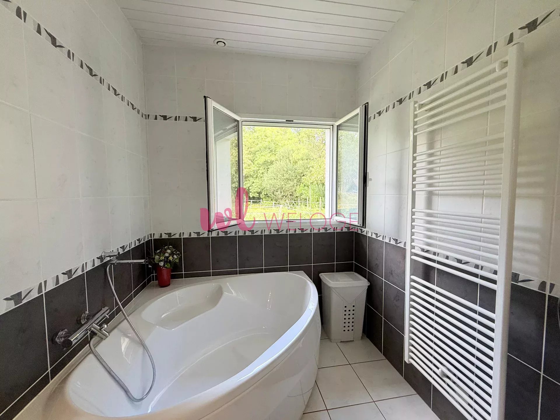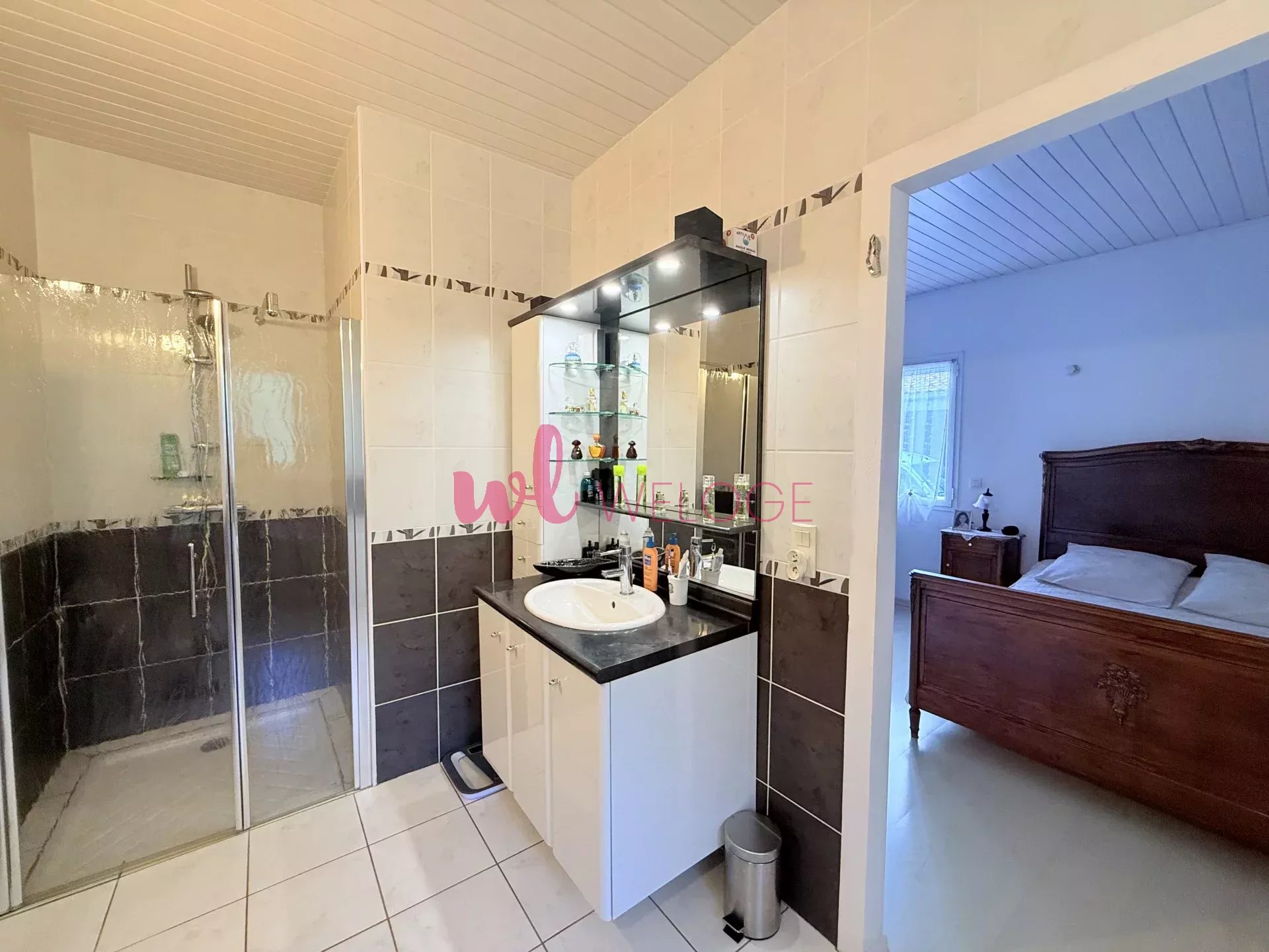 La maison dispose de quatre chambres dont une suite parentale élégante avec salle de bain privative comprenant douche et baignoire. Une salle de bain indépendante avec WC, un second toilette séparé ainsi qu’un bureau viennent compléter l’agencement fonctionnel et confortable de cette maison.