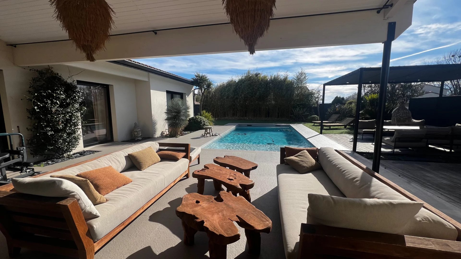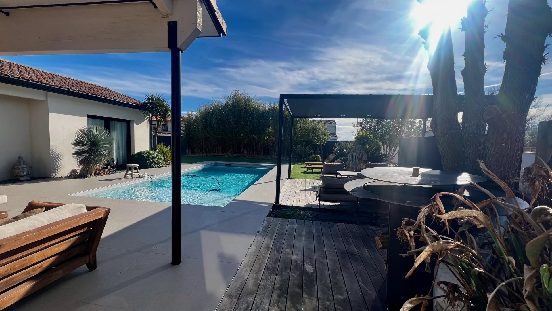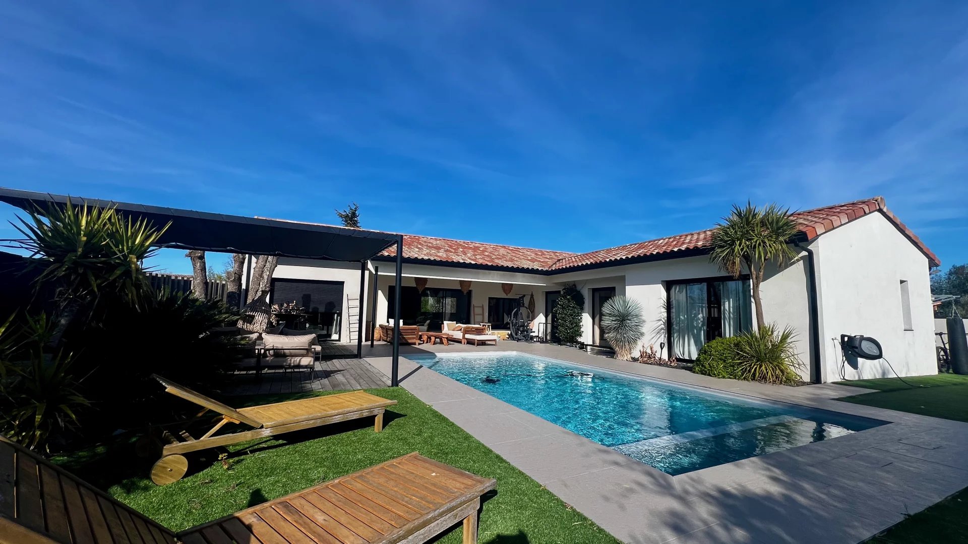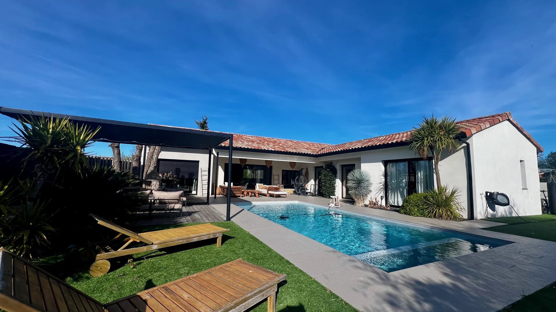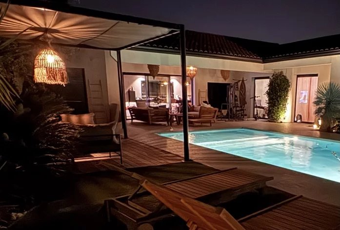 Idéalement située dans une impasse au calme, cette maison contemporaine allie élégance et confort moderne. Espaces de vie généreux : Pièce de vie lumineuse de 60 m² avec cuisine ouverte entièrement équipée Salon indépendant de 25 m², parfait pour un espace détente supplémentaire Côté nuit : Suite parentale avec dressing et salle d'eau Deux chambres avec salle de bain commune Suite de convivialité avec salle d'eau et toilettes privatives Prestations haut de gamme : Chauffage au sol & climatisation Système de sonorisation intégré Volets roulants électriques Grande buanderie fonctionnelle Extérieur soigné : Jardin paysagé sans entretien Piscine chauffée Vaste terrasse carrelée avec éclairage d'ambiance