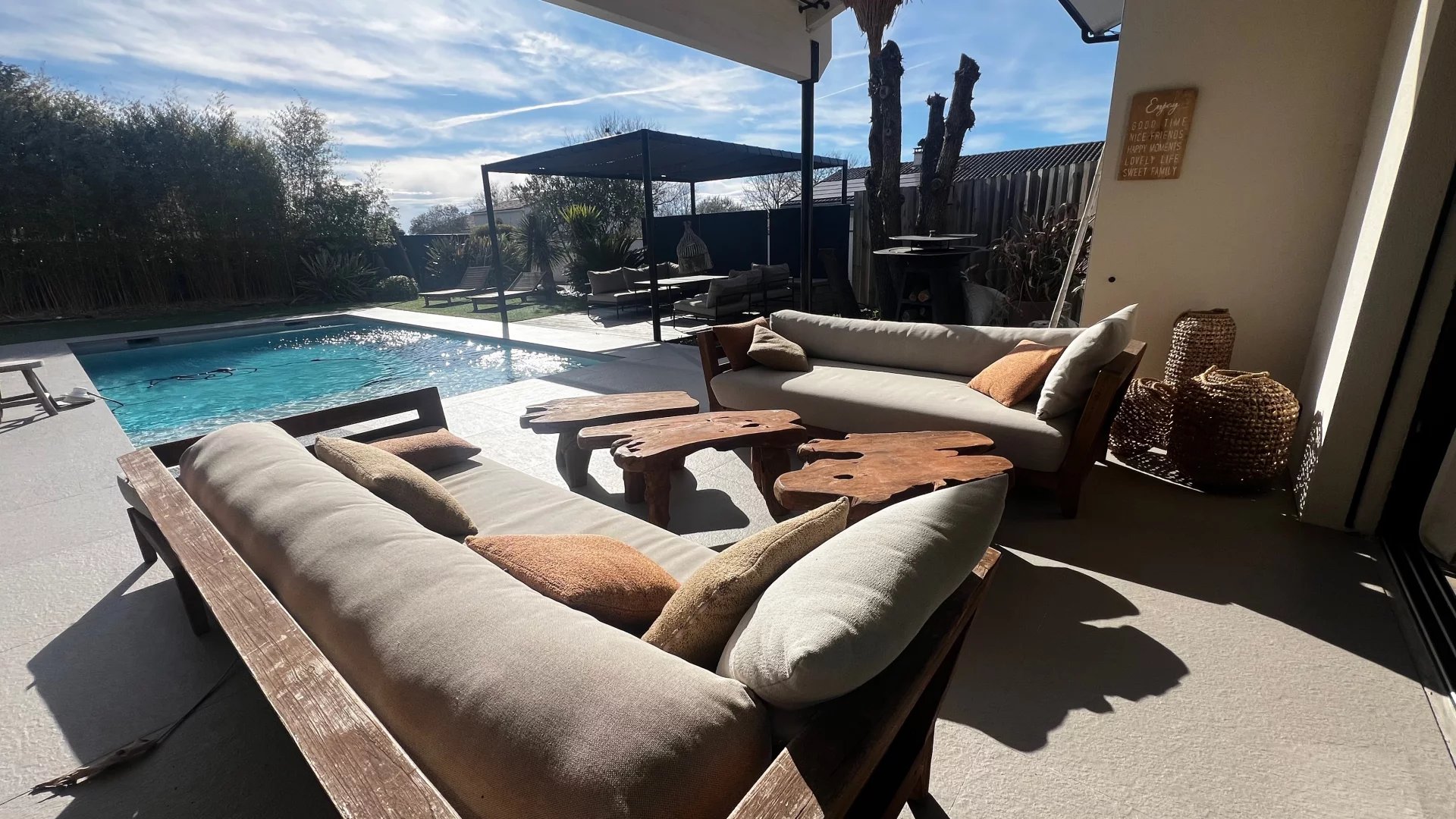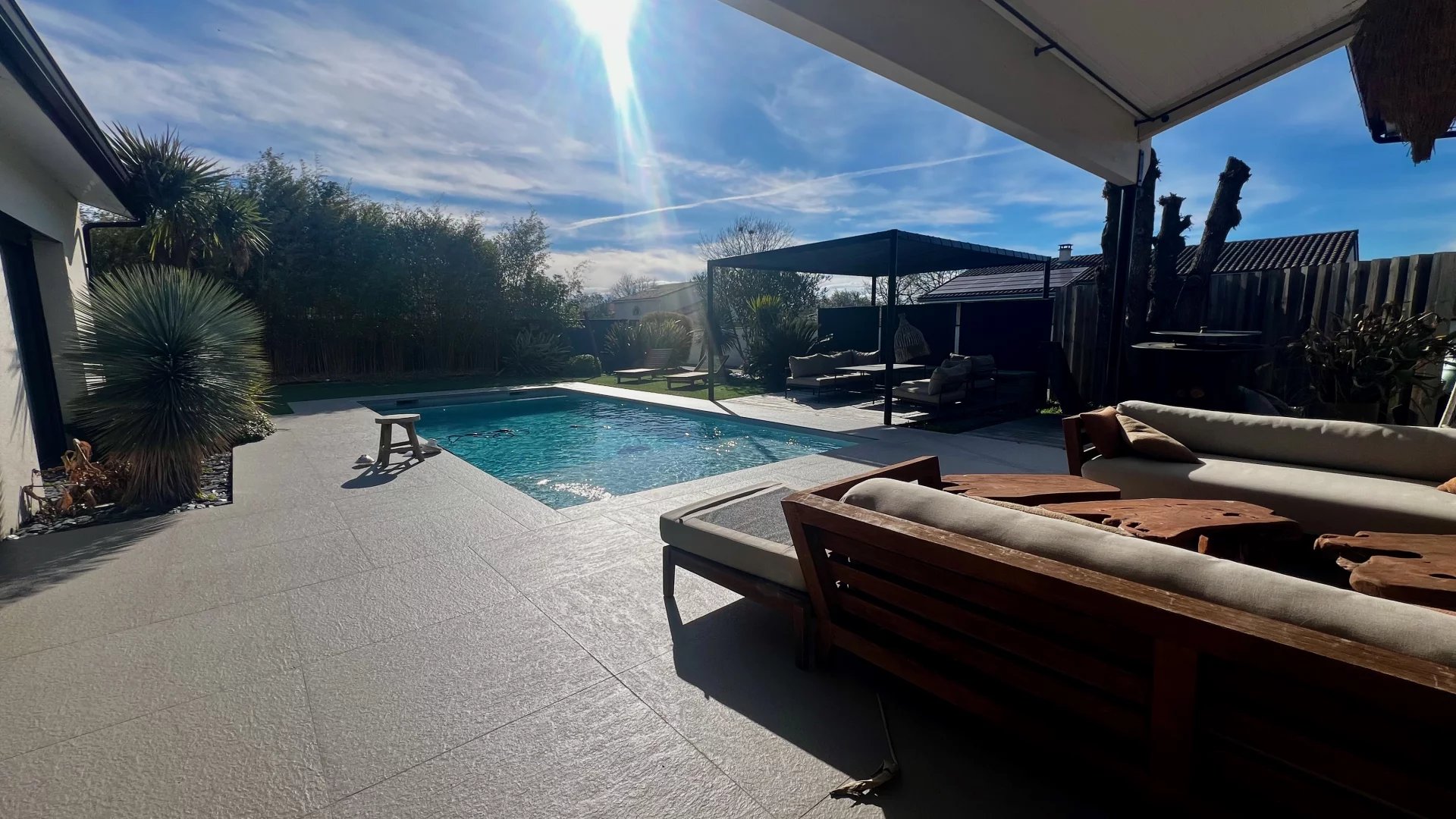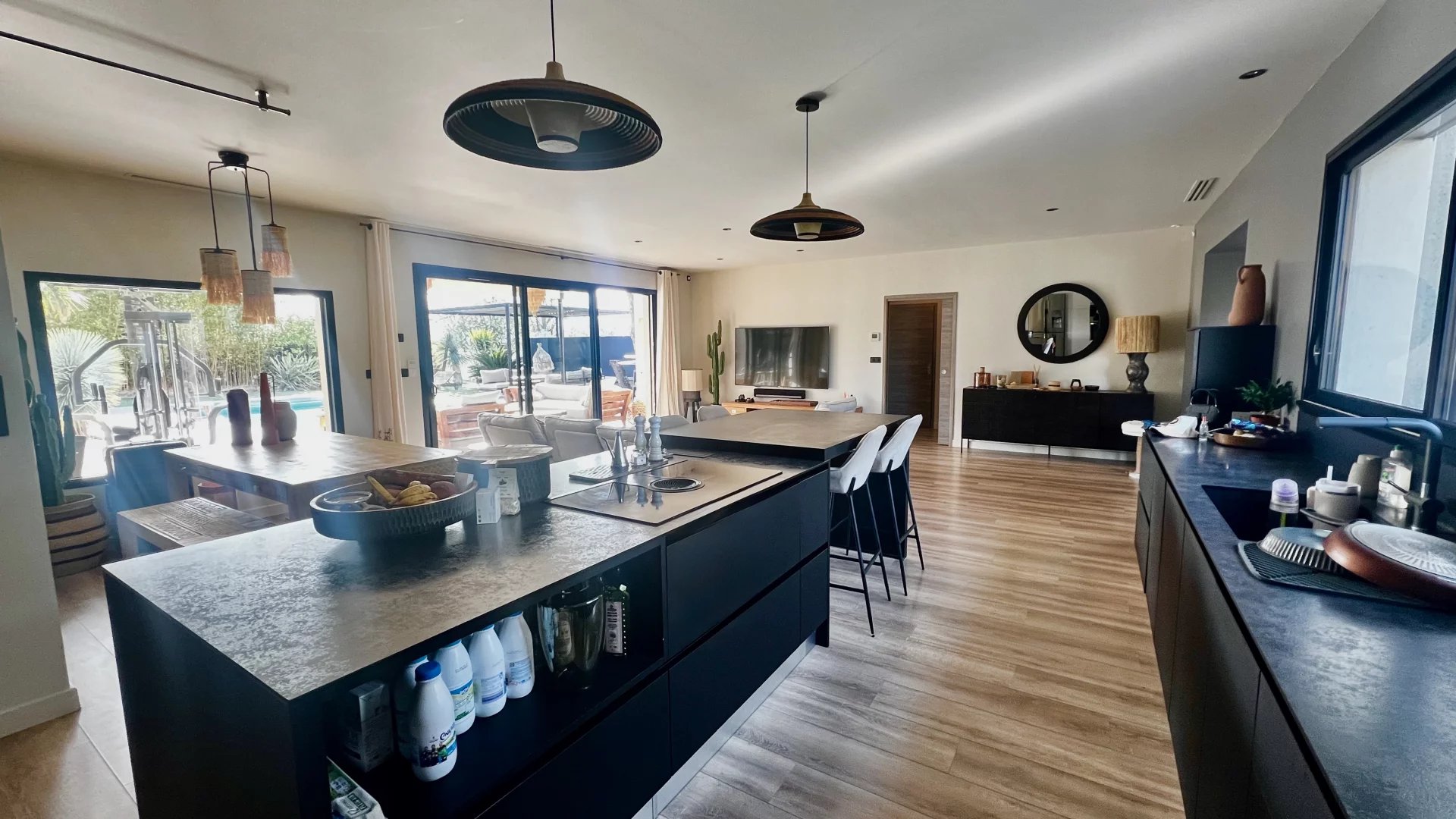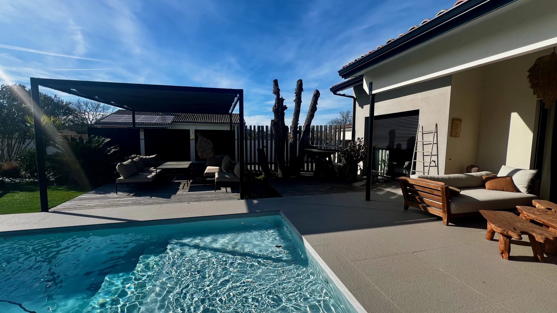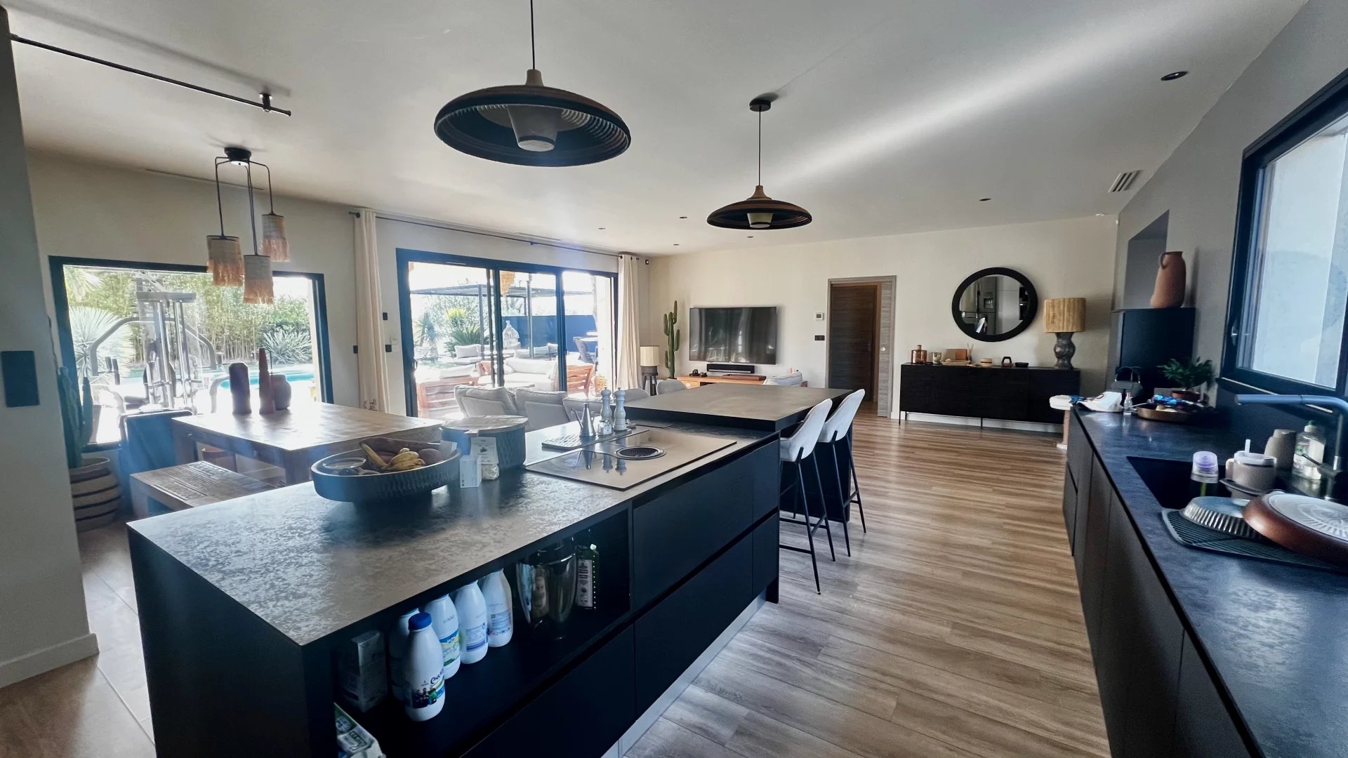 Idéalement située dans une impasse au calme, cette maison contemporaine allie élégance et confort moderne. Espaces de vie généreux : Pièce de vie lumineuse de 60 m² avec cuisine ouverte entièrement équipée Salon indépendant de 25 m², parfait pour un espace détente supplémentaire Côté nuit : Suite parentale avec dressing et salle d'eau Deux chambres avec salle de bain commune Suite de convivialité avec salle d'eau et toilettes privatives Prestations haut de gamme : Chauffage au sol & climatisation Système de sonorisation intégré Volets roulants électriques Grande buanderie fonctionnelle Extérieur soigné : Jardin paysagé sans entretien Piscine chauffée Vaste terrasse carrelée avec éclairage d'ambiance