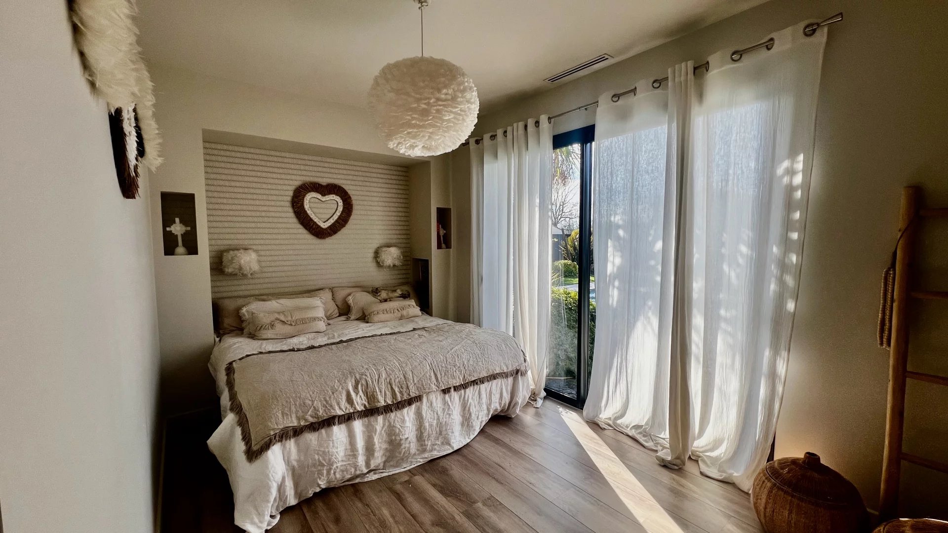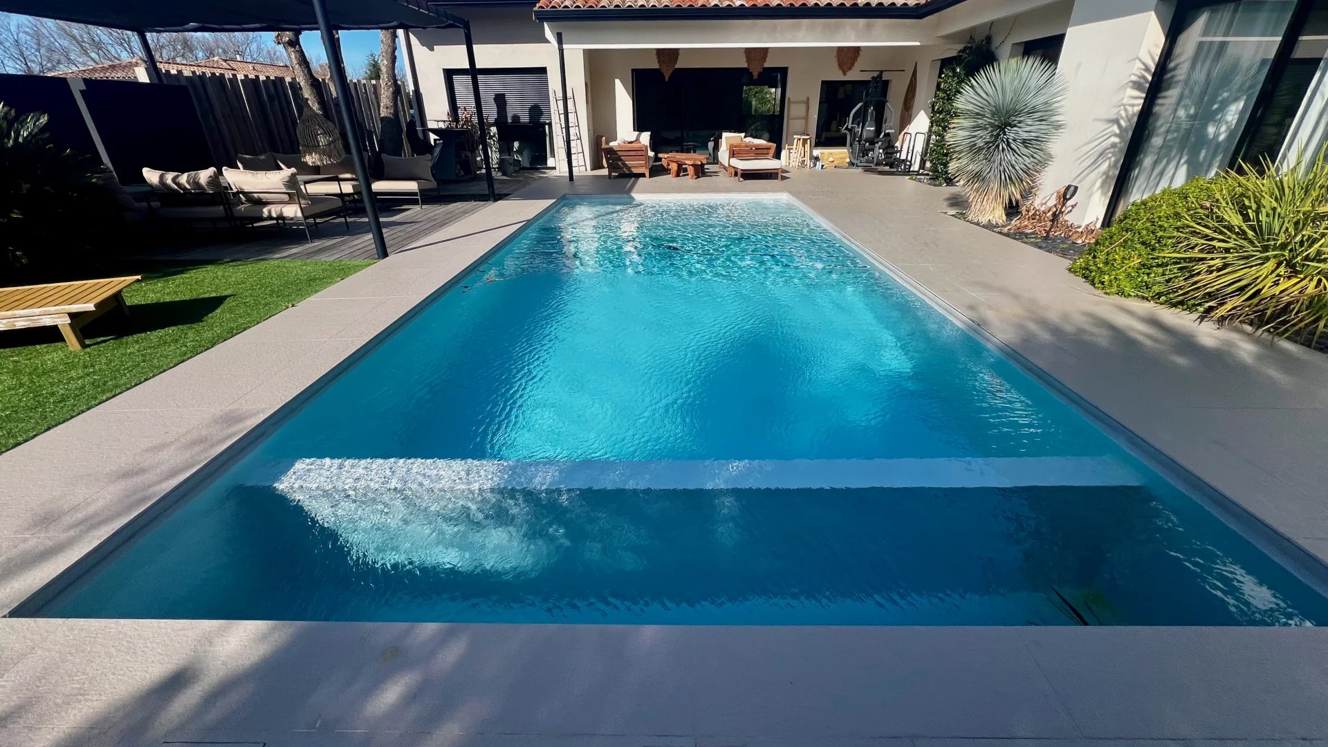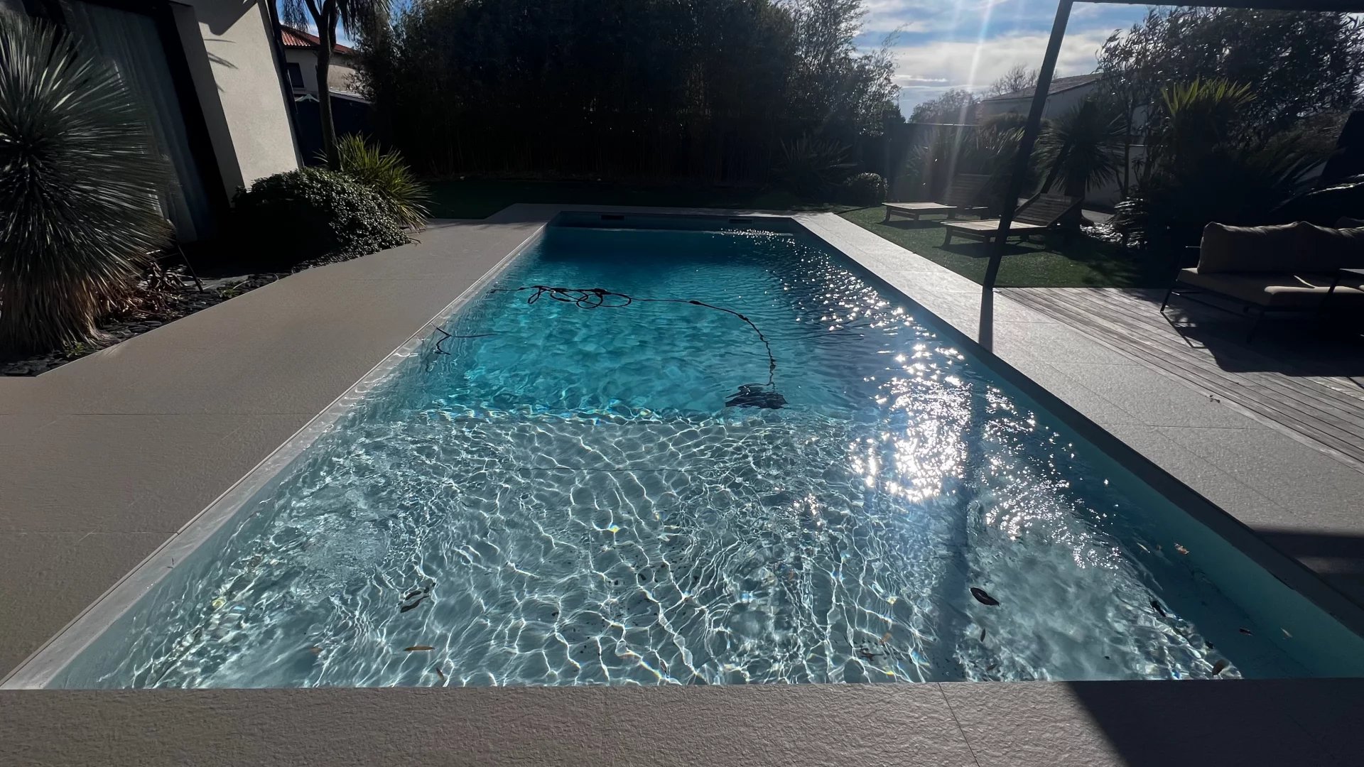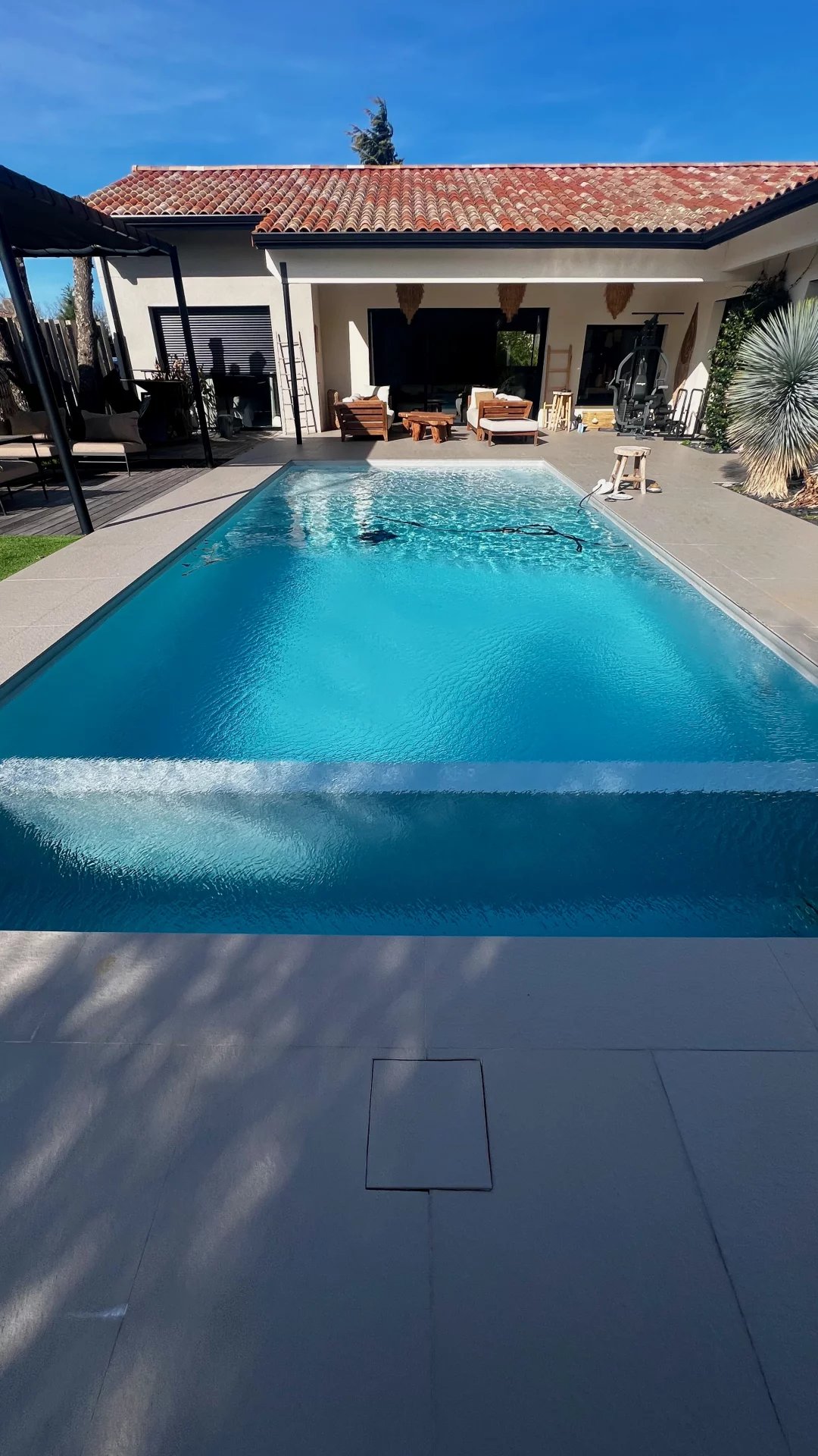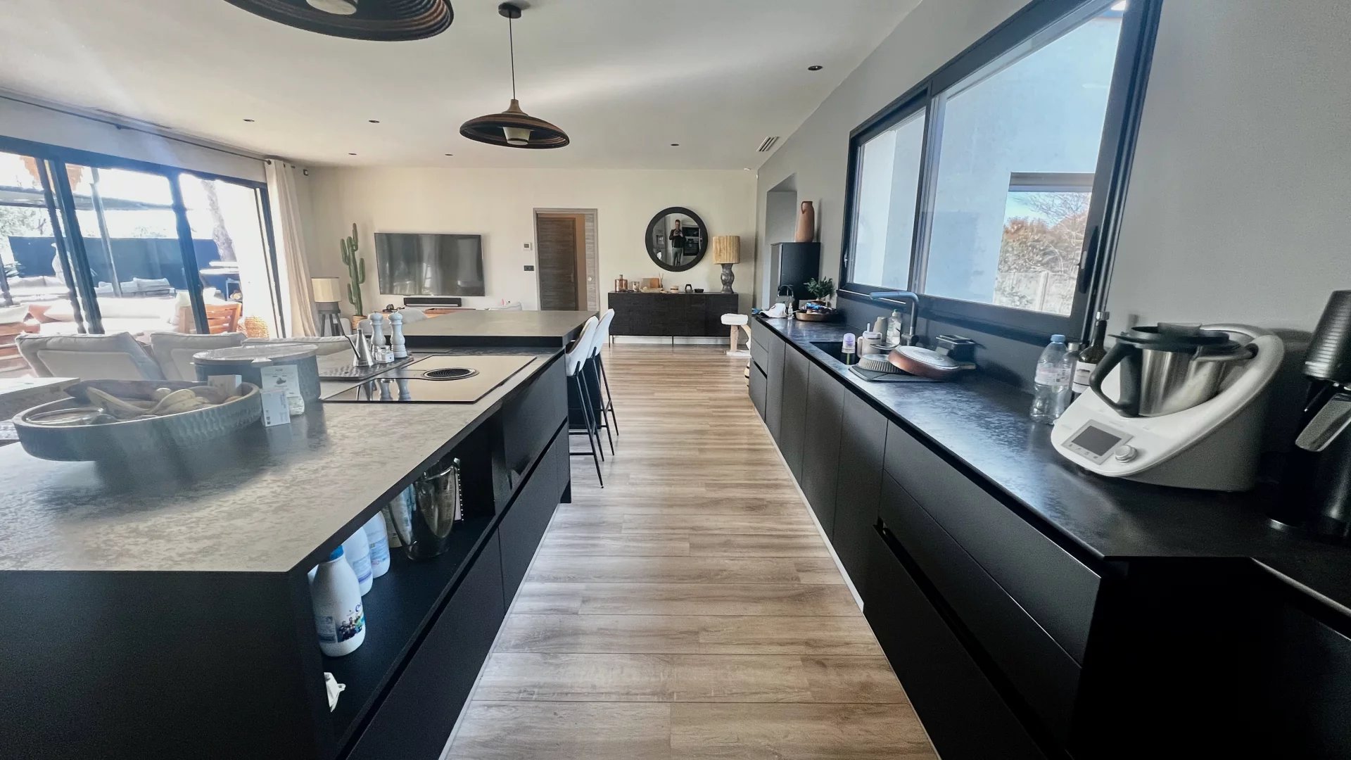 Idéalement située dans une impasse au calme, cette maison contemporaine allie élégance et confort moderne. Espaces de vie généreux : Pièce de vie lumineuse de 60 m² avec cuisine ouverte entièrement équipée Salon indépendant de 25 m², parfait pour un espace détente supplémentaire Côté nuit : Suite parentale avec dressing et salle d'eau Deux chambres avec salle de bain commune Suite de convivialité avec salle d'eau et toilettes privatives Prestations haut de gamme : Chauffage au sol & climatisation Système de sonorisation intégré Volets roulants électriques Grande buanderie fonctionnelle Extérieur soigné : Jardin paysagé sans entretien Piscine chauffée Vaste terrasse carrelée avec éclairage d'ambiance