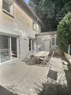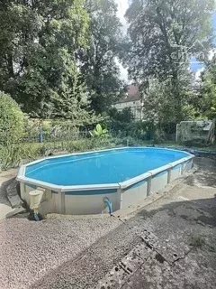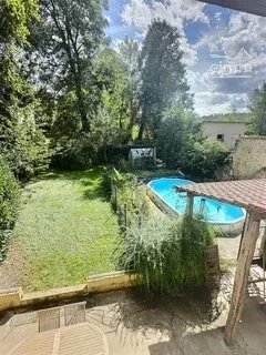 Grand garage avec porte sectionnelle motorisée, jardin clos de mur arboré et sa piscine semi enterrée. Une partie de la terrasse est couverte.