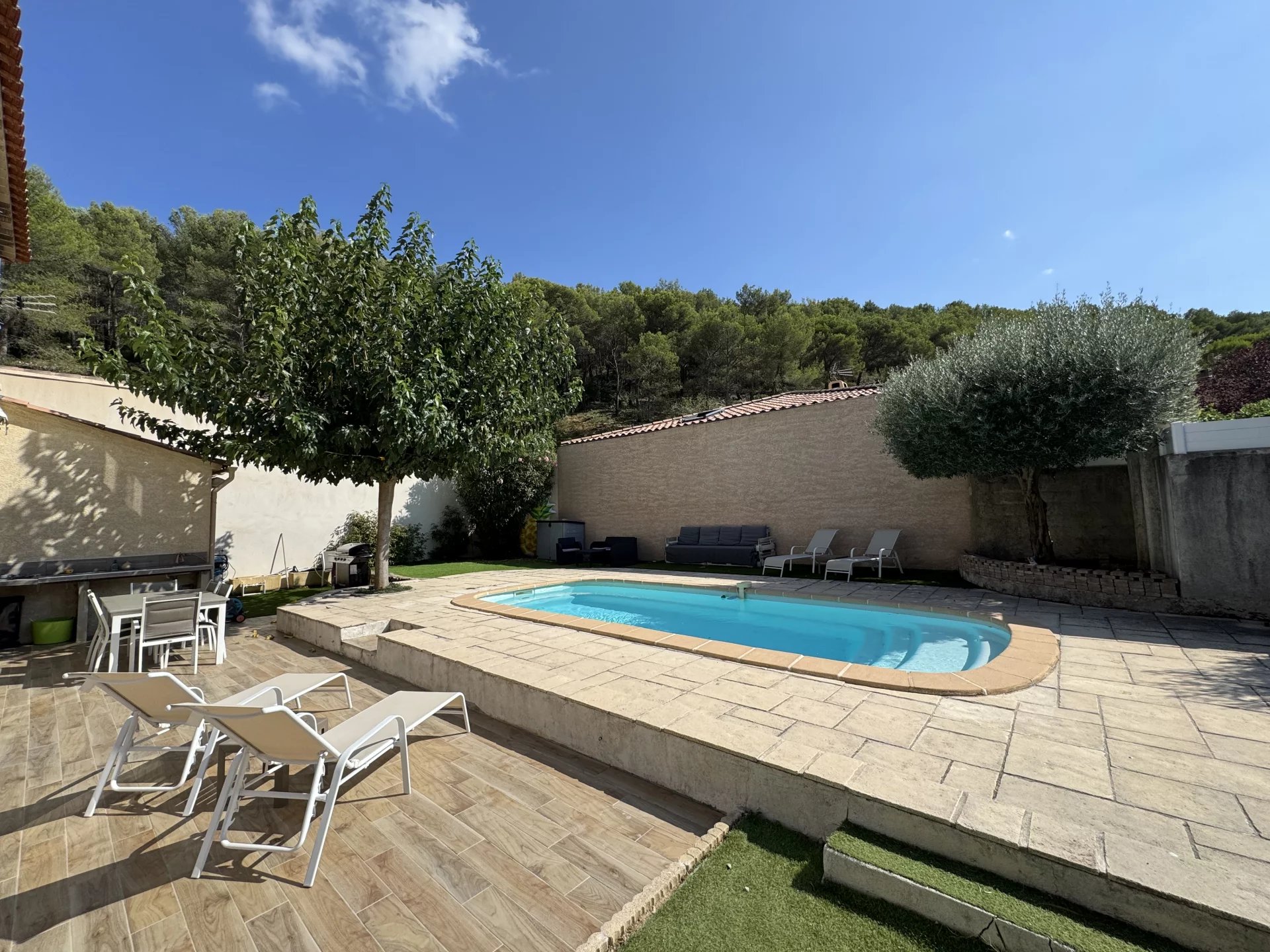 RARE À LA VENTE À CARNOUX-EN-PROVENCE BPimmobilier vous propose à la vente, située dans un environnement privilégié au calme absolu, cette villa construite en 2004 de 130 m2, offrant un cadre de vie idéal à Carnoux-en-Provence, charmante commune des Bouches-du-Rhône réputée pour sa qualité de vie, sa proximité immédiate des calanques de Cassis et son accès direct à Marseille et Aubagne. La maison séduit par son vaste séjour de 40m2 avec cuisine entièrement équipée et ouverte de 10m2, baigné de lumière grâce à de belles ouvertures orientées plein sud. La pièce de vie s’ouvre sur une belle terrasse et un terrain de 500 m2 agrémenté d’une piscine 8x3, parfait pour profiter des beaux jours en famille ou entre amis. Également présents à ce niveau, un WC indépendant, ainsi qu’une buanderie et un garage actuellement aménagé, pouvant accueillir une quatrième chambre, un studio, un bureau, une salle de sport ou tout autre espace selon vos envies, ou bien possibilité de le réouvrir afin d’y stationner un véhicule. À l’étage, elle dispose de trois chambres confortables d’environ 11m2 chacune, dont une avec dressing, ainsi que d’une salle d’eau avec WC. La maison bénéficie de nombreux stationnements avec deux à trois places sur la parcelle ainsi que deux places privatives à l’extérieur. Le confort est garanti toute l’année grâce à la climatisation réversible présente dans toutes les pièces. Très saine et parfaitement entretenue, cette villa combine espace, luminosité et praticité dans un cadre naturel préservé avec un accès direct à la colline. Un bien rare sur le secteur, offrant calme et qualité de vie tout en restant à proximité des commodités et des axes routiers. Ne manquez pas l'opportunité de visiter ce bien ! Avec Brigitte : O685864747 brigitte.bpimmo@gmail.com Taxe foncière : 1539€/an. Prix de vente : 680 000 € Honoraires à la charge du vendeur. Classe énergie C, classe climat A. Les informations sur les risques auxquels ce bien est exposé sont disponibles sur le site Géorisques : www.georisques.gouv.fr Ce bien vous est proposé par un agent commercial BP Immobilier 39, rue Sainte Victoire 13006 MARSEILLE / Capital social 1000€ / 410 928 956 R.C.S Marseille / n°TVA FR09410928956 : Brigitte Bourin au O6.85.86.47.47 - EI immatriculé au RSAC de Marseille sous le numéro 402 052 252.