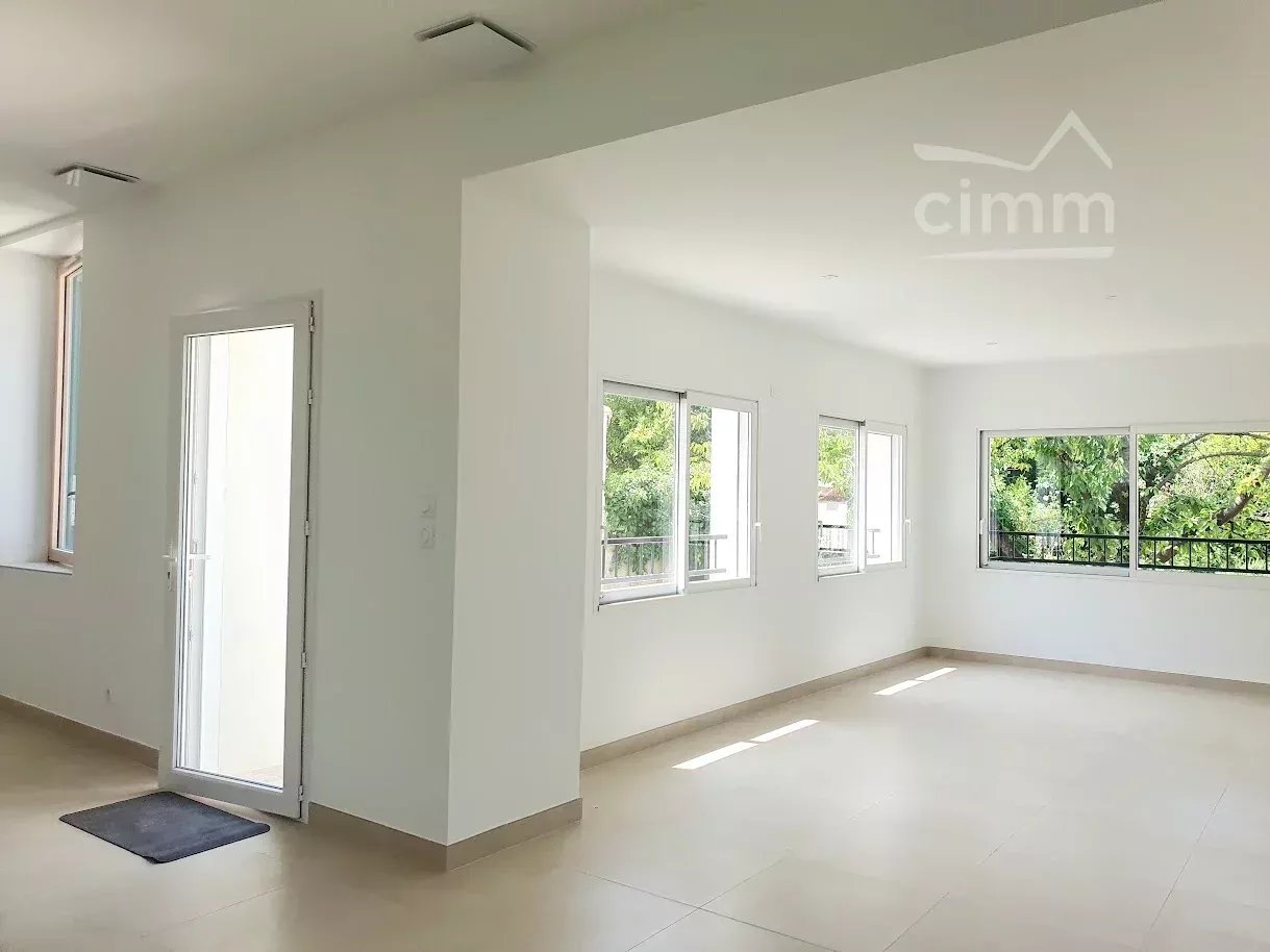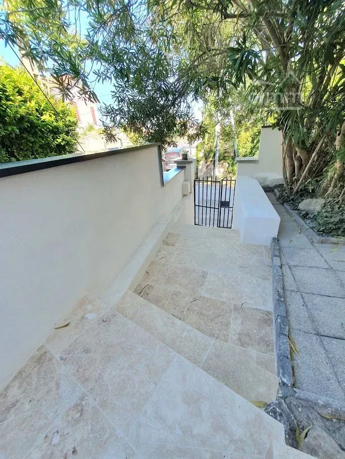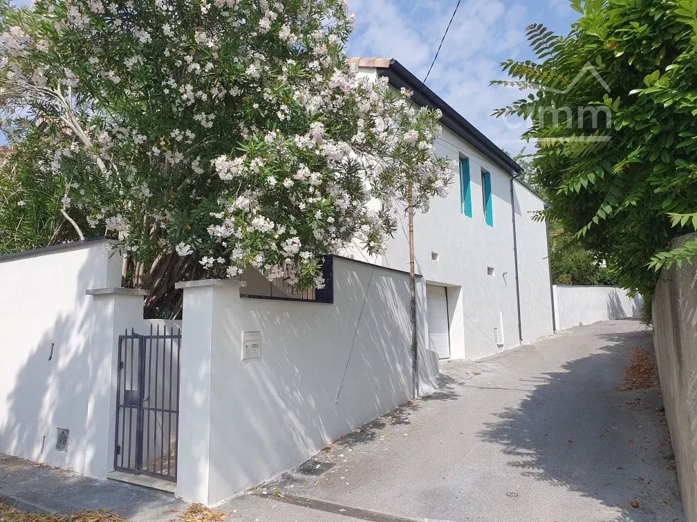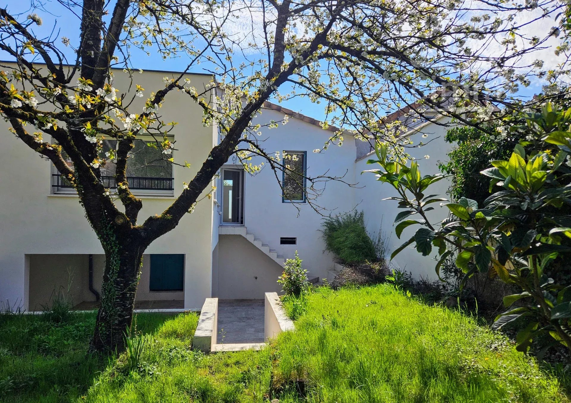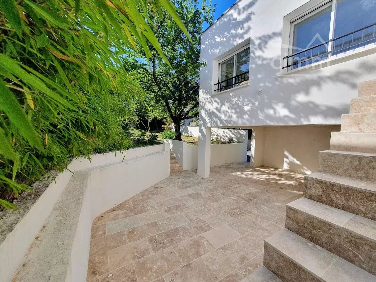 L’extérieur s’ouvre sur une terrasse en travertin, un espace couvert de 23 m² (aisément aménageable en cuisine d’été voire studio indépendant), et un jardin clôturé, agrémenté de nombreuses essences et fruitiers, le tout édifié sur une parcelle de 417 m² piscinable.