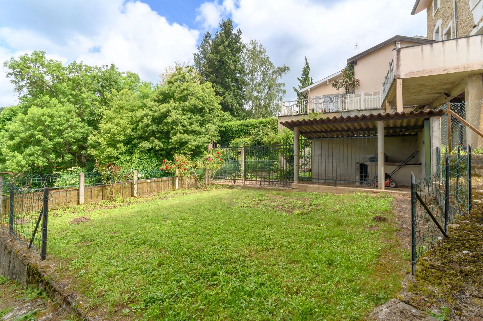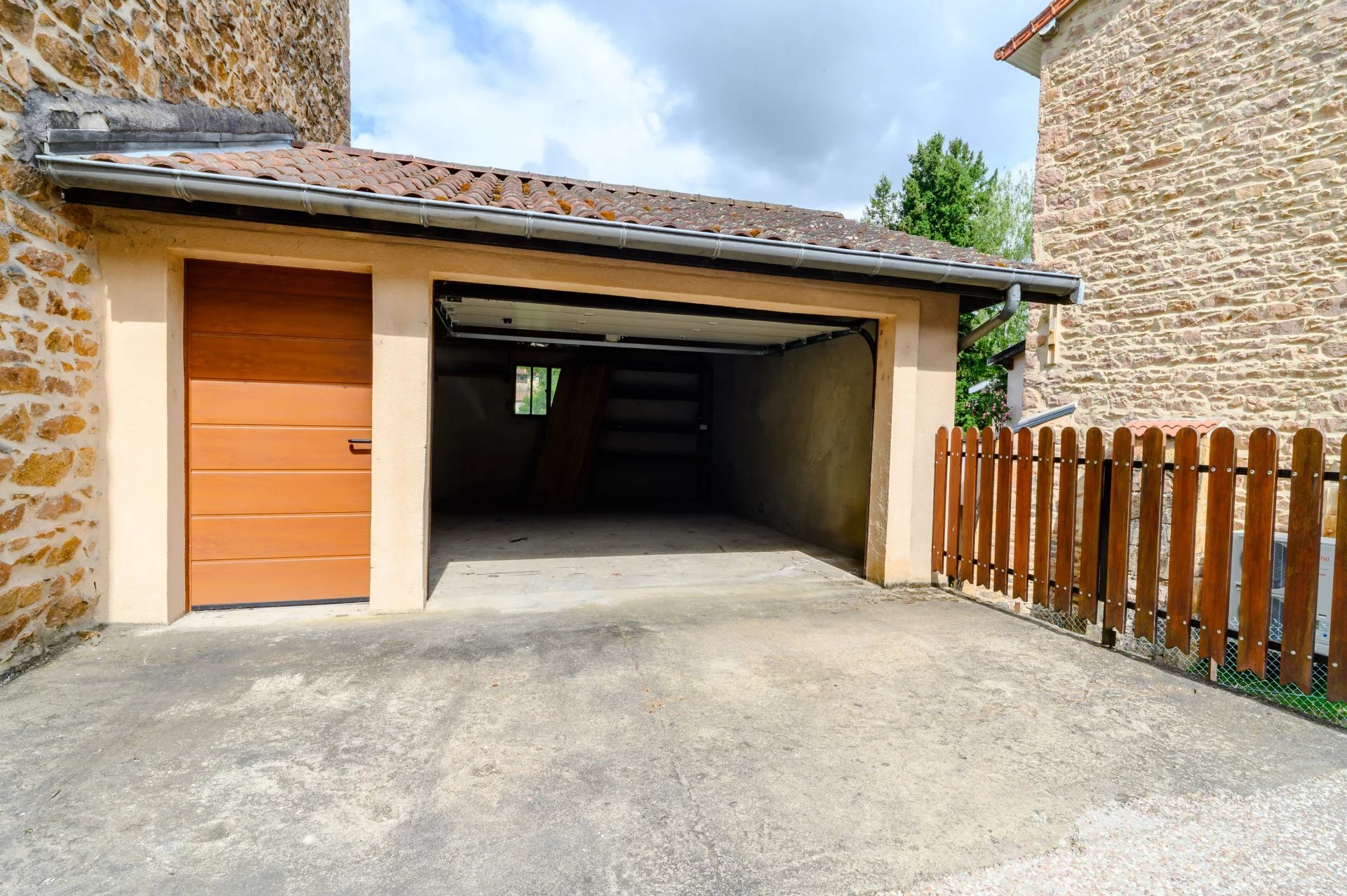 Une vaste terrasse bien exposée ainsi qu'un garage fermé avec portail motorisé pouvant contenir un ou deux véhicules et une place devant le garage. Il y à également plusieure caves sous la maison. Un terrain privatif descendant jusqu’à la rivière, un véritable havre de paix