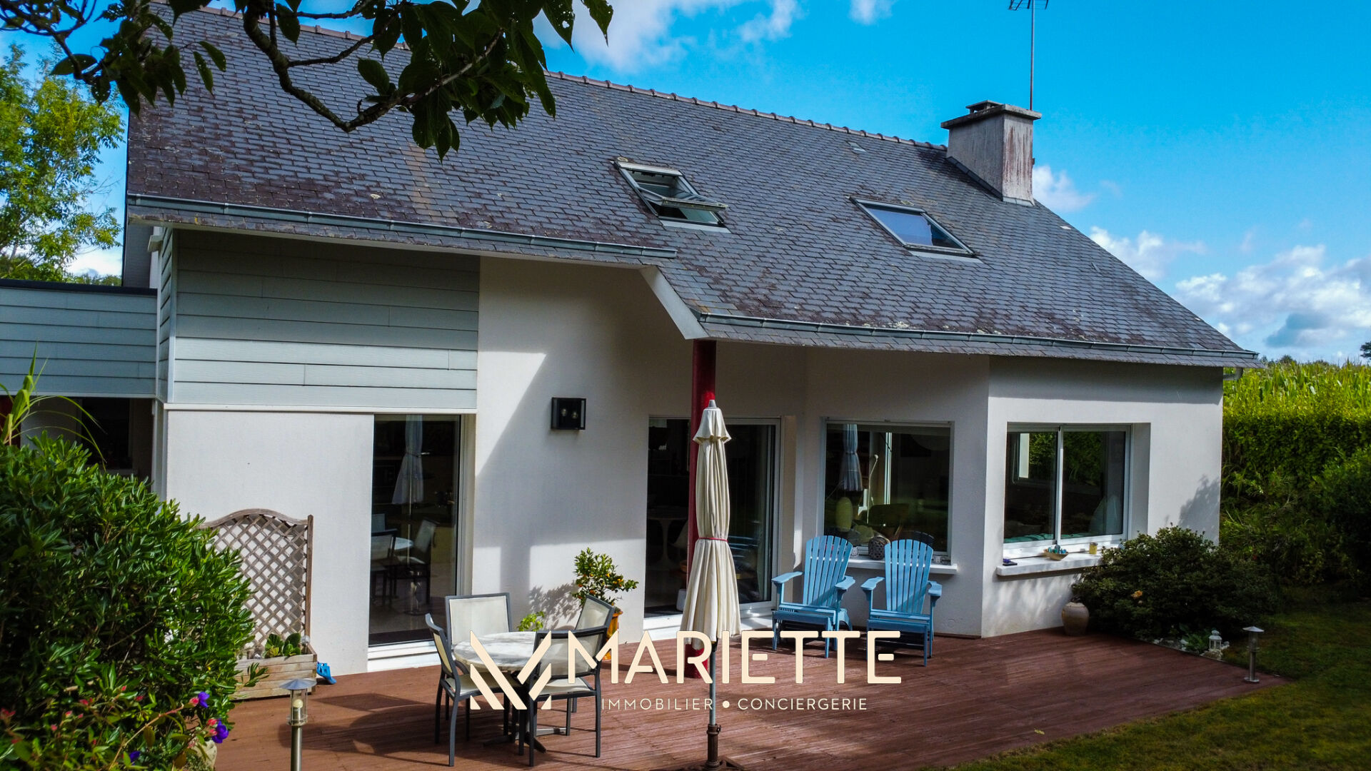 "ANEMONE" Est cette maison sans travaux bâtie en 2004. Installée dans un écrin de verdure, avec pour voisins un environnement discret et un champ en conversion bio, elle allie calme et sérénité. Son jardin paysager, riche en variétés d'arbres et de fleurs, saura séduire les amoureux de nature et de grands espaces. Idéalement située entre mer et campagne, cette maison bénéficie aussi de toutes les commodités : écoles, commerces et services sont accessibles en quelques minutes. Un cadre de vie rare, où confort moderne et douceur de vivre se rencontrent. La distribution : Au rez-de-jardin, Entrée, cuisine aménagée et équipée, salon de détente avec poêle, salon-séjour donnant sur la terrasse, WC séparé, garage. Au 1er étage, palier, trois chambres, salle de bains, WC. Ce que l'on aime : L'ouvrage récent, la qualité des matériaux, la luminosité, les vues sur la nature, les nombreuses ouvertures, le poêle à bois, la distribution des pièces, le calme, la proximité immédiate du bourg, la terrasse. Points d'intérêts : A 1.5 KM des commerces et école de Gouesnarch A 9 KM de Quimper et ses commerces (12 min en voiture) A 7 KM de Bénodet (10 min en voiture) A 1.6 KM du bord de l'Odet (activités nautiques) Plus d'informations sur notre site www.mariette-immobilier-conciergerie.com et sur les réseaux sociaux Mariette Immobilier Conciergerie soutient la SNSM de Trévignon - Concarneau en leur reversant 1 % de chaque commission d'agence, afin de contribuer à leurs actions de prévention et de sauvetage en mer. (3.94 % honoraires TTC à la charge de l'acquéreur.)