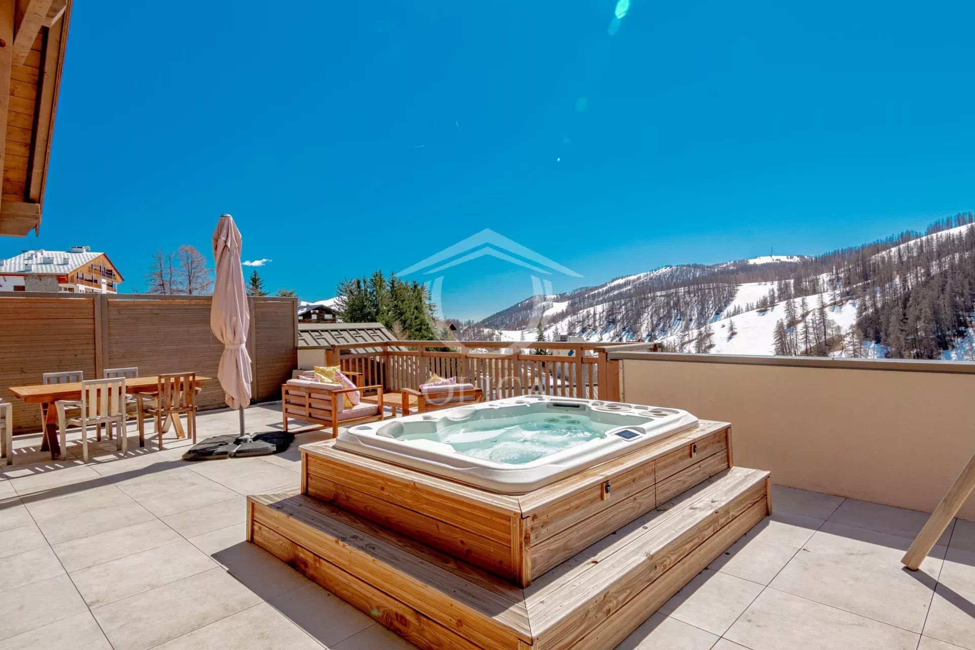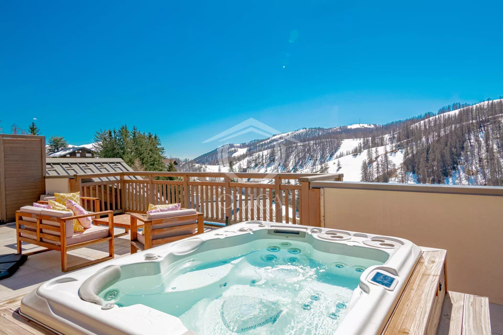 Pour un confort absolu, cet appartement dispose de deux garages fermés, de deux casiers à skis, ainsi que d’un jacuzzi privatif. Les finitions sont raffinées avec des matériaux de grande qualité, une cheminée premium et une baignoire thalasso Villeroy.