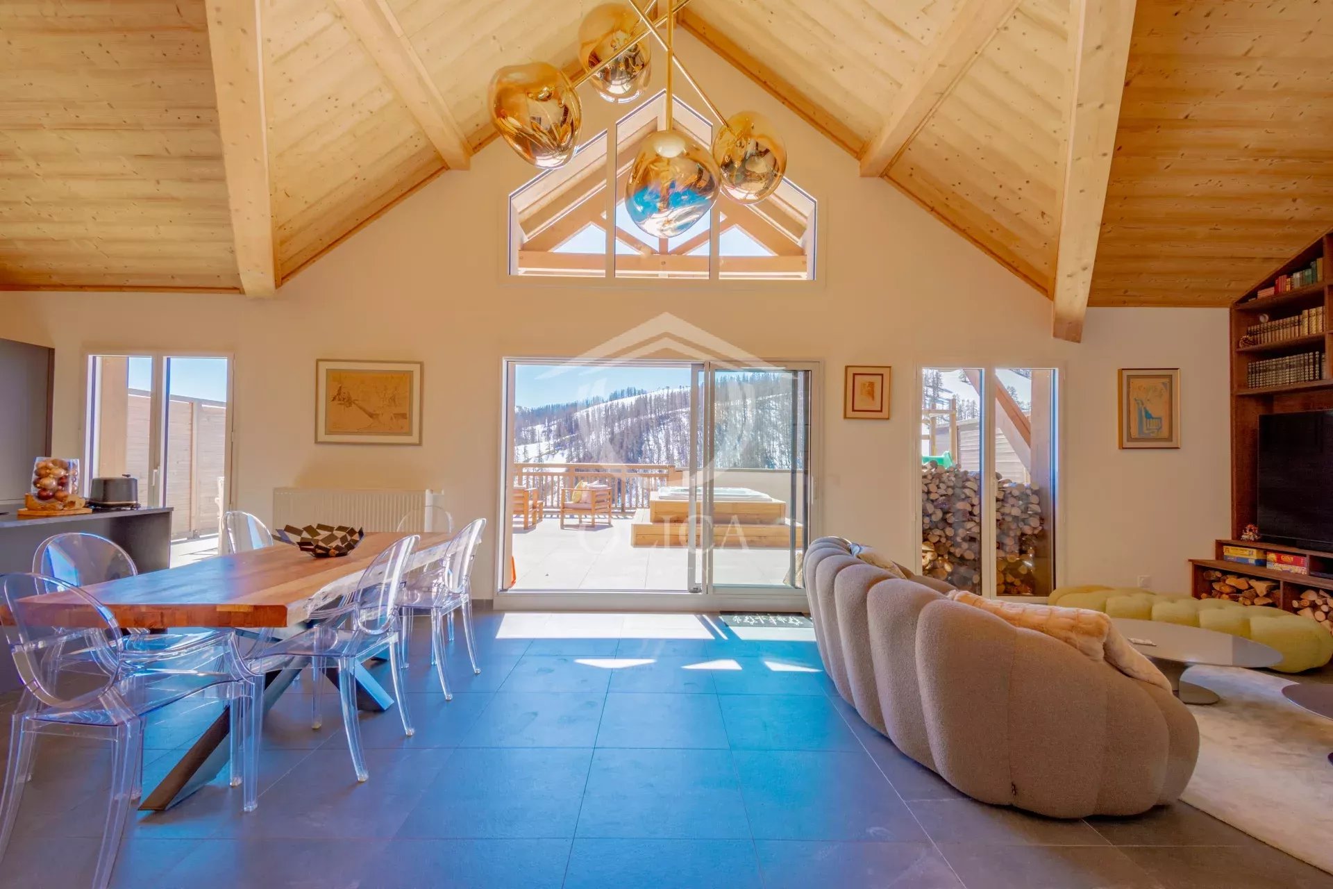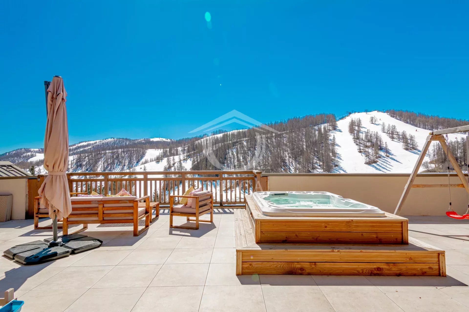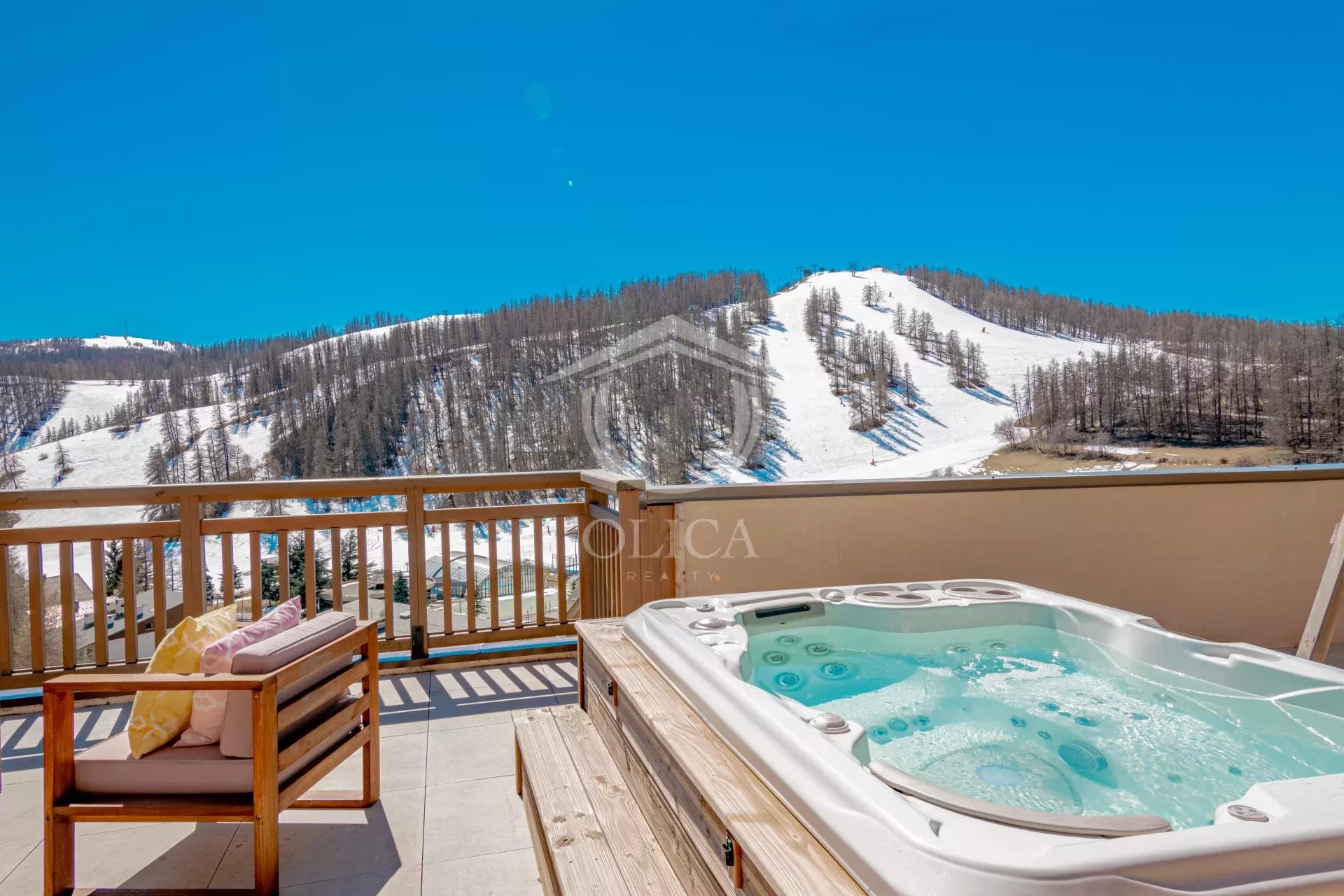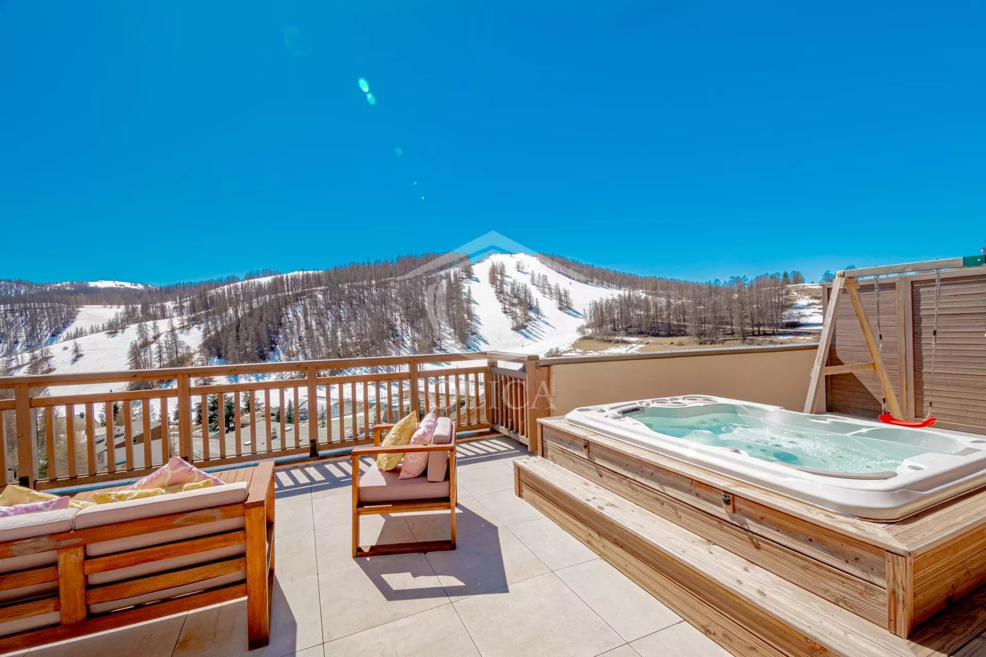 Situé au cœur de Valberg, cet appartement d'exception de 108 m², initialement un 5 pièces transformé en 4 pièces, offre un cadre de vie unique avec une superbe terrasse de 73 m² surplombant les pistes de ski.