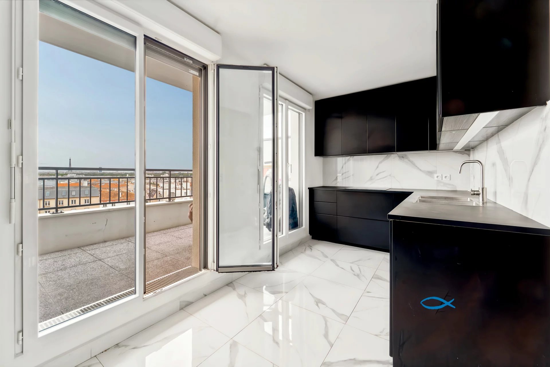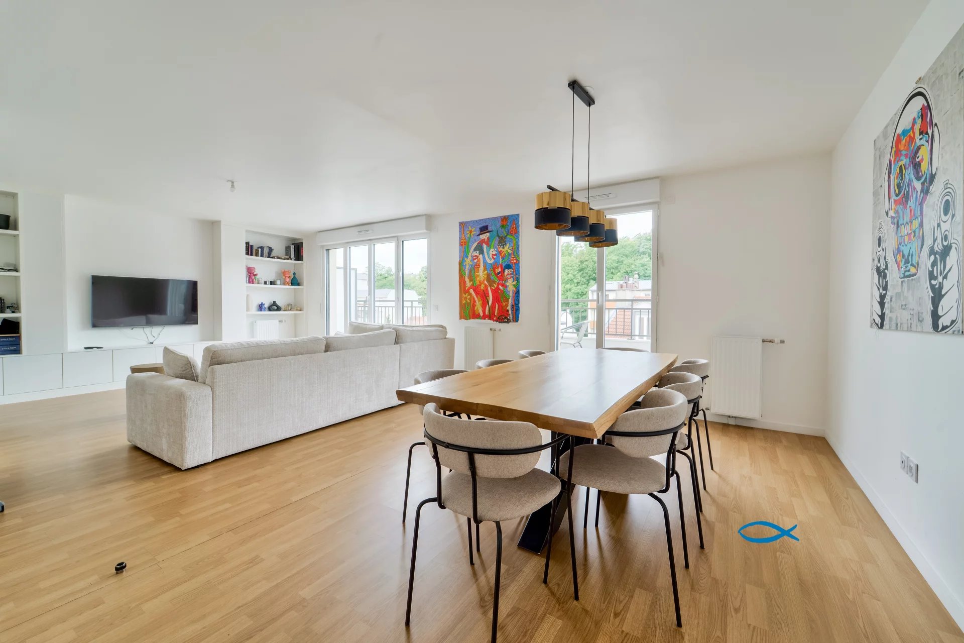 À Puteaux, Rue Victor Hugo dans un bel immeuble récent de 2021, aux normes PMR avec ASCENSEUR, au 5ème étage, nous avons le plaisir de vous présenter ce magnifique appartement de 110m2 Loi Carrez, TRAVERSANT et LUMINEUX, qui se compose comme suit: une entrée, un double salon - salle à manger avec terrasse de 15m2 SANS VIS-À-VIS, une cuisine séparée, aménagée et équipée ouvrant sur une seconde terrasse de 25m2 avec VUE TOUR EIFFEL à couper le souffle, toujours SANS VIS-À-VIS, 3 chambres, une salle de bains, une salle d'eau et 2 WC séparés. De nombreux rangements, volets roulants. Chauffage et eau chaude collectif, au gaz dernière norme. Exposition ÈST-OUEST. Une place de parking au sous-sol. DPE: D&D Charges: 380€/mois Bien soumis au statut de la copropriété, pas de procédure en cours. Les informations sur les risques auxquels ce bien est exposé sont disponibles sur le site Géorisques : www.georisques.gouv.fr