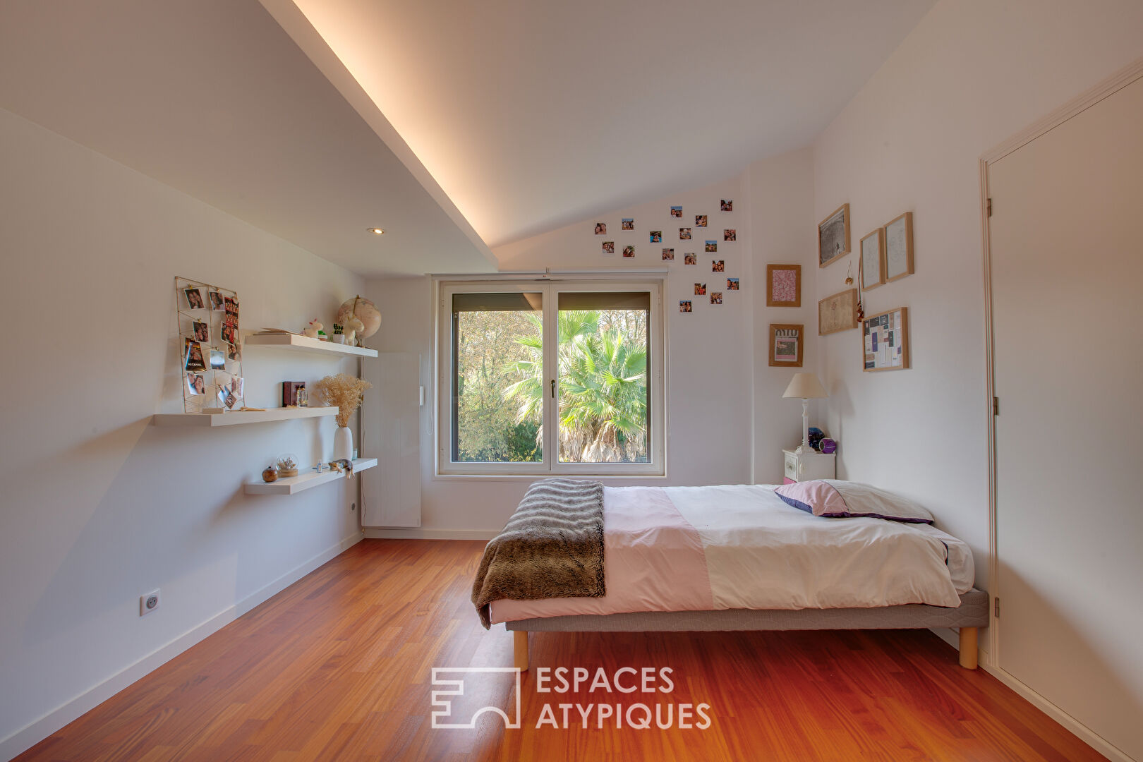 Située à Saint Vincent de Paul, cette maison d'architecte de 175 m² séduit par son allure contemporaine et son cadre verdoyant. Édifiée sur un terrain de 1201 m², elle propose des espaces généreux et lumineux répartis sur deux niveaux, offrant un parfait équilibre entre modernité et sérénité. Ce bien comprend quatre chambres et des dépendances, idéal pour une famille en quête de confort et de calme à proximité des commodités. L'intérieur se distingue par des volumes bien pensés et des finitions soignées. Dès l'entrée, la lumière naturelle s'invite grâce aux larges baies vitrées, créant une harmonie parfaite entre les espaces de vie et la nature environnante. Le salon, très convivial, se prolonge par une cuisine ouverte aux lignes épurées, idéale pour les moments de partage. Les quatre chambres offrent chacune un espace intimiste, dont une suite parentale qui conjugue élégance et fonctionnalité. Les prestations sont en excellent état, reflétant une attention particulière portée aux matériaux. A l'extérieur, le jardin arboré, ponctué de palmiers et d'essences méditerranéennes, confère au lieu une atmosphère paisible. La terrasse, propice à la détente, se prête parfaitement aux belles journées ensoleillées. La dépendance offre un potentiel d'aménagement supplémentaire, permettant d'imaginer un atelier d'artiste, un espace dédié aux loisirs ou encore une activité libérale. La maison est idéalement implantée tout en offrant une véritable bulle de tranquillité. Dotée d'une performance énergétique en classe B, cette propriété allie confort moderne, architecture soignée et cadre naturel exceptionnel. Une opportunité idéale pour les amateurs de biens atypiques alliant esthétisme et qualité de vie. CLASSE ENERGIE : C / CLASSE CLIMAT : A Prix moyens des énergies indexés sur les années 2021, 2022 et 2023 (abonnements compris) : entre 1739 et 2353 euros/an. Contact Stéphan DE VALK au 06 33 03 98 65 RSAC n° 533 152 955 Dax Stéphan DE VALK (EI) Agent Commercial - Numéro RSAC : 533 152 955 - DAX.