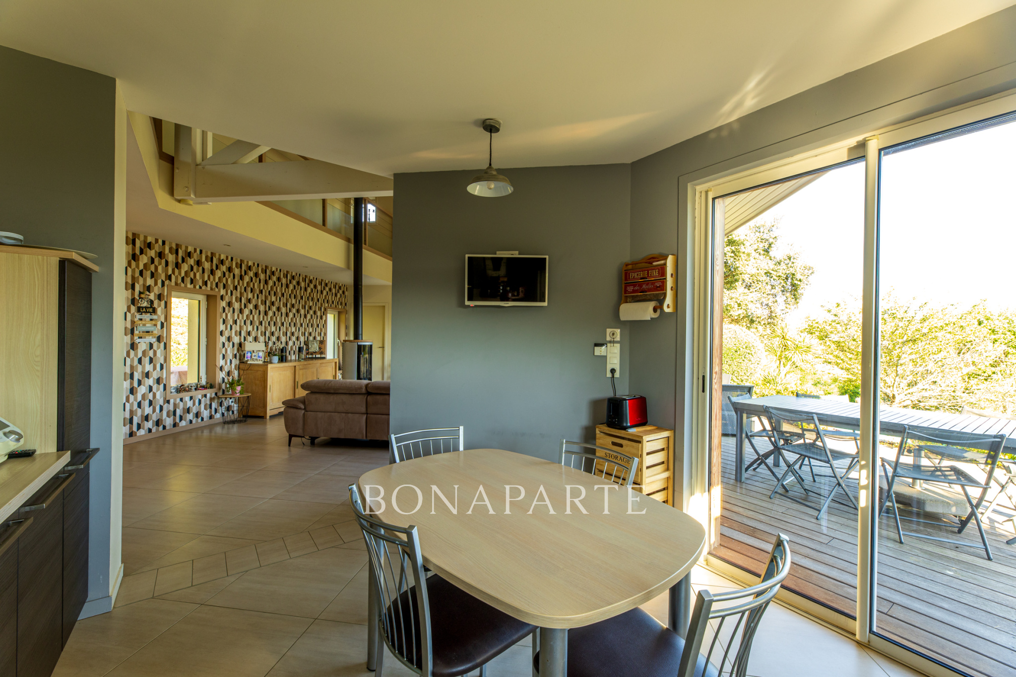 Dès l'entrée, une vaste pièce de vie séduit par son plafond cathédrale et ses larges baies vitrées, inondant l'espace de lumière. Elle s'ouvre sur une terrasse avec piscine, offrant un décor unique face aux montagnes. Le séjour ainsi que la suite parentale bénéficient d'un panorama exceptionnel sur la chaîne des Pyrénées, tandis qu'une mezzanine ouverte sur le salon crée un espace modulable : lecture, jeux ou home-office selon vos envies.