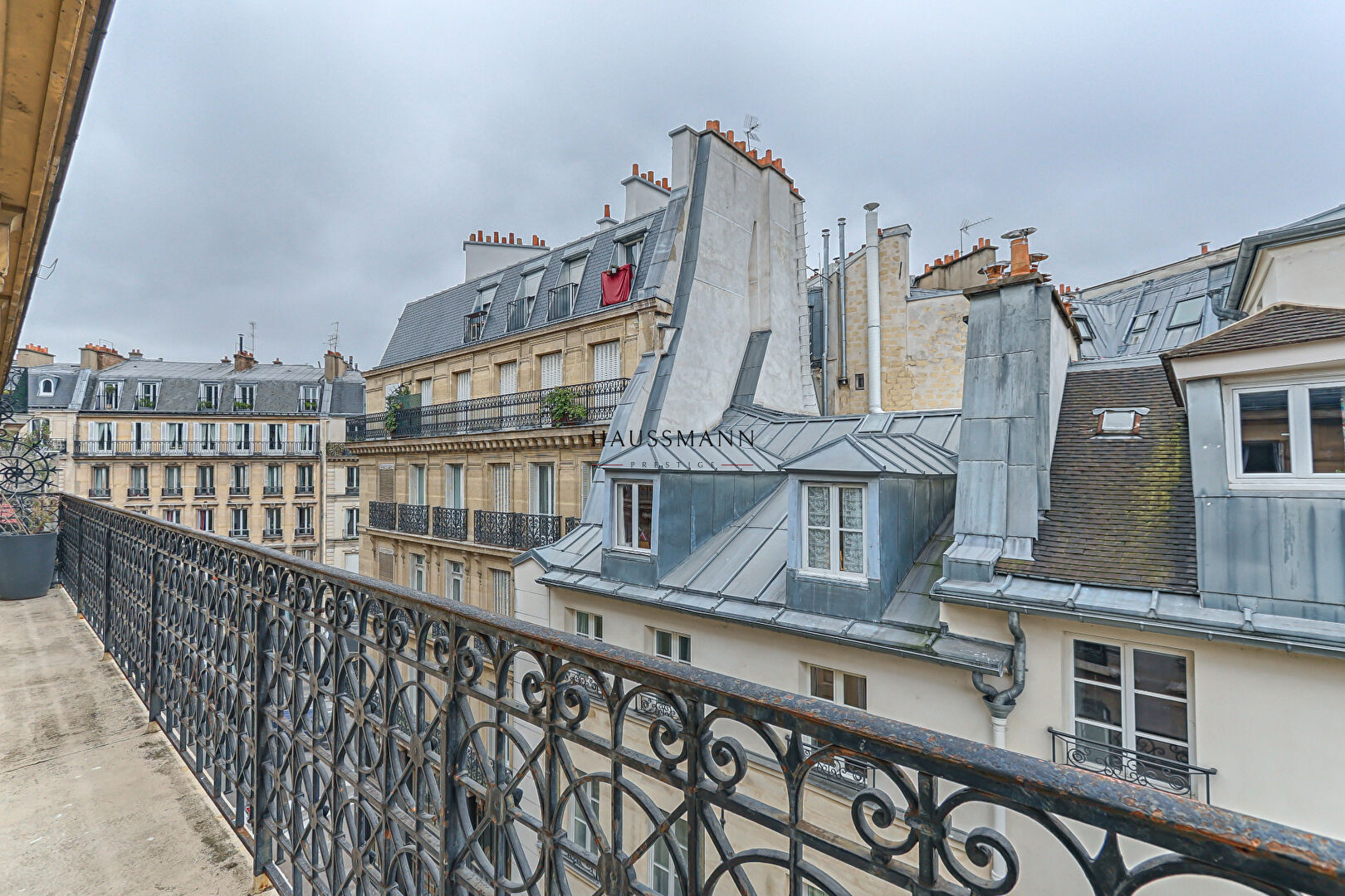 Saint Germain des pres, Au cinquième étage sans ascenseur d'un immeuble haussmannien de standing de 1800, charmant appartement quatre pièces de 80 m2 Meublé entièrement rénové composé d'une entrée, d'un grand séjour avec cuisine ouverte et équipée, exposé plein sud, le tout donnant sur un large balcon filant, deux chambres, une salle d'eau avec toilette et un dégagement avec de nombreux rangements. L'appartement aux éléments anciens conservés : parquets points de hongrie, moulur