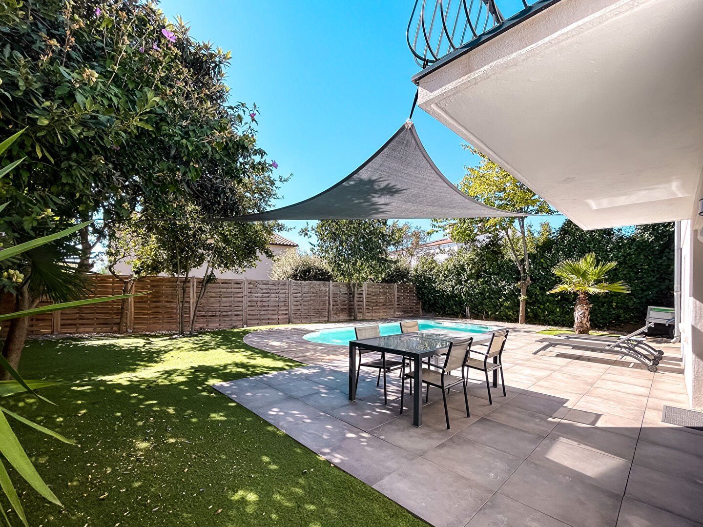 Villa des années 70' entièrement rénovée avec vie à l'étage, offrant 6 pièces, environ 159m2 habitables et 236m2 utiles. Bâtie sur une parcelle de 475m2 avec piscine. Possible appartement indépendant. Au rez-de-chaussée, entrée directe dans l'espace de vie de 60m2 avec cuisine équipée, salle à manger et salon avec cheminée insert et donnant sur un large balcon et une grande terrasse dominant la piscine et le jardin. A la suite, 2 chambres de 9m2 et 14m2, un wc et une belle salle de douche. Dans les combles aménagés sous pentes, une belle suite climatisée de 29m2 au sol et 9,10m2 habitables, comprenant dressing et coin couchage avec baignoire îlot. Au rez-de-jardin, un ensemble de 3 pièces pouvant satisfaire un projet d'appartement indépendant d'environ 60m2 (T2 bis) ou les besoins d'une famille nombreuse avec une 4ème et 5ème chambre + bureau et une salle de douche avec wc. Également à ce niveau, plusieurs caves pour le stockage , une cave à vin et un accès direct au jardin pour l'hivernage des vélos et du mobilier de jardin. A l'extérieur, autour des 3 faces de la maison, un petit jardin minéral avec plusieurs beaux oliviers sur l'avant et le portail donnant sur une allée permettant de stationnement jusqu'à 3 véhicules en enfilade. A l'arrière, une piscine 8x4m et sa belle plage en bois et dallage ainsi qu'une grande terrasse et de beaux espaces en gazon synthétique. Maison en parfait état technique et à la décoration soignée. Situation calme en impasse, à deux pas des écoles, des commerces, du bus et des grands axes. Tramway à 25min à pied. (2.36 % honoraires TTC à la charge de l'acquéreur.)