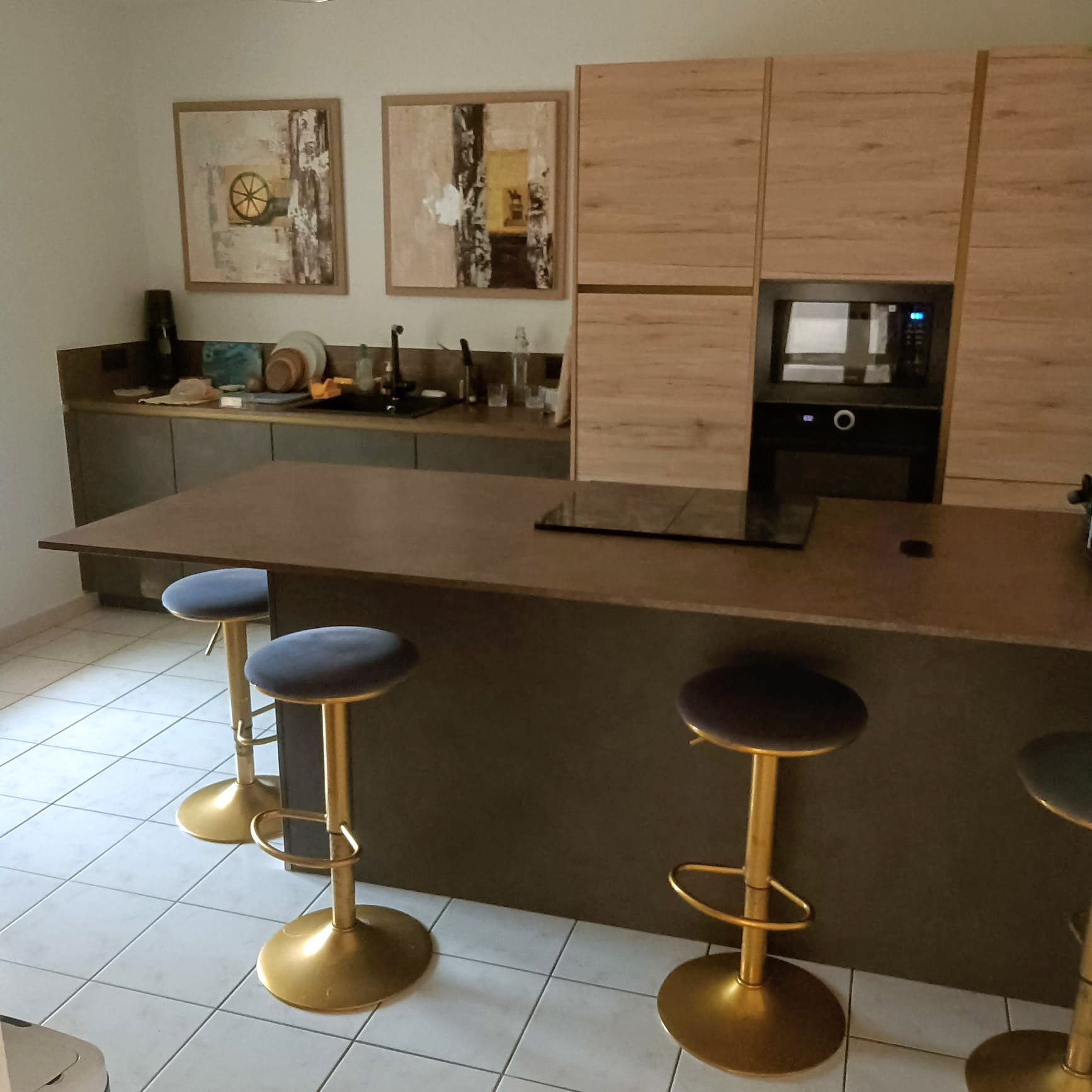 Cuisine 16m2 séparée neuve (janvier 2023), haut de gamme, électroménager intégré dont lave vaisselle en hauteur, four et micro onde en hauteur, frigo-congélateur intégré, plaques induction avec hotte intégrée, nombreux rangements coulissants, îlot snack 4, 5 personnes,