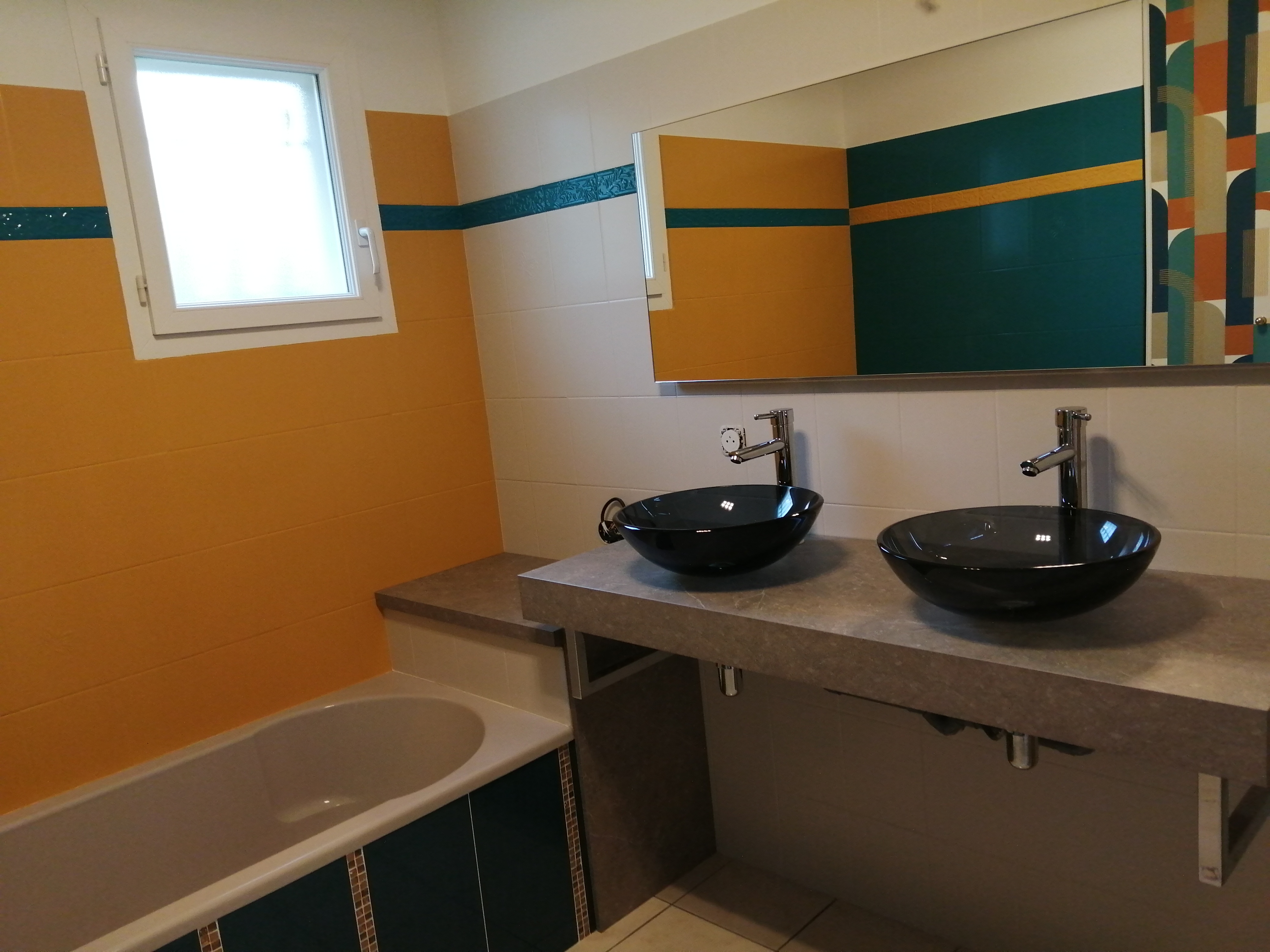grande salle de bain : douche, baignoire, double vasque, placard, sèche serviette soufflant,