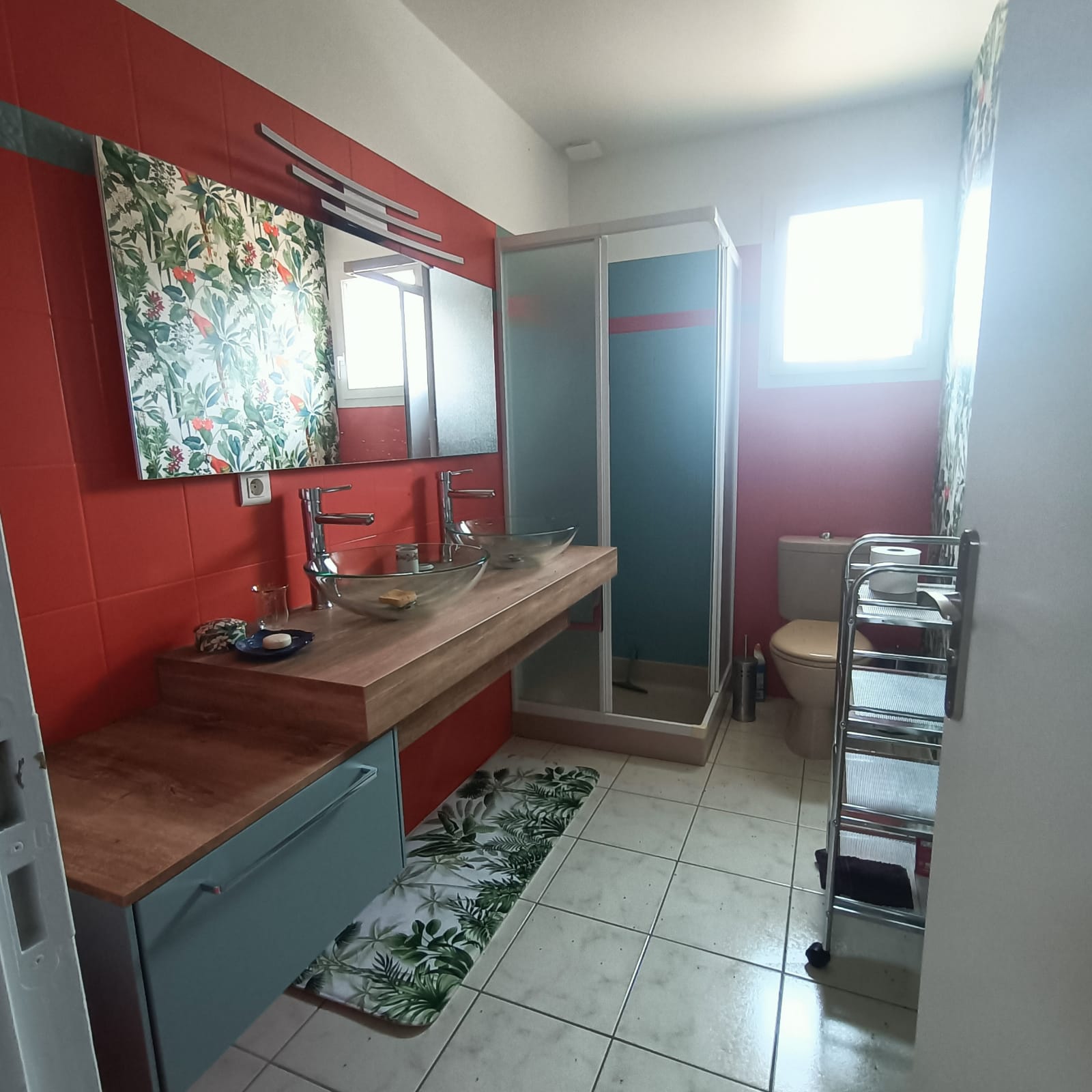 salle d'eau : douche, double vasque, wc, radiateur sèche serviette.
