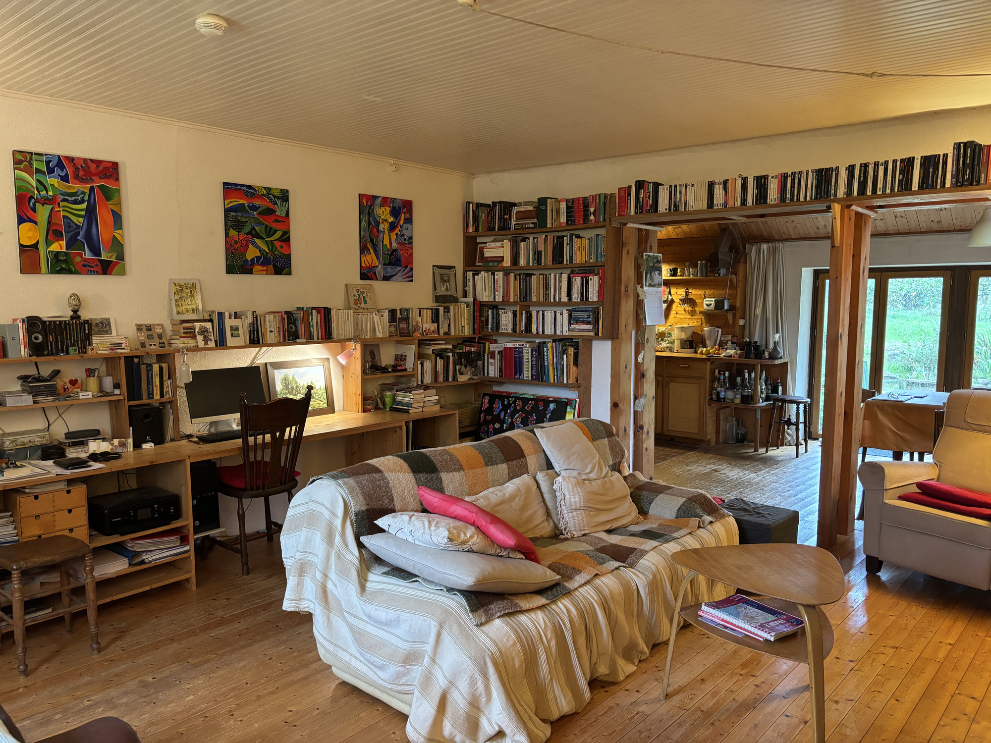 Dans la cuisine, une porte donne accès à une pièce de passage avec un escalier menant à l'étage supérieur avec 3 fenêtres de toit Velux. Cet espace spacieux et ouvert est actuellement composé d'une chambre et d'un espace de travail, mais il serait possible de créer deux pièces indépendantes très spacieuses, dont une avec lavabo, grâce à l'emplacement central de l'escalier. Un espace de rangement supplémentaire a été aménagé derrière un mur. L'ensemble est en grande partie équipé de double vitrage, mais la fosse septique n'est pas conforme aux normes.