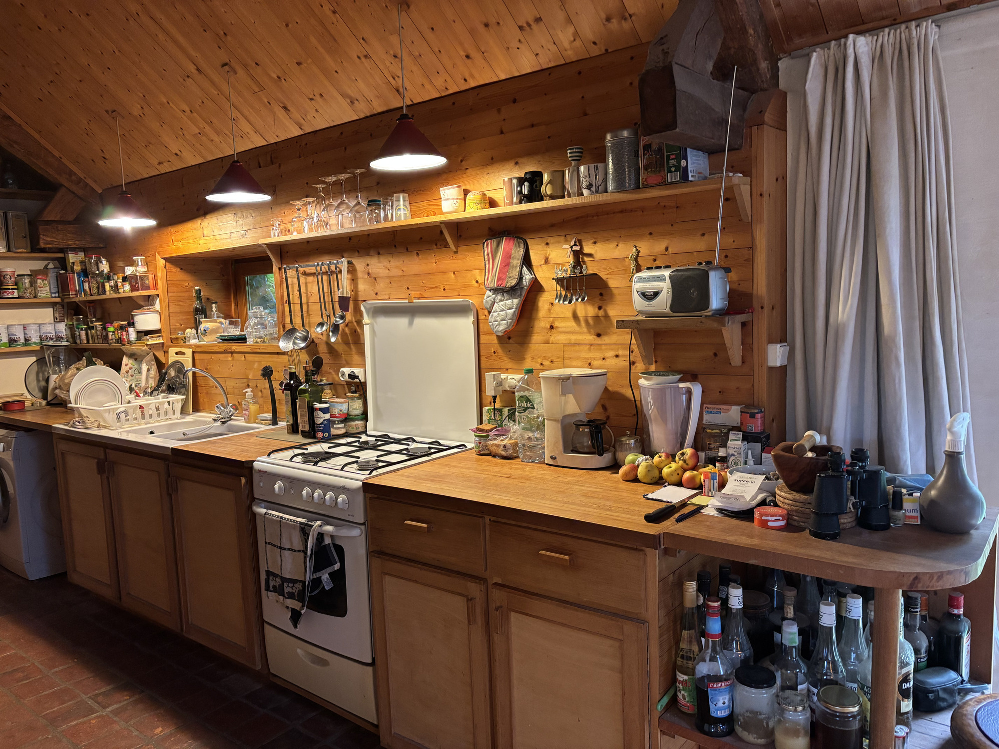 À votre droite, vous entrez dans le salon en forme de L avec coin salon, coin repas qui mène à la cuisine ouverte, également dotée d'un sol en tomettes anciennes. Le salon est chauffé par un poêle à bois et dispose d'un sol en bois qui se prolonge jusqu'au coin repas, entièrement isolé. À côté de la cuisine se trouve la salle de bain avec cabine de douche, toilettes, lavabo et baignoire.