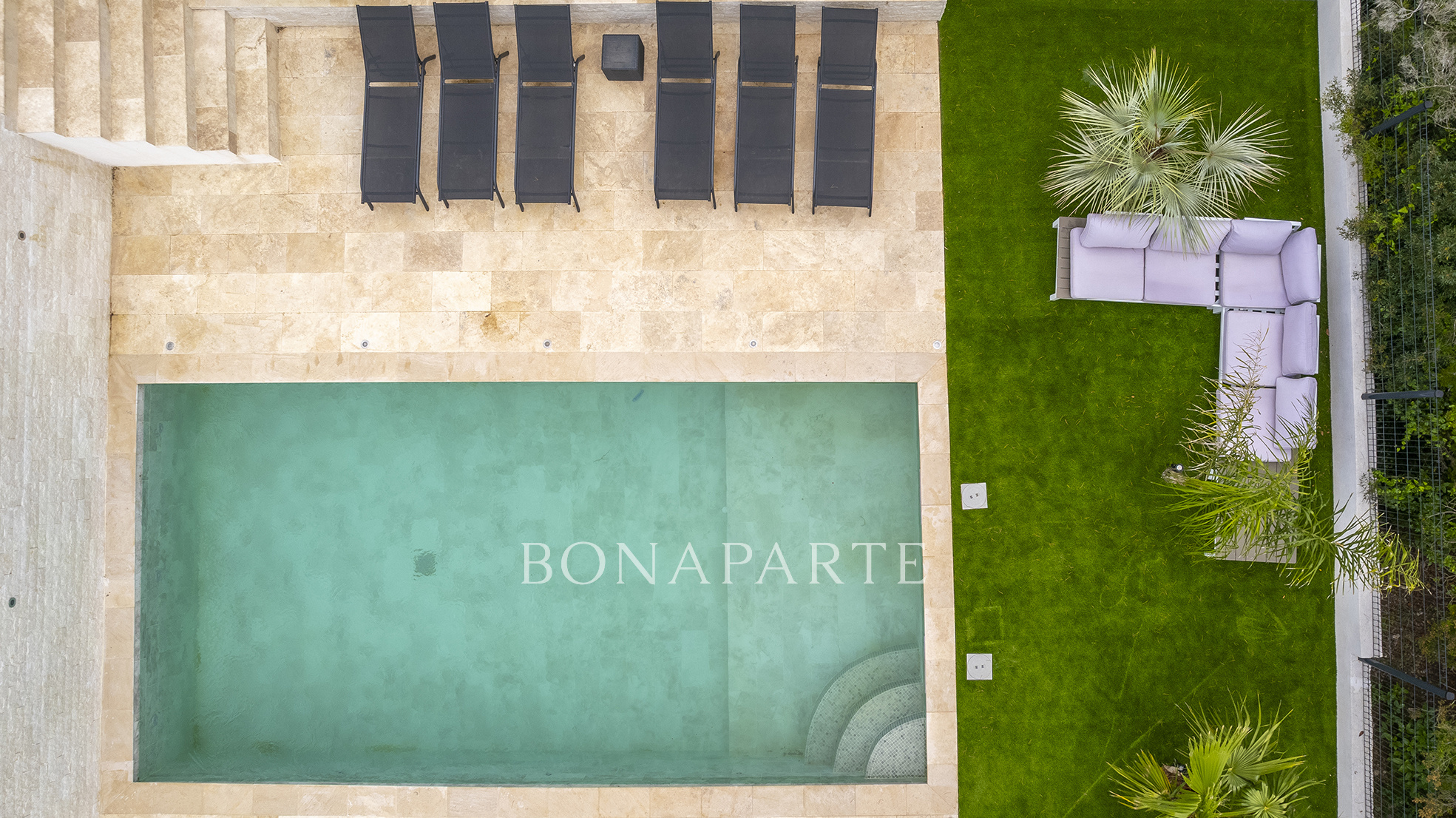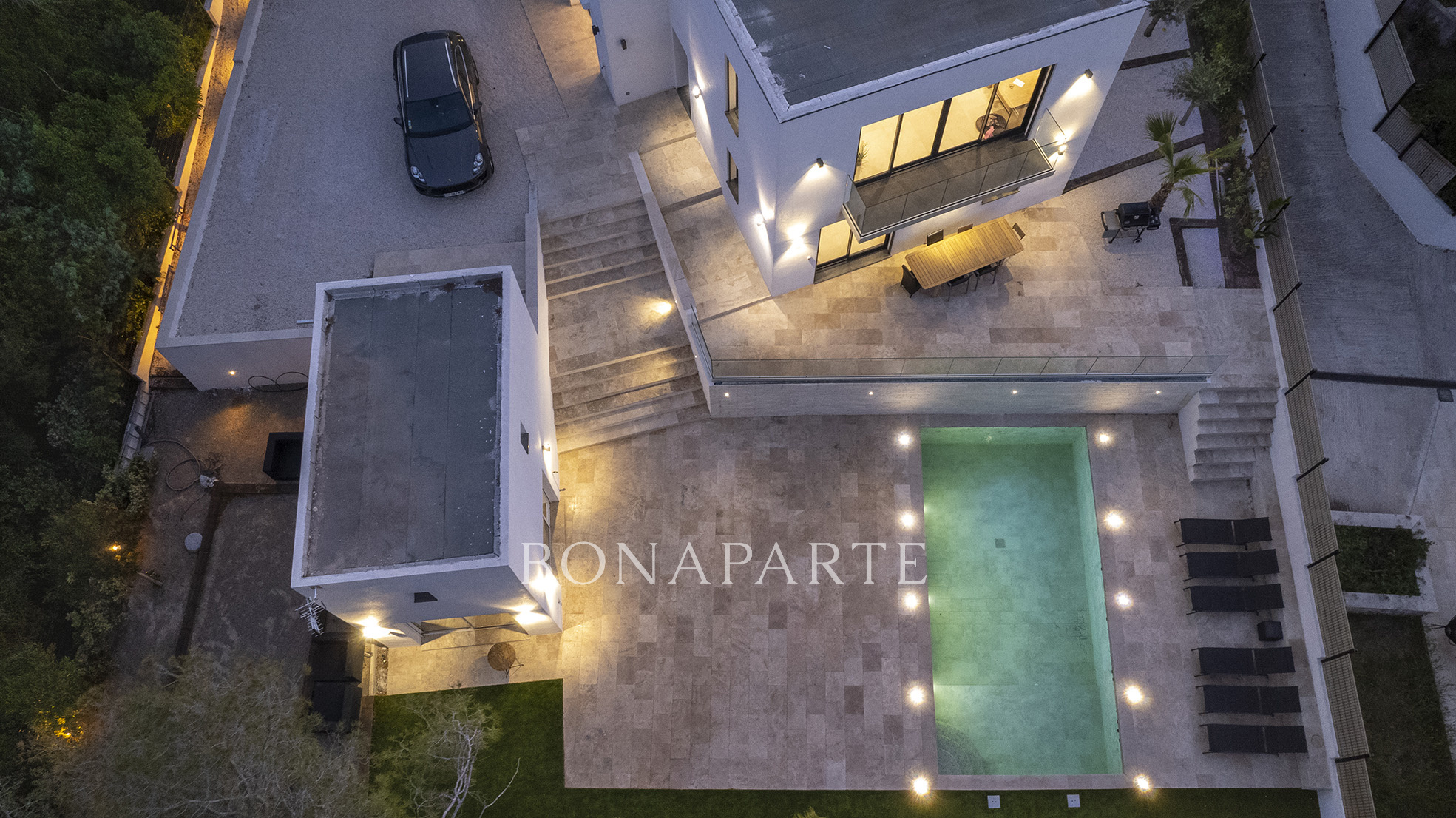 Les prestations sont nombreuses et de qualité : menuiserie aluminium, volets roulants électriques en aluminium, climatisation réversible, radiateurs connectés, garde-corps vitrés, extérieur en travertin, alarme, caméra, portail électrique, etc...