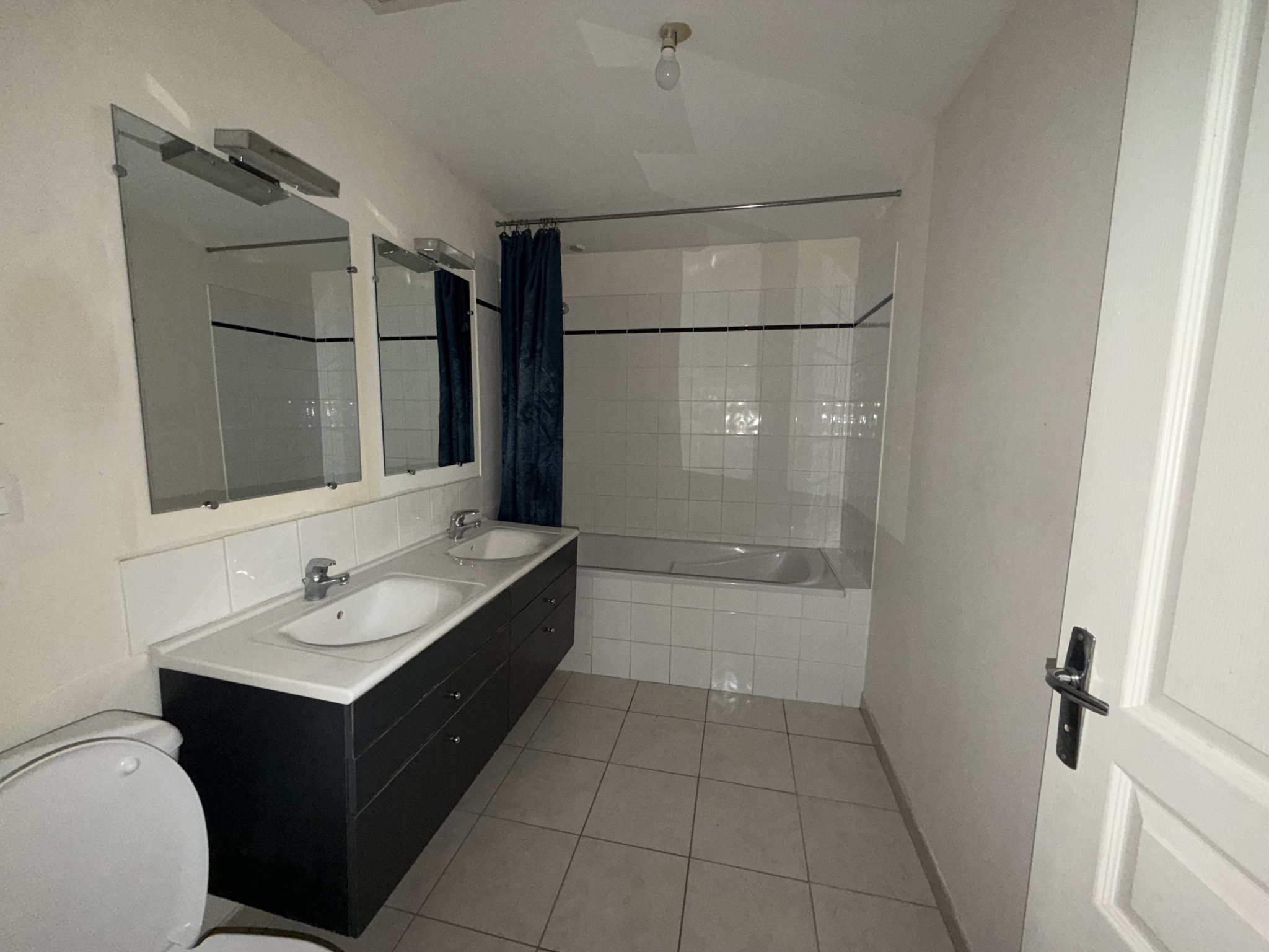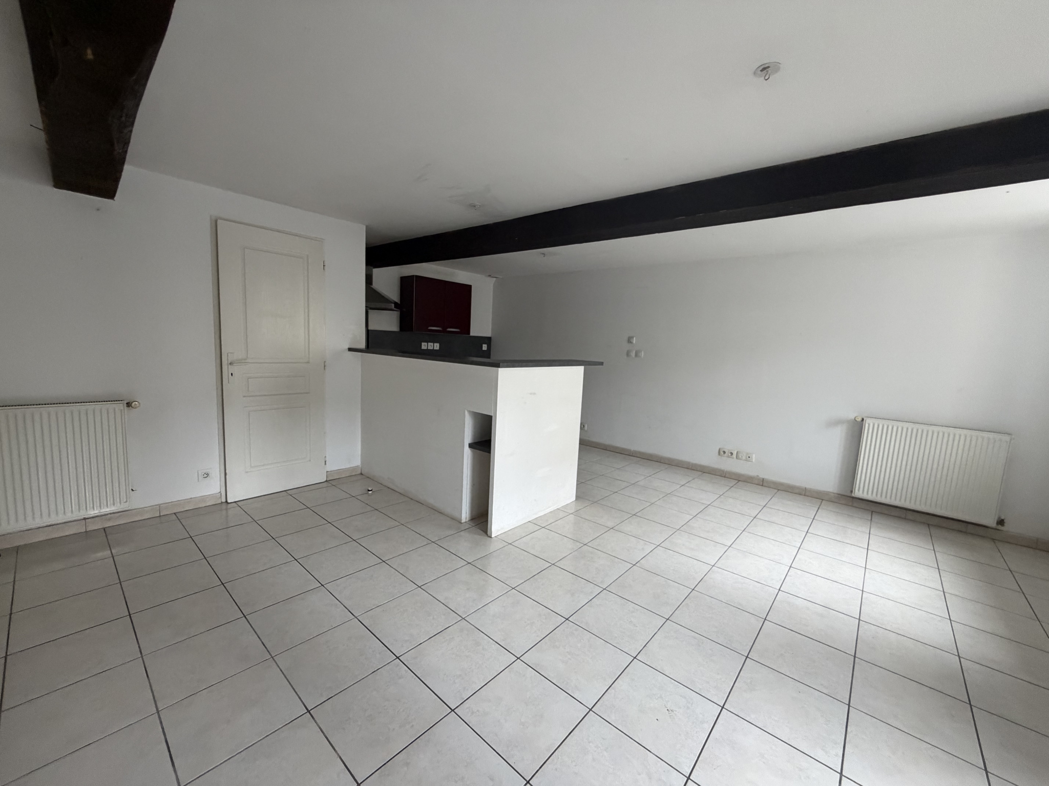 Logement 1 : Maison de 74 m2, récemment libérée (ancien loyer : 660 EUR CC). RDC : salon avec cuisine ouverte, WC, buanderie. À l'étage : grand palier, deux chambres, salle de bains avec double vasque, WC indépendant.