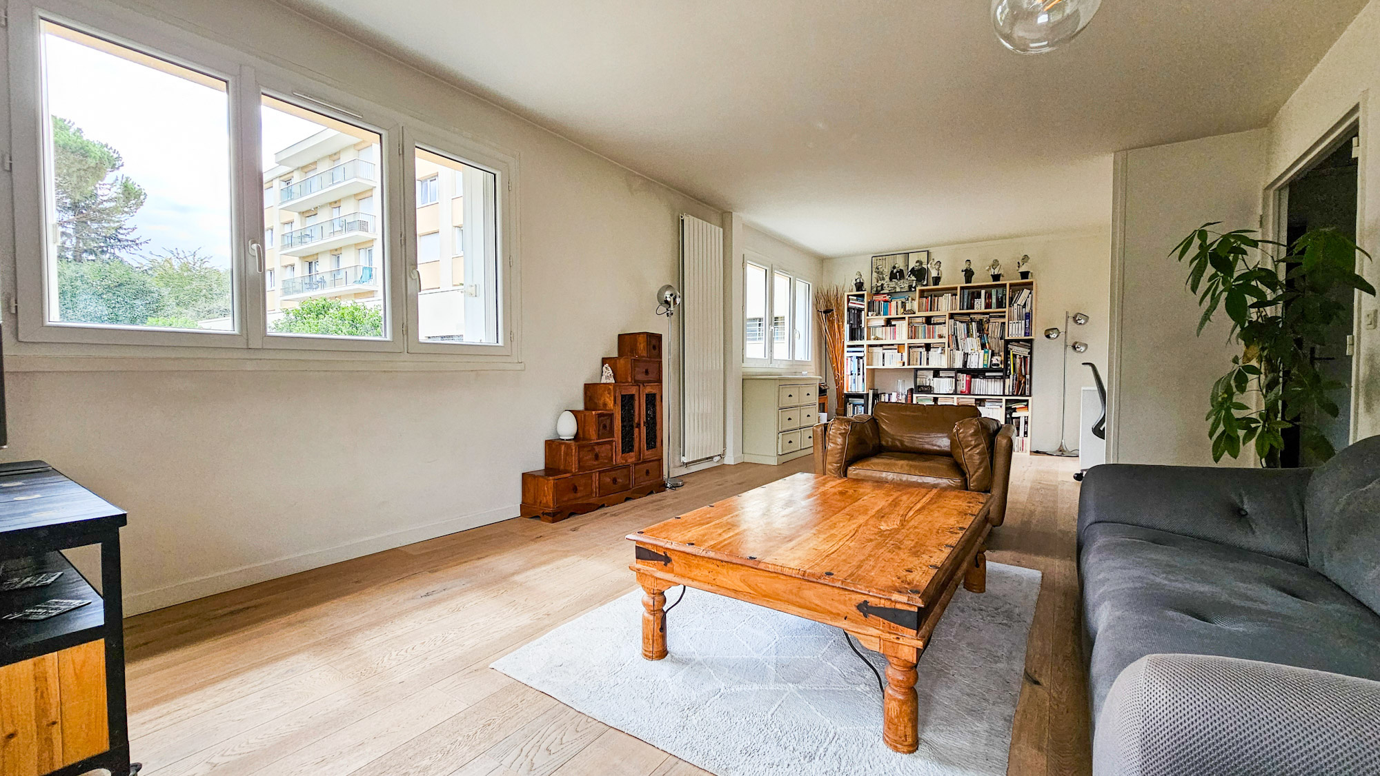 Une grande entrée avec placard et cellier, un séjour double de plus de 30 m2 (possibilité d'une 4ème chambre) donnant sur son balcon sans vis-à-vis, une cuisine aménagée et équipée (possibilité d'ouverture), une chambre avec salle d'eau, deux chambres donnant sur son balcon filant, une salle de bains et un WC séparé,
