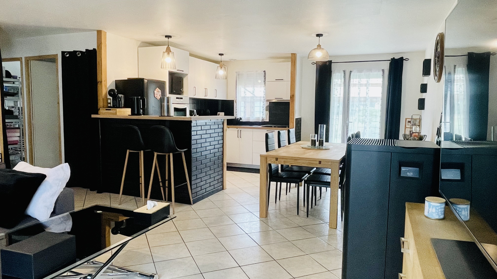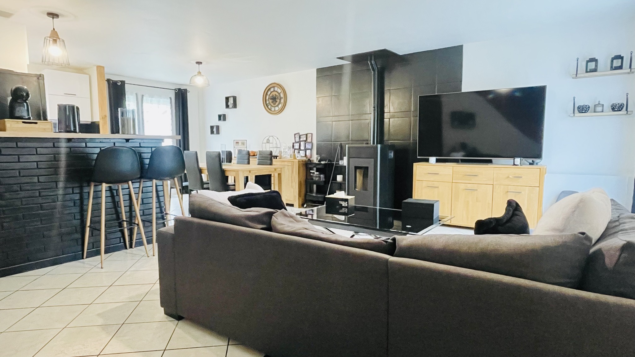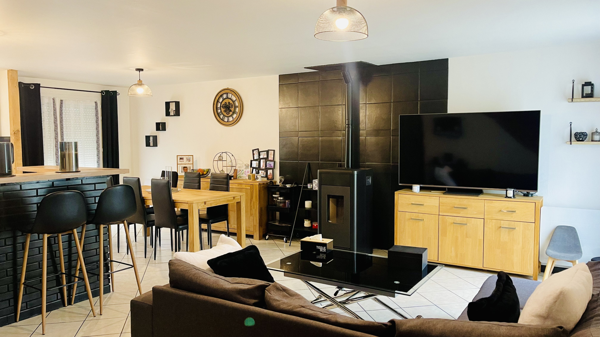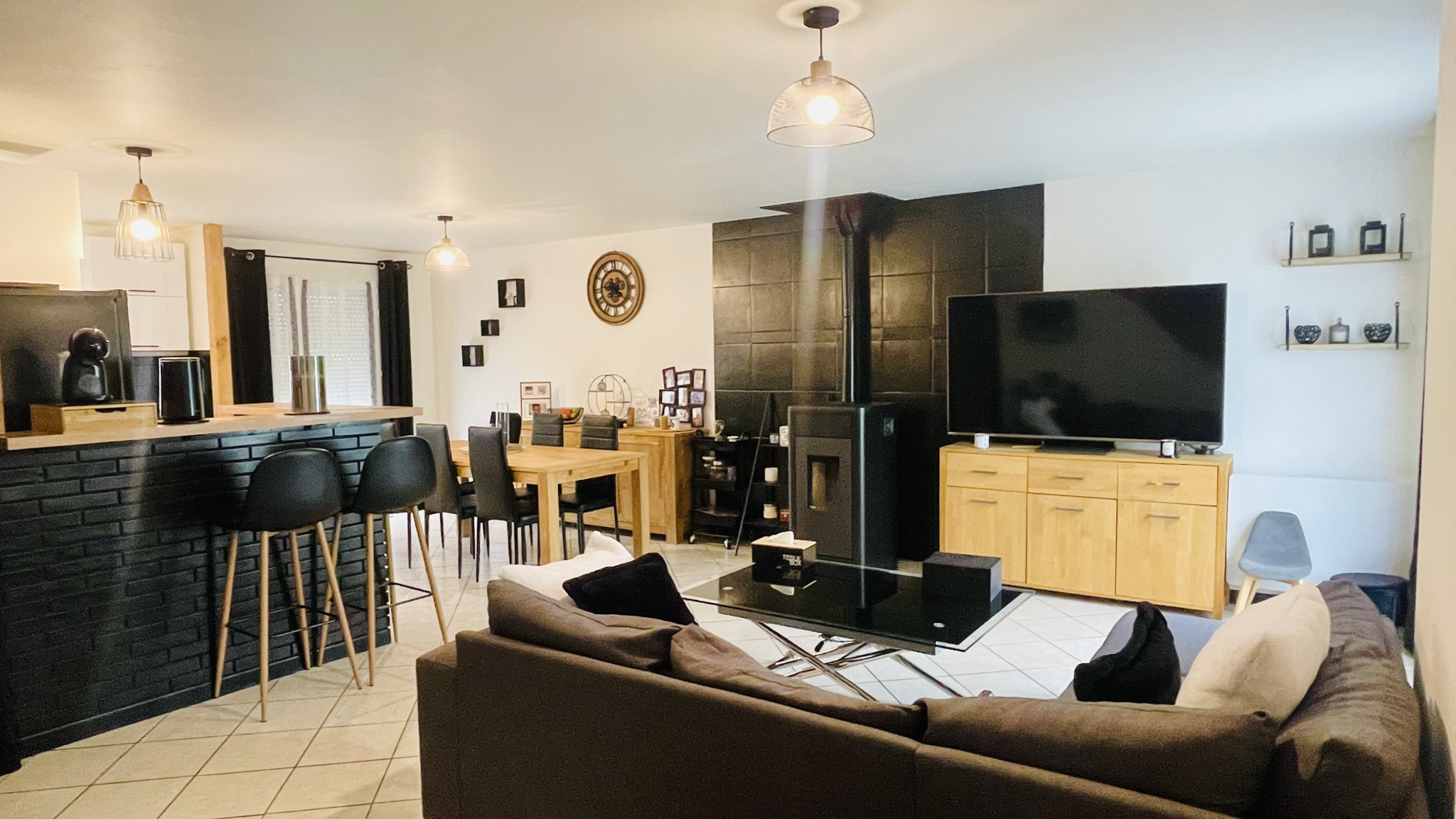 L'espace de vie de 36 m2 avec cuisine équipée nous facilite et harmonise la réception de nos invités. Sur l'arrière de la maison vous profiterez de l'absence de voisin et d'avoir une vue dégagée sur une patûre. Maison économe: Une palette de pellets annuelle (envrions 400 euros par an)
