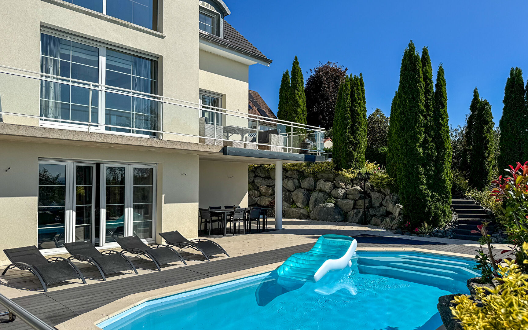 VILLA AVEC PISCINE PROCHE DE MONTBELIARD A Dasle, dans un quartier résidentiel en lisière de nature, cette maison d'architecte marie le confort contemporain et la quiétude d'un panorama dégagé. Conçue pour capter la lumière, elle déploie de généreux volumes autour d'un séjour ouvert et d'un vide sur salon spectaculaire. De larges baies invitent le paysage à l'intérieur, tandis qu'un poêle à granulés apporte une note chaleureuse aux soirées d'hiver. Le jardin clos, facile à vivre, accueille plusieurs terrasses et une piscine chauffée qui prolonge la maison vers l'extérieur. Un espace bien-être complet, spa, sauna, hammam, compose un véritable havre de détente. Ici, le calme se conjugue à la proximité : commerces, écoles, pistes cyclables et gare TGV sont à quelques minutes, tout comme les paysages du Doubs et les frontières suisses. Un cadre idéal pour une famille ou pour une résidence secondaire élégante et sereine. Lignes épurées, lumière magistrale Dès l'entrée, l'architecture révèle sa force : un vaste espace de vie traversé de lumière, rythmé par un escalier en fer forgé au dessin aérien. Les volumes sont ouverts, le regard circule entre cuisine, séjour et mezzanine, créant un lien constant avec le jardin. Les chambres, réparties sur plusieurs niveaux, offrent intimité et confort, dont une suite de plain-pied ouverte sur la terrasse. Les finitions soignées, les menuiseries aluminium et le chauffage par le sol soulignent la qualité de la conception. Chaque détail a été pensé pour conjuguer modernité, efficacité et convivialité. Un jardin facile, une invitation à la détente Protégé par des haies et des murets, le jardin se déploie comme un salon à ciel ouvert. Les terrasses carrelées captent le soleil, idéales pour des repas en plein air. La piscine chauffée, le Kota finlandais, avec, en rez-de-jardin de l'habitation, le spa aromatique, le sauna et le hammam, invitent à une parenthèse de bien-être en toutes saisons. La vue s'étire vers la nature environnante, apportant un sentiment d'espace et de liberté. L'entretien, volontairement simplifié, permet de profiter pleinement de chaque moment, qu'il s'agisse d'une longue soirée d'été ou d'un bain chaud sous le ciel d'hiver. Entre Doubs et Suisse Dasle bénéficie d'une situation privilégiée : à quelques minutes de Montbéliard, proche de la frontière suisse et de la gare TGV de Belfort-Montbéliard. Les forêts du Parc naturel du Doubs Horloger, les cascades et les nombreux sentiers de randonnée s'offrent aux amoureux de nature. Les étangs de Brognard et du Malsaucy, les pistes cyclables et les stations du Ballon d'Alsace complètent l'éventail des escapades. Cette villa contemporaine avec piscine à Dasle permet ainsi de conjuguer vie active et grands espaces, ville et campagne, dans un équilibre rare. AVIS DE L'AGENCE: Cette maison d'architecte séduit par la pureté de ses lignes, ses volumes baignés de lumière et son espace bien-être unique. Idéale pour une famille ou un couple en quête d'une résidence secondaire élégante, elle combine calme résidentiel, proximité des commodités et ouverture sur la nature et la Suisse voisine. Un bien clé en main qui incarne une qualité de vie contemporaine, entre confort et sérénité. Dossier complet sur demande. Virginie GIRARDOT (EI) Agent Commercial - Numéro RSAC : 935 075 481 - .