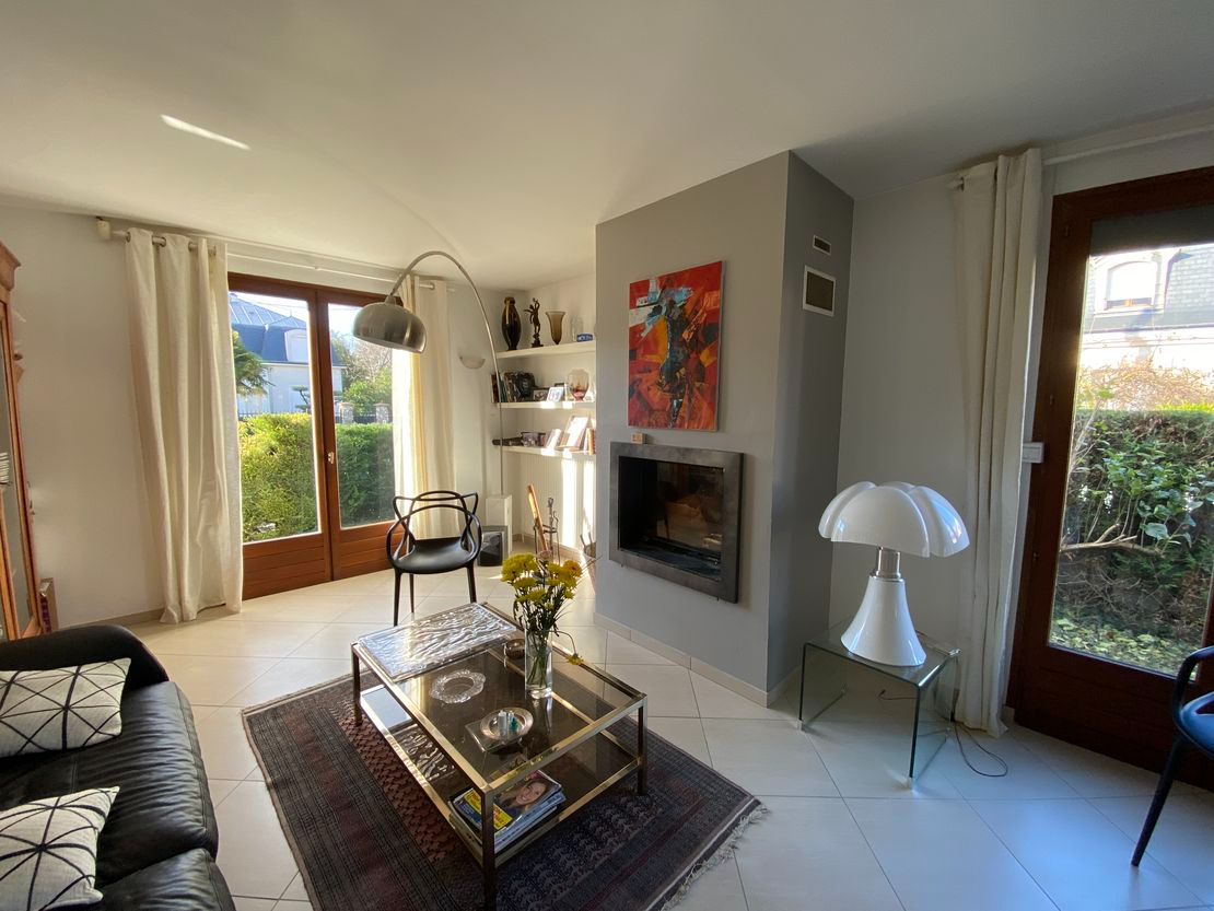 Réf. 7916 LE RAINCY, quartier pavillonnaire proche des écoles et des commerces du plateau. Maison de conception originale sur un terrain de 565 M2 , d'une surface habitable de 175 m2. Au rez-de-chaussée un séjour double de 45 M2 avec une triple exposition, cheminée avec insert, cuisine équipée ouvrant sur le jardin. A demi palier, l'espace parent avec chambre, salle de bains et dressing. Au dessus trois chambres, deux salles d'eau et lingerie, au dernier niveau une grande chambre. Au sous-sol chaufferie (chaudière récente à condensation), buanderie cave, garage pour deux véhicules. A l'extérieur deux places de stationnement. Un environnement agréable et au calme.