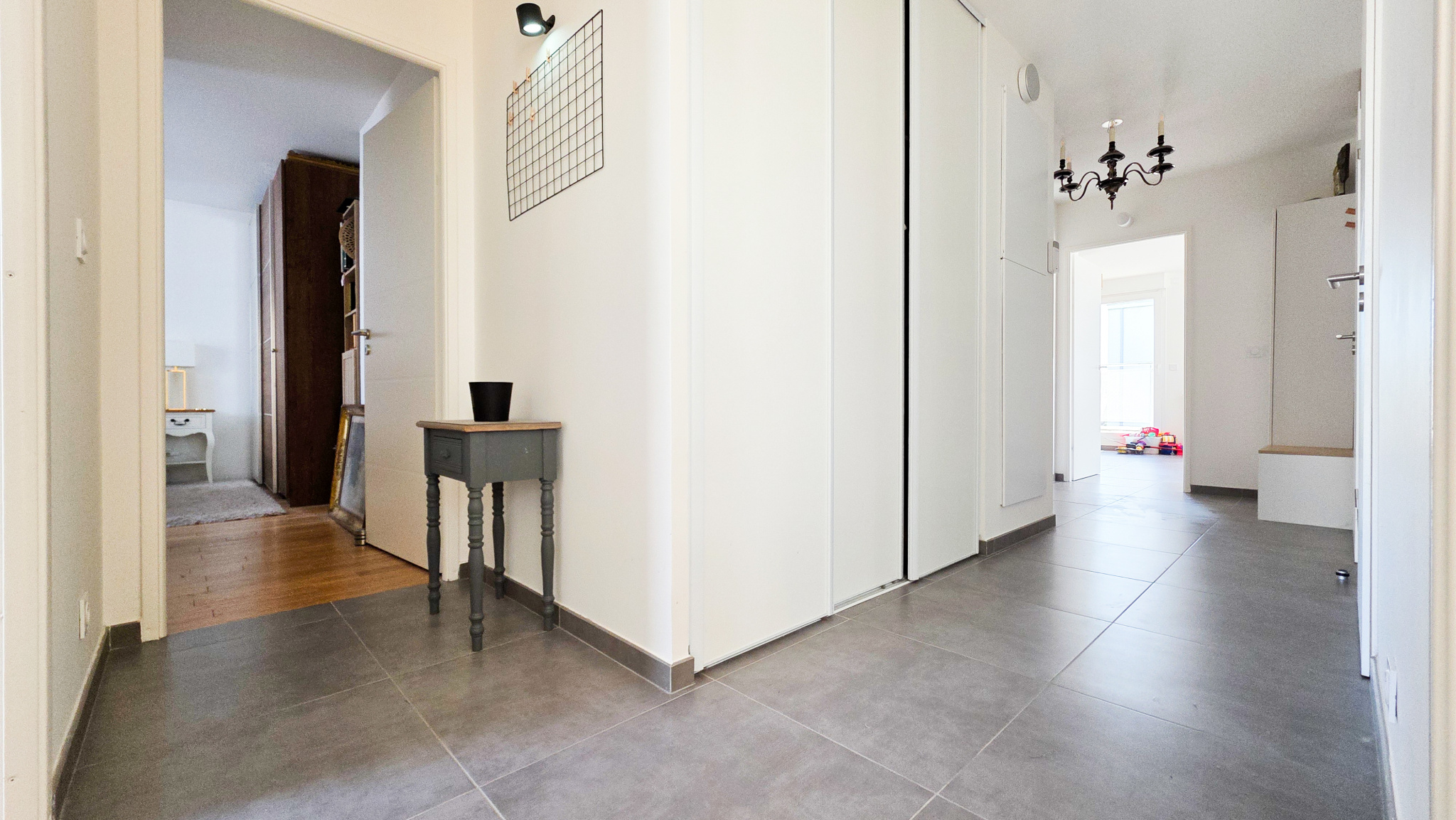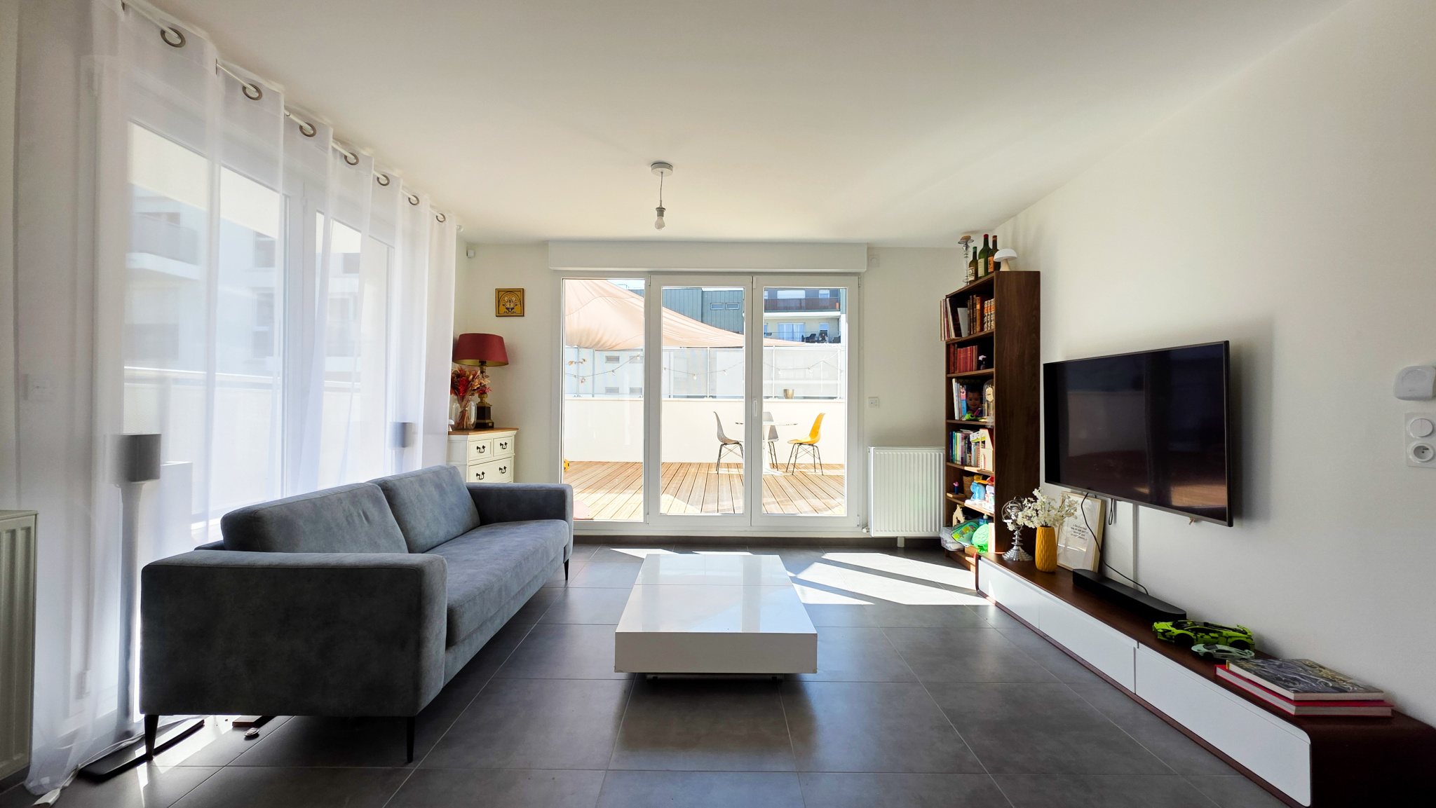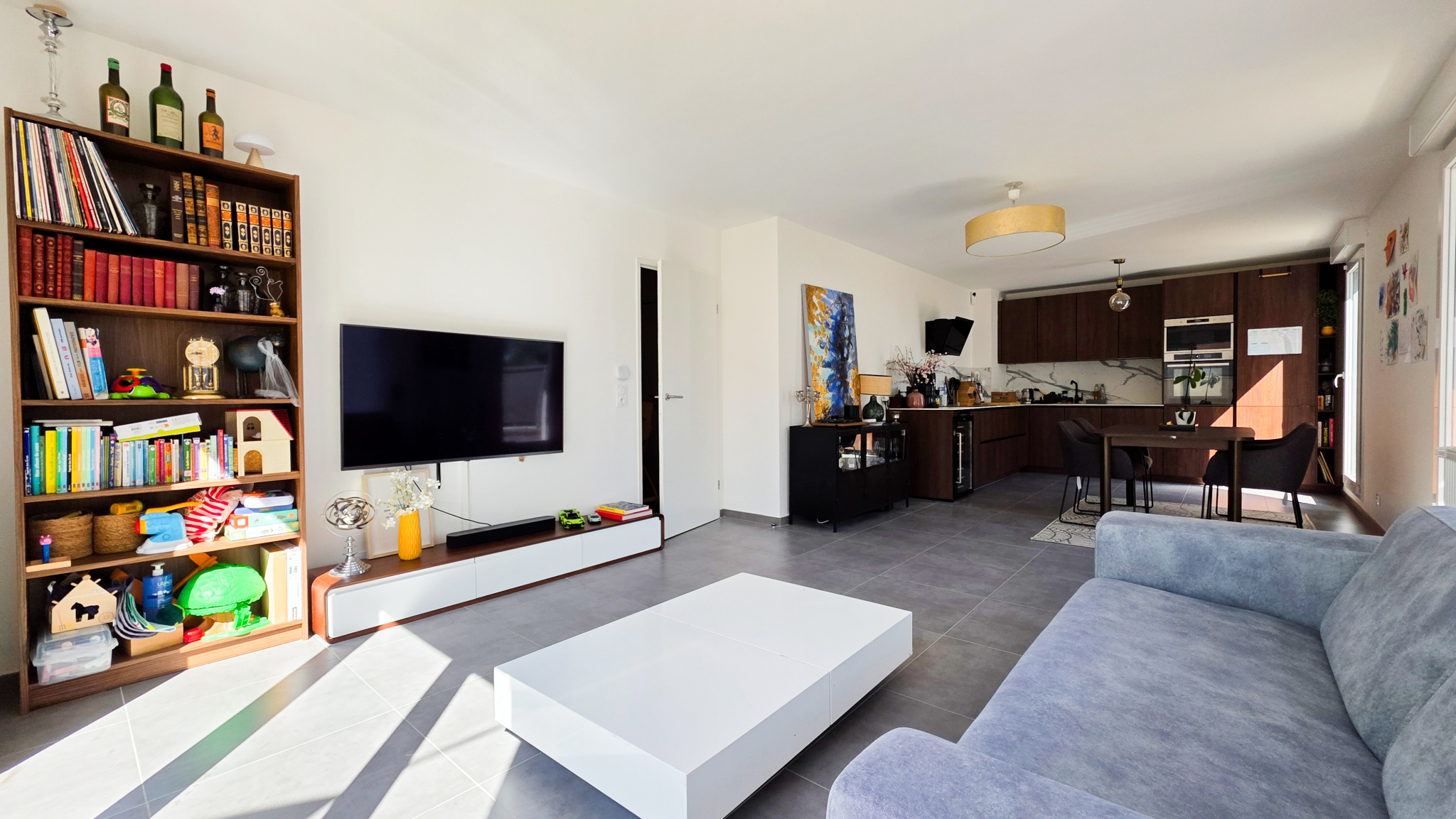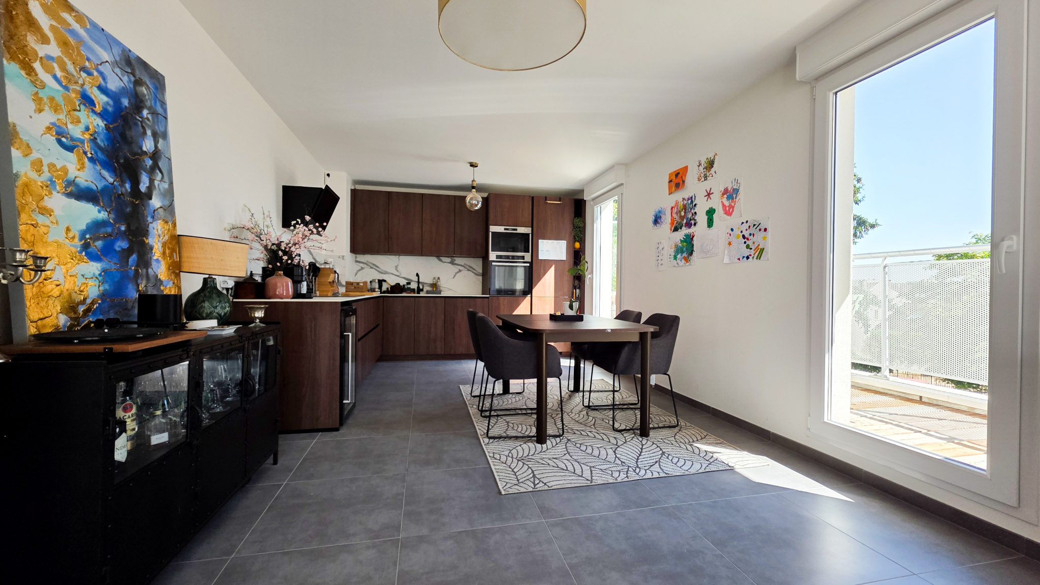 Une entrée avec placard, un spacieux séjour avec une cuisine aménagée et équipée donnant sur sa terrasse exceptionnelle, trois chambres dont une suite parentale avec douche, une salle de bain et un WC séparé.