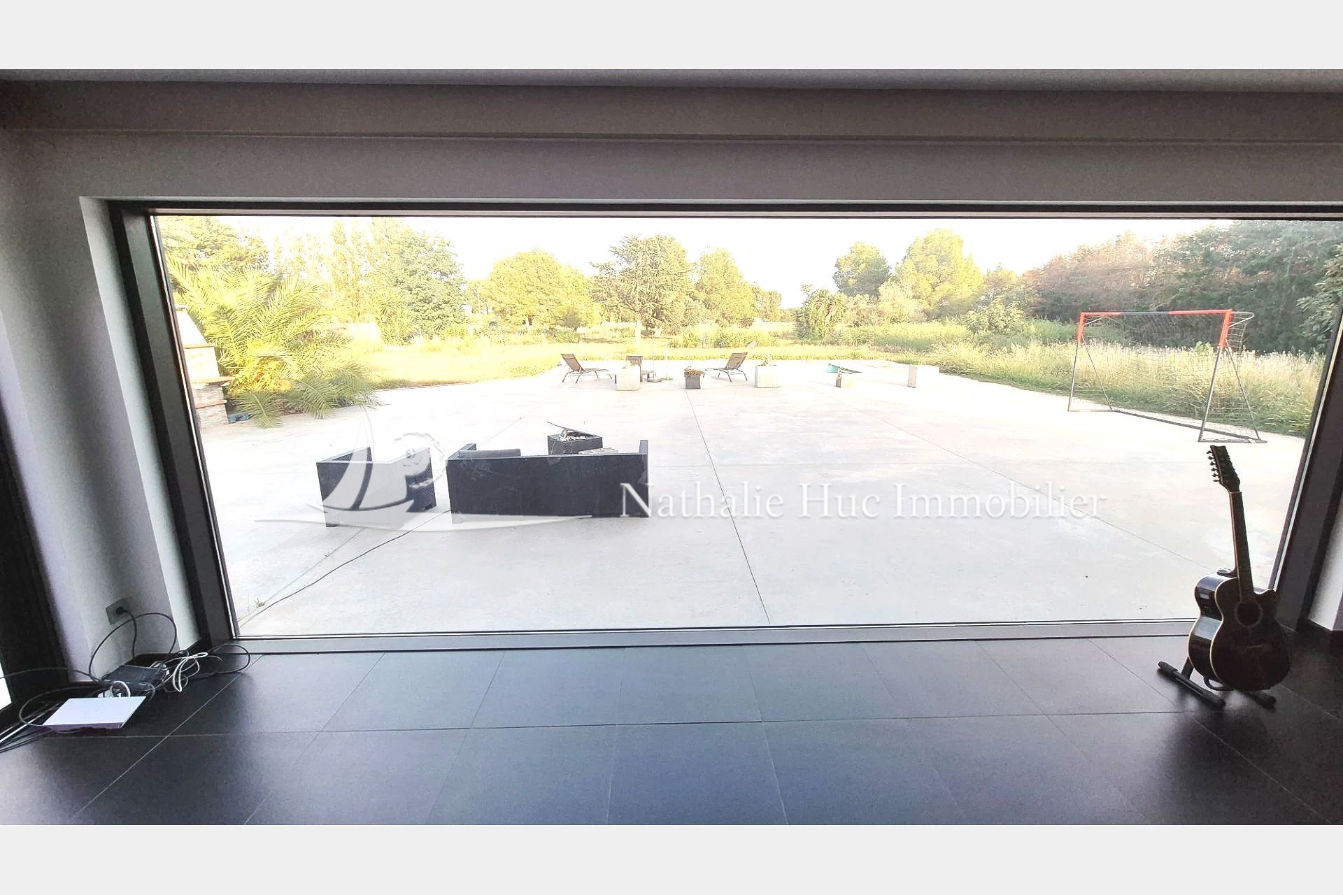 Proche Perpignan à la campagne, propriété d'exception au calme, de 285 m² habitables de plain-pied sur un parc arboré de 9 222 m². Superbe entrée de 34 m² avec ses belles portes en ferronneries donnant sur une pièce de vie de 130 m² avec une cuisine ouverte ultra-contemporaine.