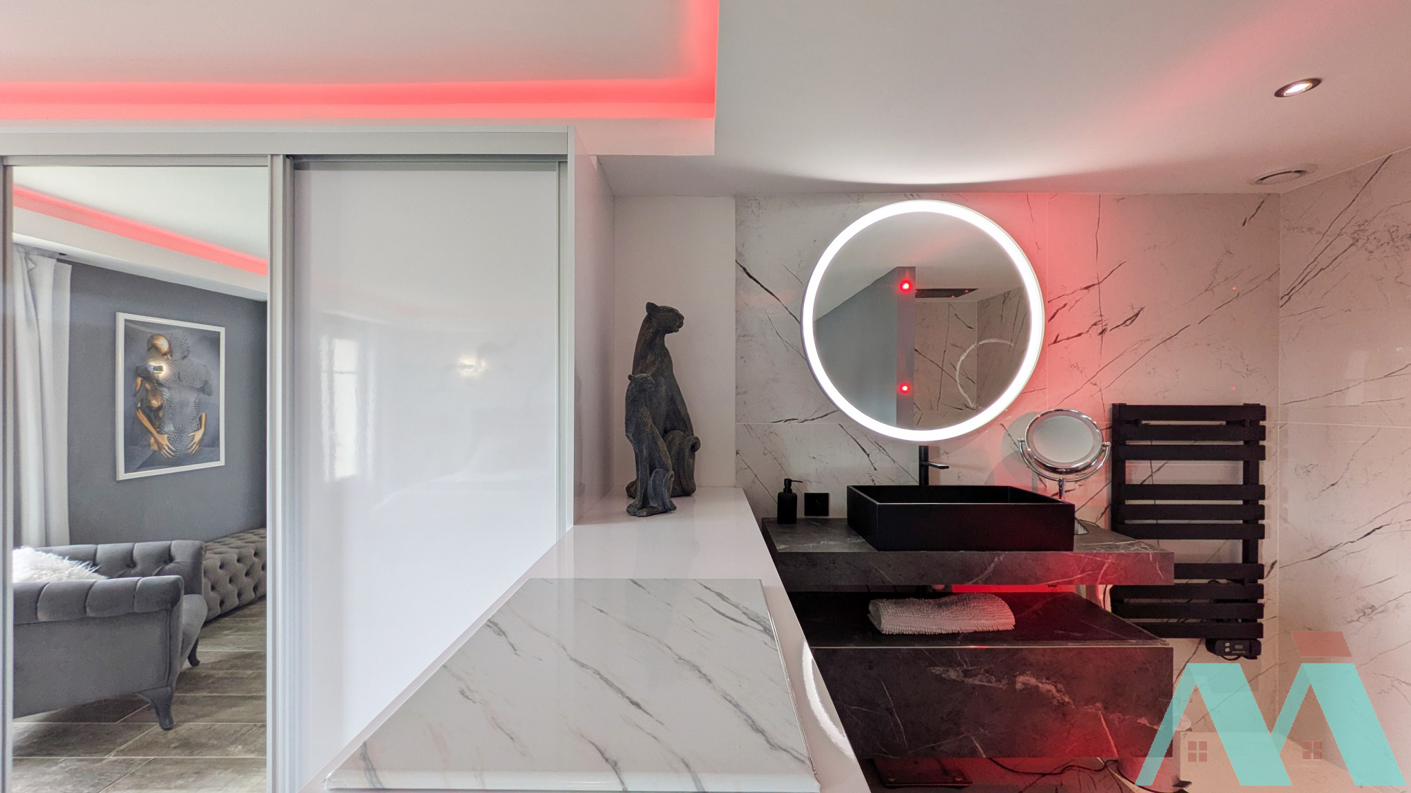 Dès l'entrée, vous serez conquis par la magnifique hauteur sous plafond, le mur en grès cérame qui apporte caractère et raffinement. Le lustre design complète cet ensemble avec une touche de chic intemporel.
