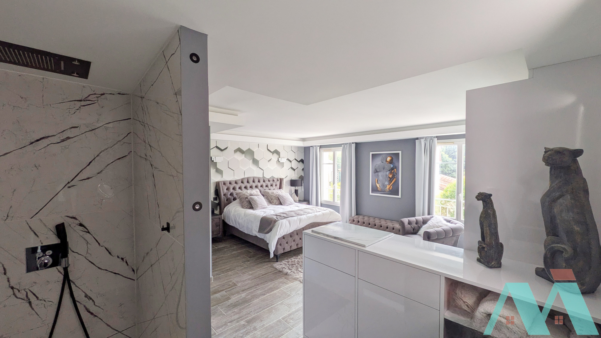 Un dégagement mène à une première suite parentale aux volumes généreux. À l'étage, une deuxième suite élégante, la mezzanine baignée de lumière, créant une atmosphère apaisante et chaleureuse.