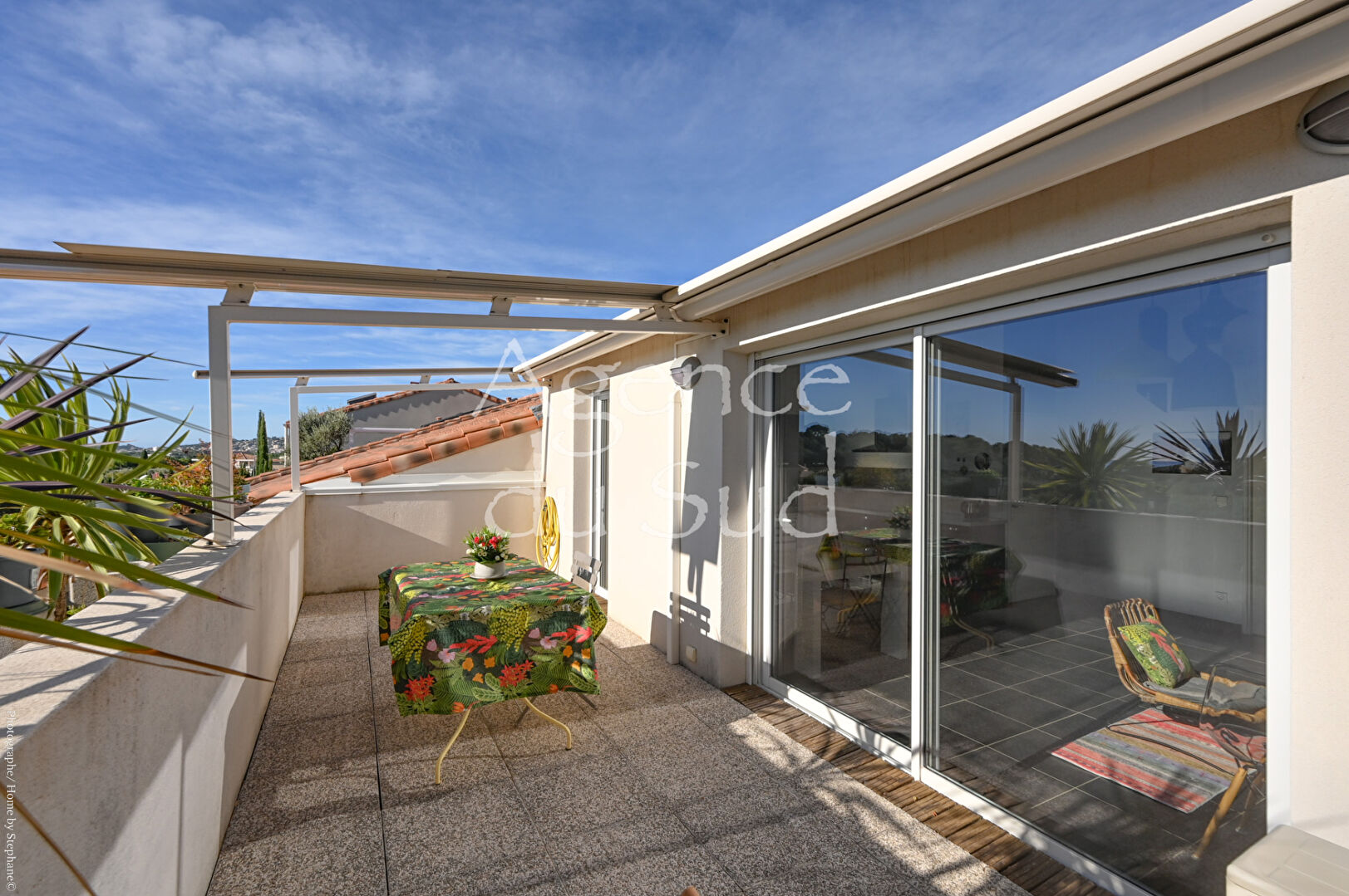 L'Agence du SUD vous propose ce superbe appartement lumineux, situé au dernier étage avec ascenseur d'une résidence de standing datant de 2013. Ce bien rare bénéficie d'un vaste espace salon-séjour de 32m² baigné de lumière, avec une très belle hauteur sous plafond, offrant une atmosphère chaleureuse et aérée. Dans le prolongement de cette pièce de vie, vous profiterez d'une spacieuse terrasse tropézienne de plus de 17 m², exposée Sud-Est, avec une vue dégagée. Deux stores bannes électriques y sont installés, parfaits pour vos journées d'été. La cuisine, entièrement équipée, est complétée par un cellier attenant, offrant des rangements supplémentaires très pratiques. Côté nuit, l'appartement propose trois belles chambres avec placards intégrés, une salle de bains ainsi qu'un WC indépendant. Entièrement traversant, ce bien a été conçu comme une véritable "maison sur le toit", alliant confort, fonctionnalité et tranquillité ? l'idéal pour une famille en quête de qualité de vie. Pour encore plus de confort, deux places de stationnement en sous-sol sont incluses dans le prix de vente. Ce bien est soumsi au statut de la copropriété, les charges sont d'environ 140euros par mois. Contactez nous rapidement au 04.42.70.20.20. Copropriété de 52 lots (Pas de procédure en cours). Charges annuelles : 1680 euros.