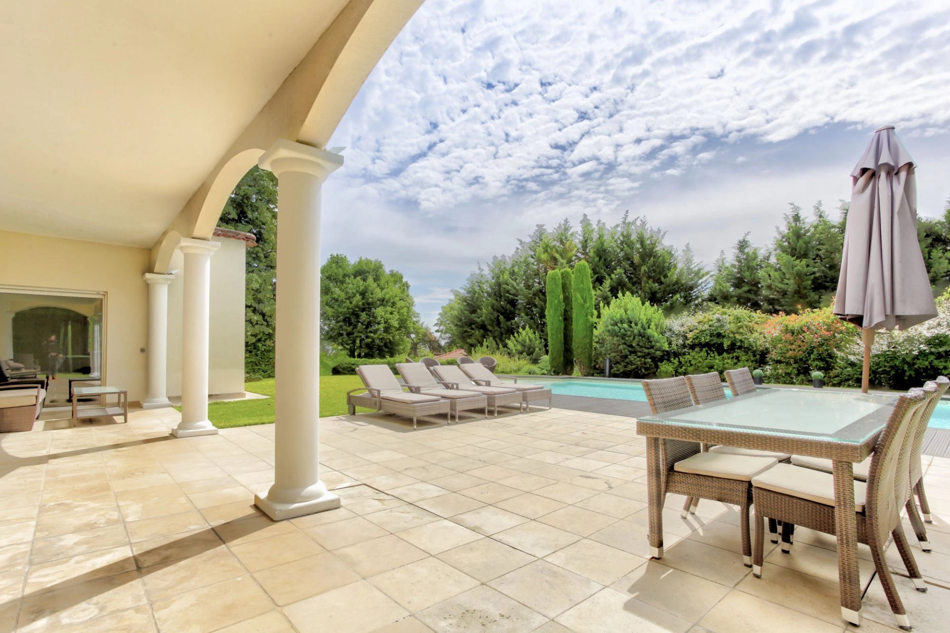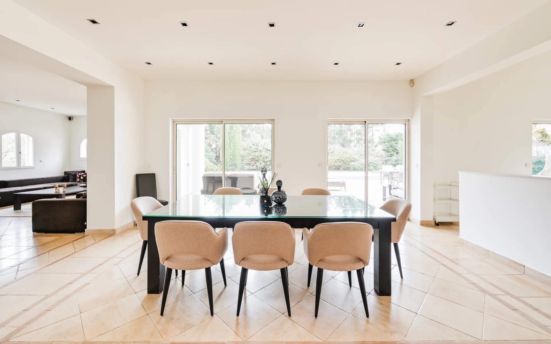Dès l’entrée, le rez-de-jardin dévoile un vaste séjour raffiné de plus de 40 m², baigné de lumière grâce à de larges baies vitrées à galandage et prolongé par une grande terrasse partiellement couverte.