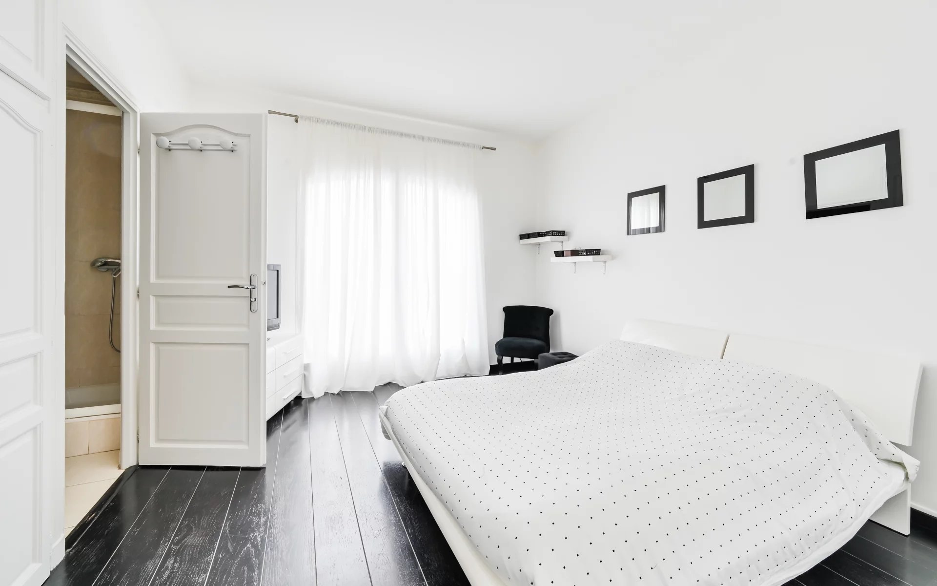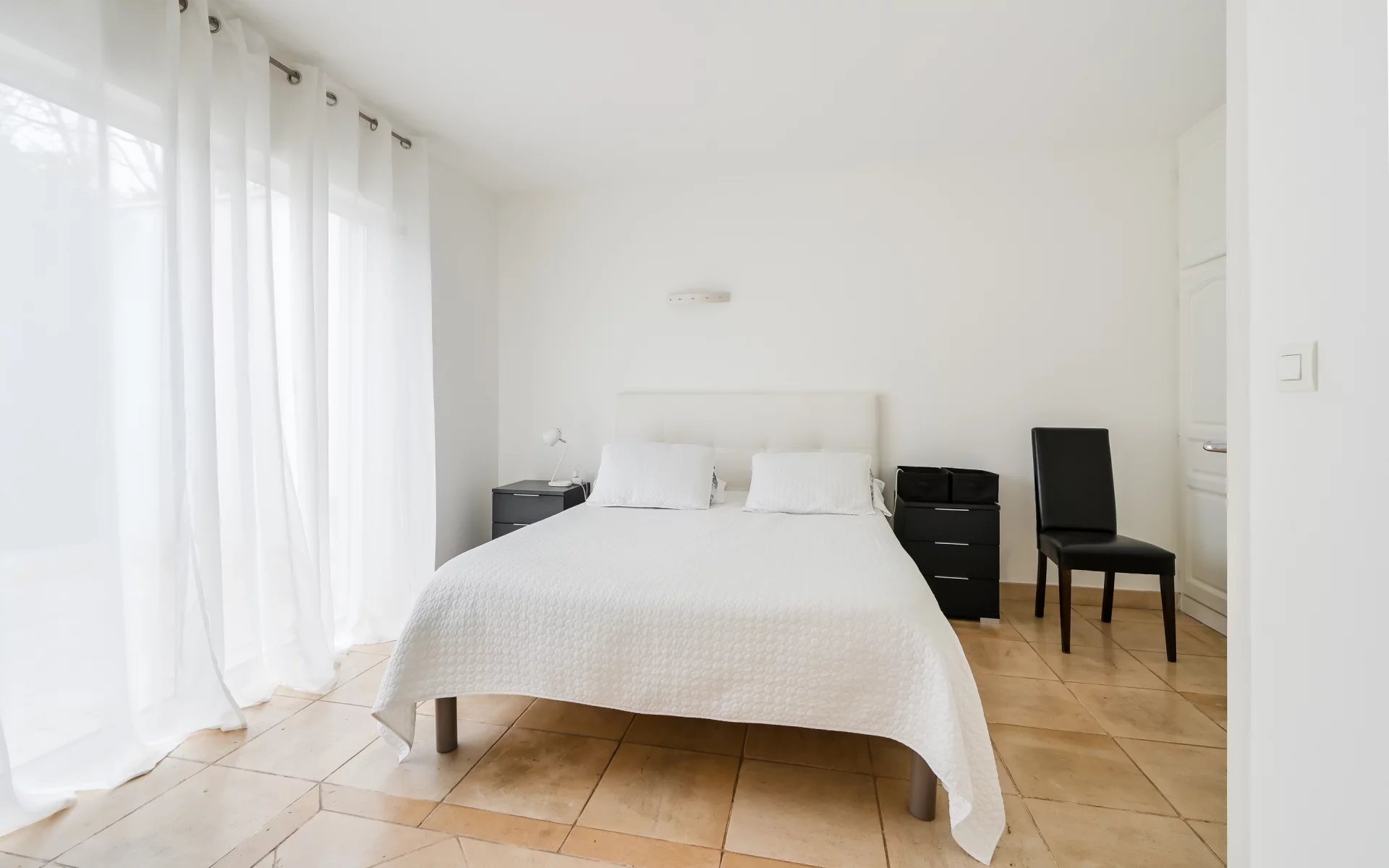 Trois autres suites, toutes équipées de salles de douche privatives, complètent ce niveau, dont deux bénéficiant d’un accès direct à la terrasse, renforçant l’impression d’espace et de bien-être.