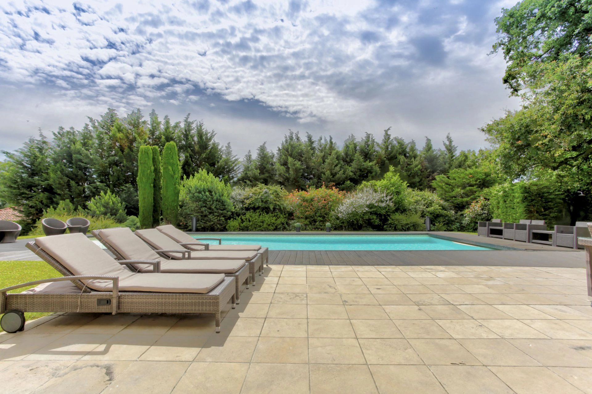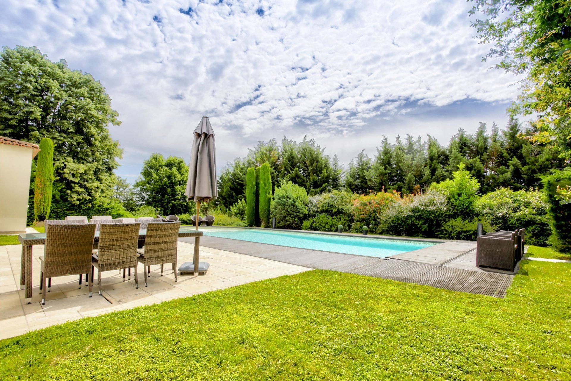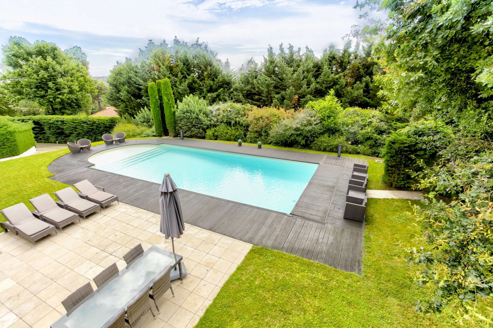 À l’extérieur, une piscine chauffée de 14,5 x 6 m avec plages invite à la détente, tandis que l’arrosage automatique simplifie l’entretien des extérieurs.