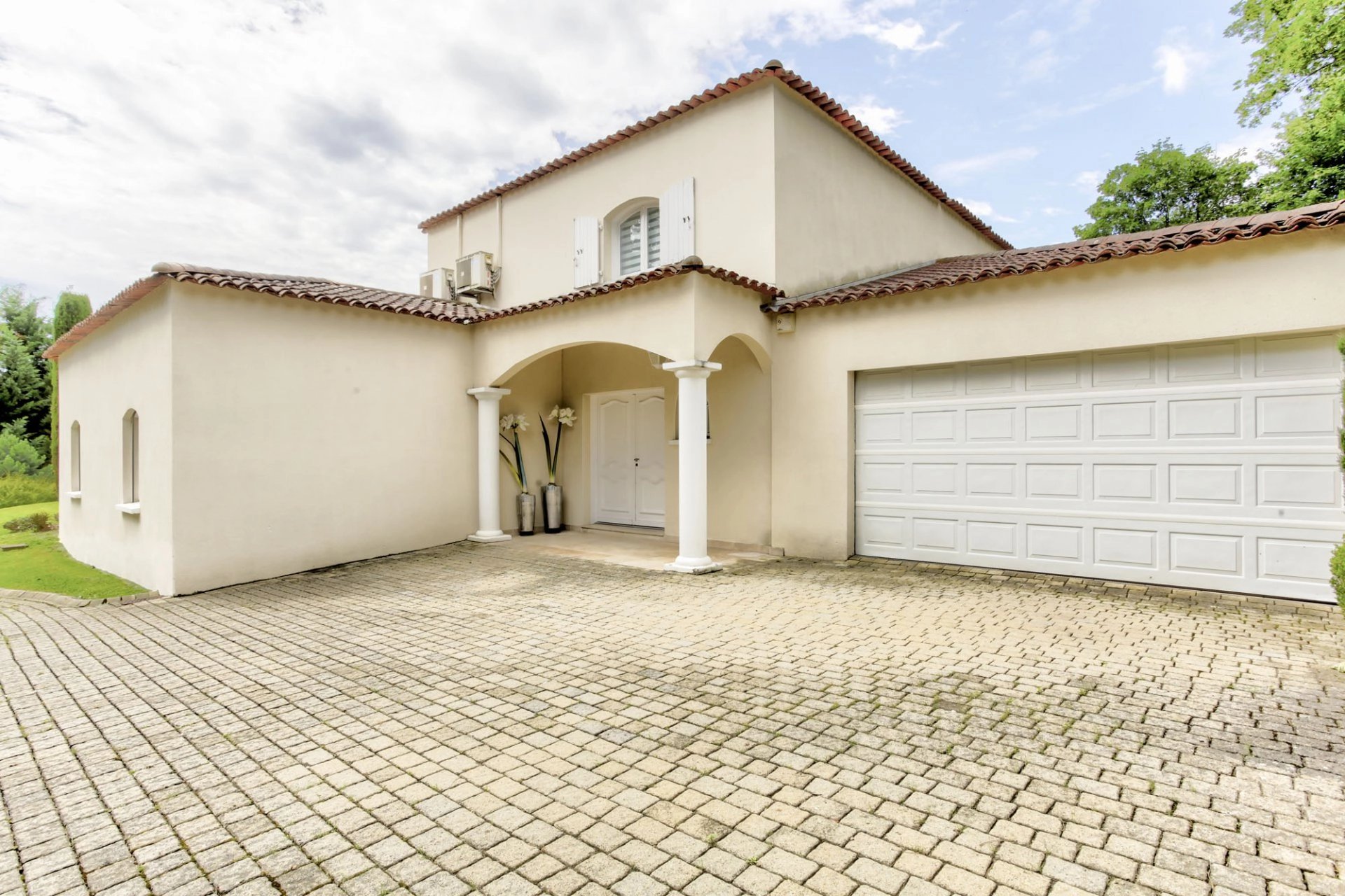 Un garage double avec porte automatique, 4 places de stationnement supplémentaires et 3 bornes de recharge pour véhicules électriques viennent compléter ce bien rare.