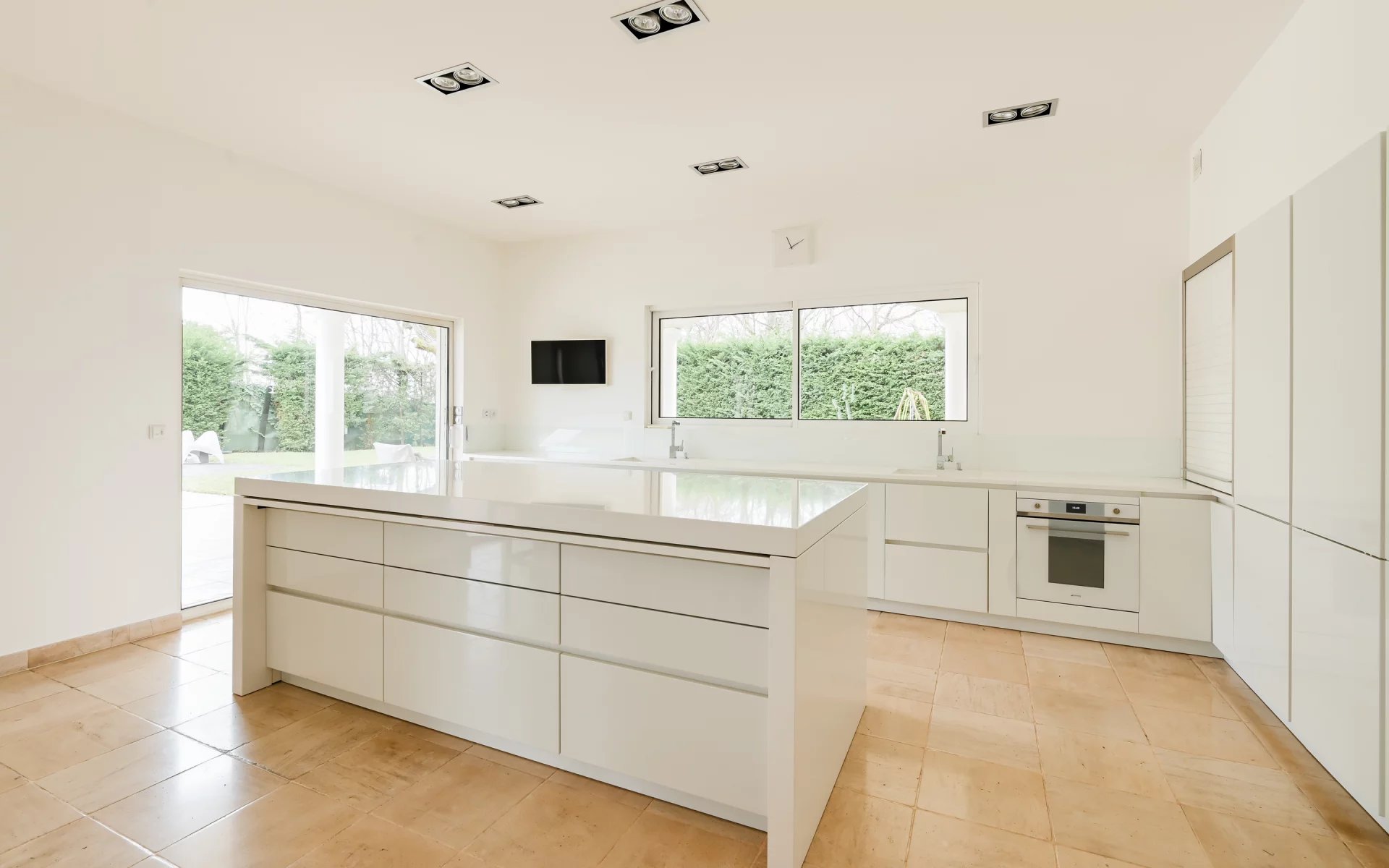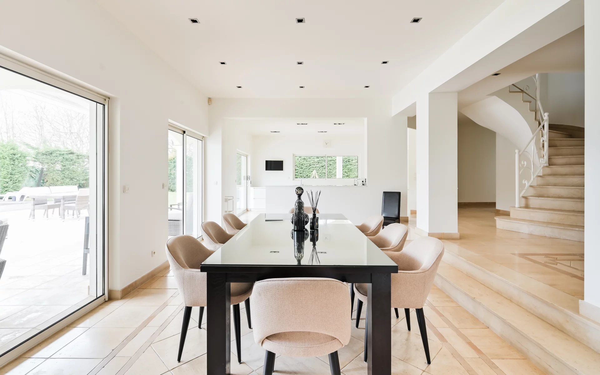La cuisine contemporaine, entièrement équipée, s’ouvre sur la salle à manger pour former un espace de réception idéal, à la fois convivial et fonctionnel.