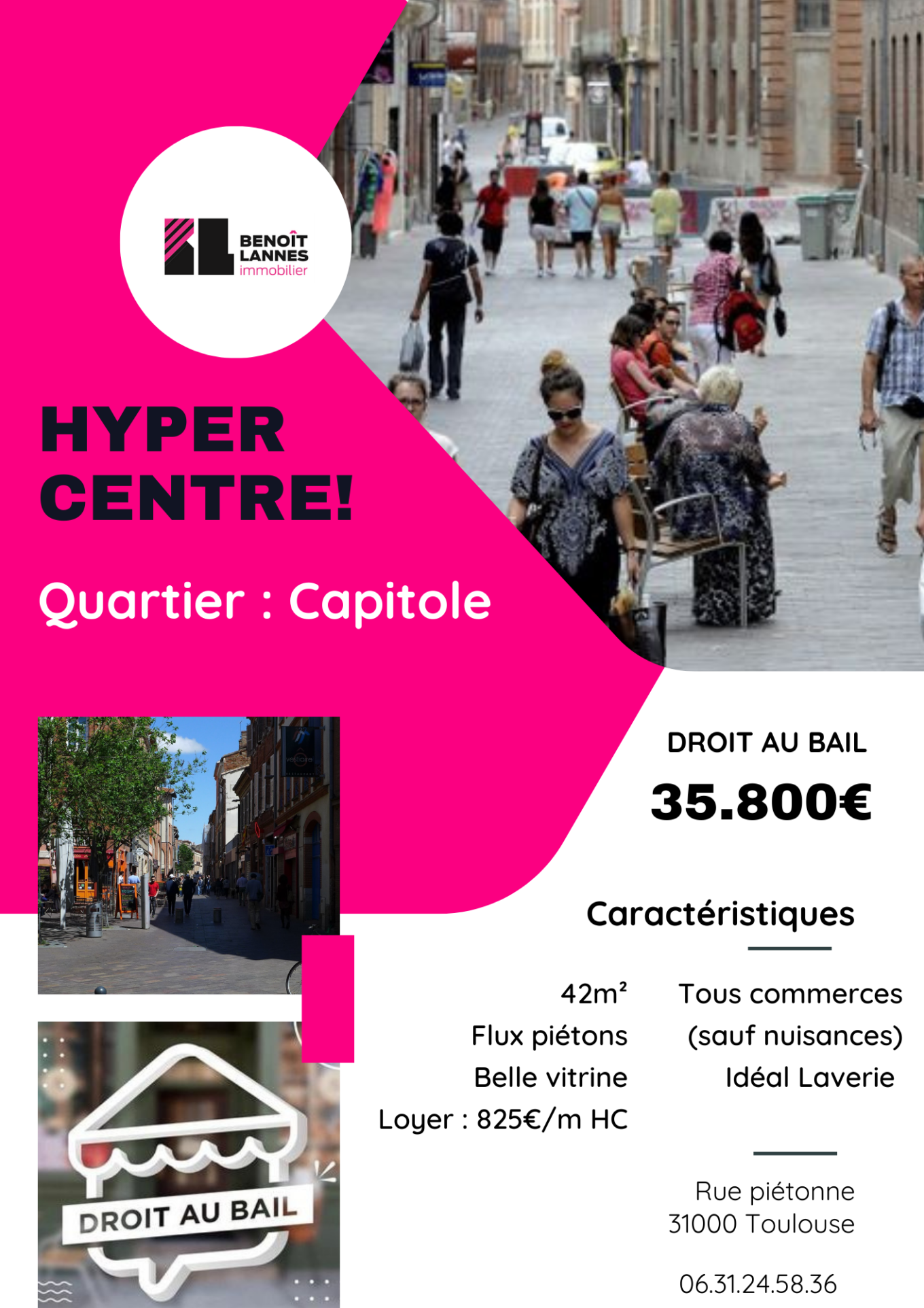 Coup de coeur de l'agence : local commercial de 35 m², situé en plein coeur de la ville de Toulouse, dans une rue avec un important flux piéton (rue Pargaminières)Belle vitrine!Tous commerces acceptés (sauf nuisances), sous réserve d'avoir un projet sérieux et bien pensé!Endroit exploité depuis plus de 40 ans, le bail est à céder car l'heure de la retraite a sonné!Loyer très correct pour le secteur (Capitole) : 825EUR / mois.Idéal Vapo Shop, Epicerie, Pâtisserie, Onglerie, Esthétique, Coiffure, Librairie, Laverie, Accessoires, etc. À saisir sans tarder!Cette annonce vous est proposée par Mazzouj Yacine - EI - NoRSAC : 403253263, Enregistré au Greffe du tribunal de commerce de TOULOUSE.Informations LOI ALUR : Honoraires : 31.20 % TTC charge acquéreur et vendeur.Prix hors honoraires : 21 000 ¤. (gedeon_90737_29125534)
