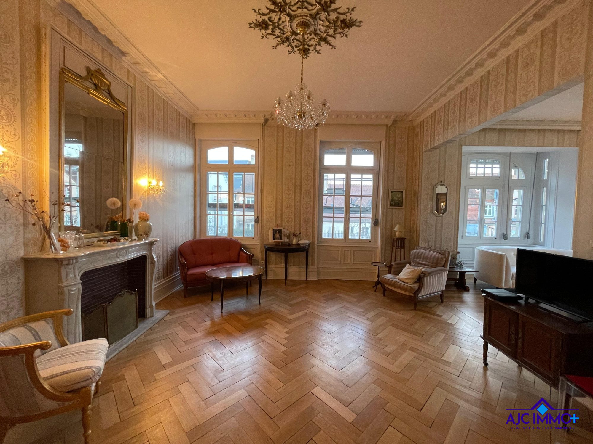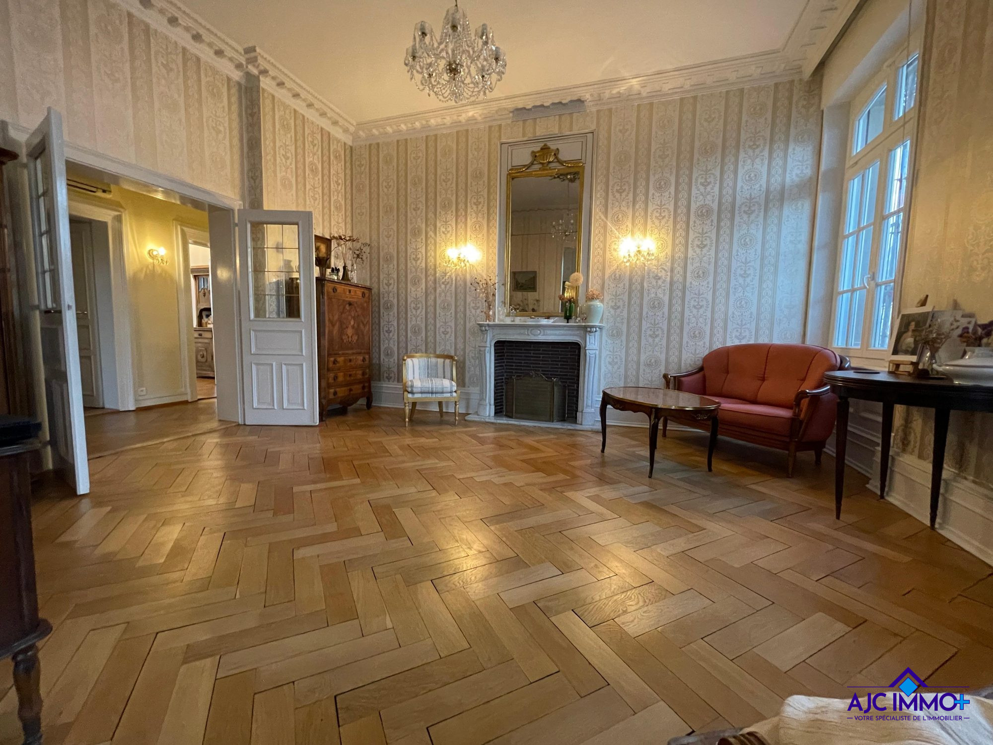 Un vaste salon-séjour sublimé par une cheminée en marbre de Carrare, des moulures d'époque et un parquet massif