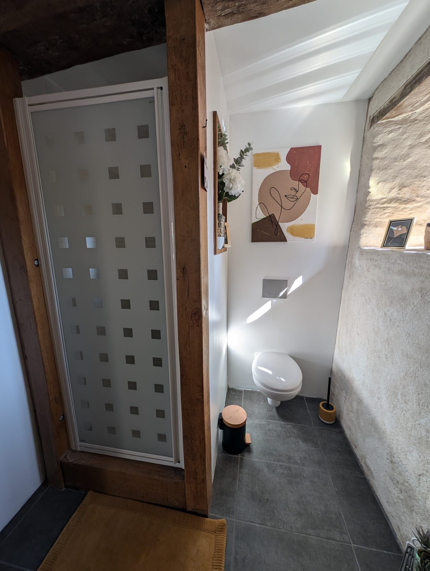A l'étage, 2 grandes pièces à aménager déjà isolées et plaquées. L'alimentation de l'électricité est en place ainsi que les ouvertures.