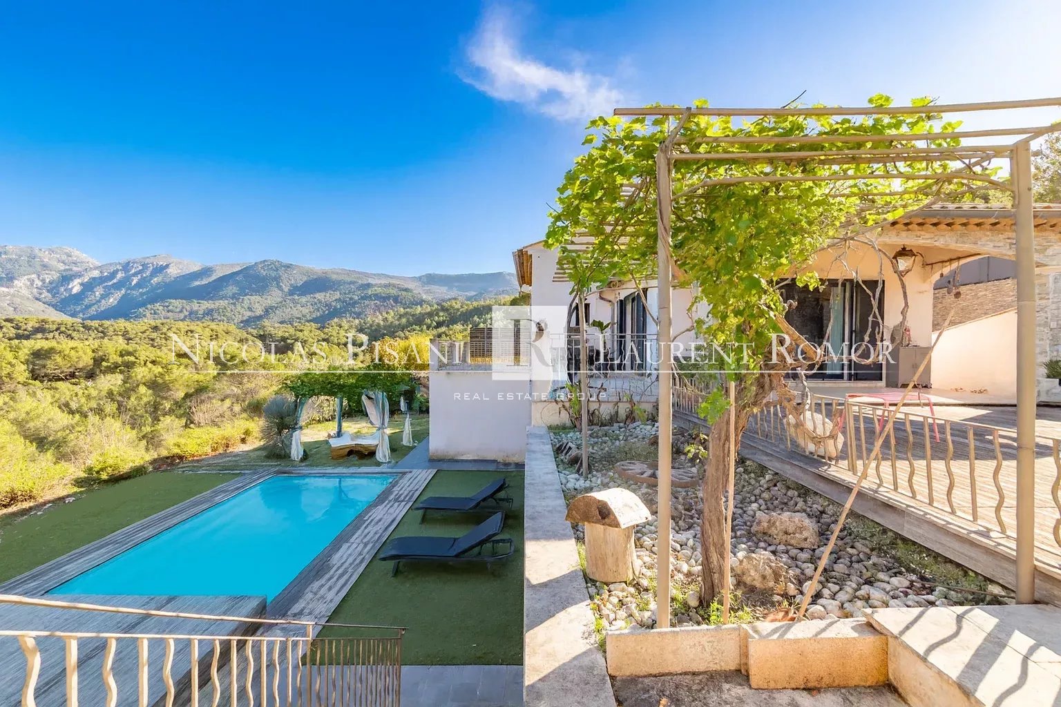 Coté jardin , son terrain plat offre une très belle piscine au sel et des espaces terrasses repartis tout autour de la villa .