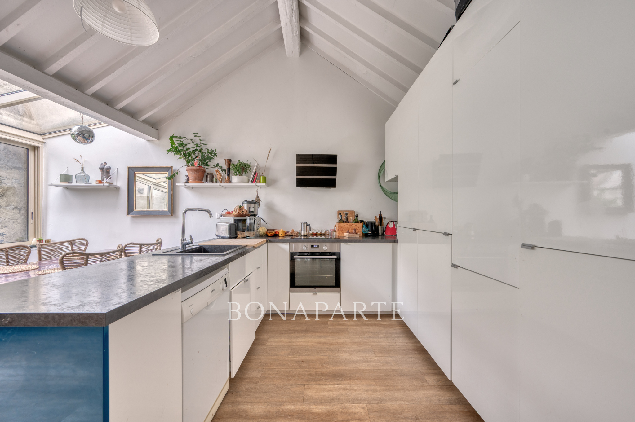 L'entrée se fait directement sur un espace cuisine ouverte aménagée sur salle à manger de 25m2 avec sa belle véranda baignée de lumière communiquant avec un séjour et son poêle traversant de 22m2 environ. Cet espace nous mène aussi directement au jardin sans vis-à-vis direct avec une vue imprenable sur l'Eglise du Village et son histoire. Le son des cloches nous ramène dans une atmosphère conviviale et pleine de vie. Le jardin est également arboré et végétalisé tout en respectant les codes de la maison : coup de coeur assuré. Côté espaces 'nuit', un premier escalier nous emmène sur un premier palier desservant une salle d'eau avec son WC, une première chambre de 14m2. Une superficie idéale vous permettant de l'agencer comme bon vous semble. S'en suit un second escalier en bois (toujours) menant au dernier étage et vous proposant une très belle chambre de 23 m2 avec ses poutres apparentes peintes en blanc et son dressing pour maximiser l'agencement.