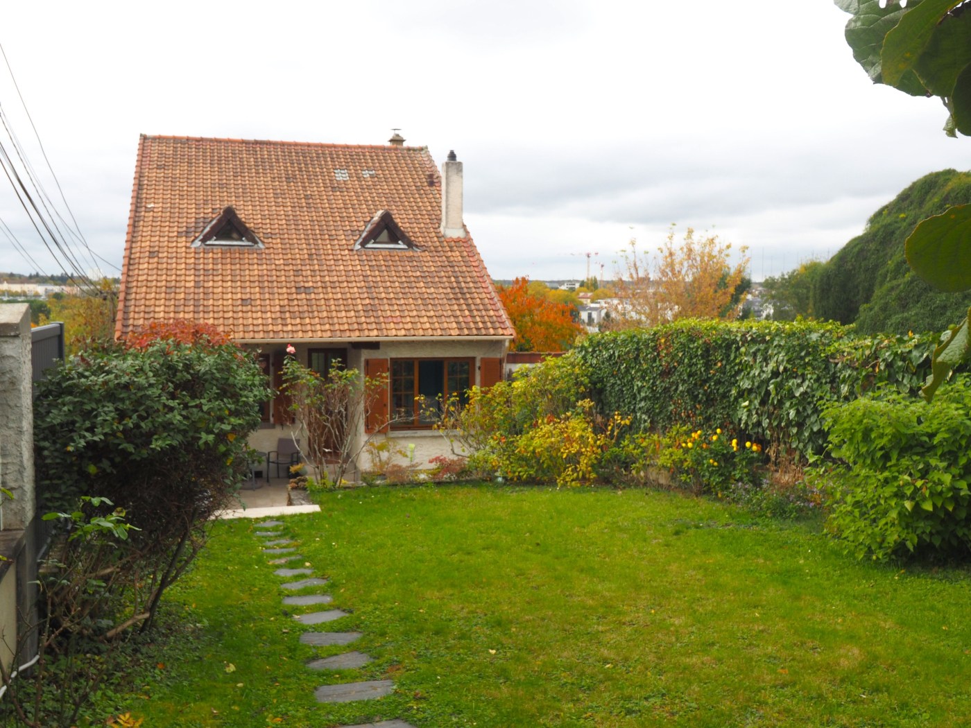 Jardin étagé et arboré, garage avec porte sectionnelle électrique, stationnement.