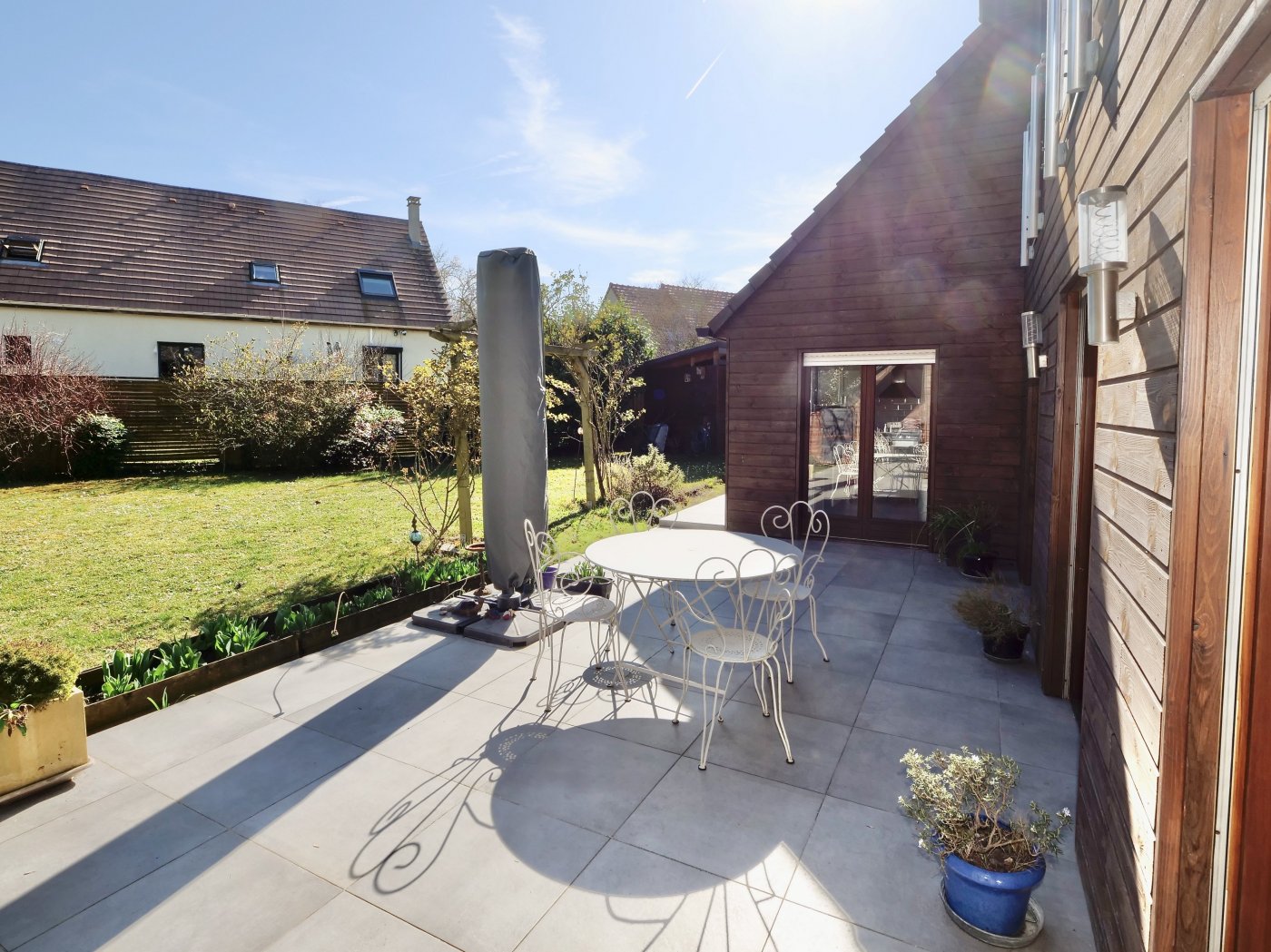 La cuisine séparée, neuve et entièrement équipée, donne accès à la terrasse ensoleillée et à un jardin spacieux, clos, parfait pour les enfants ou les amateurs de jardinage.