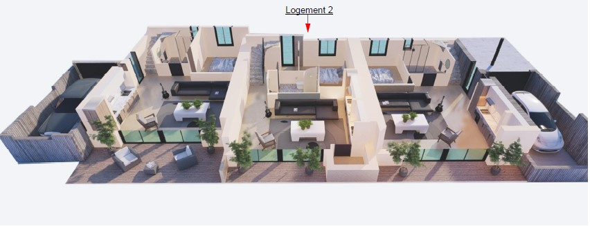 Le rez-de-chaussée se compose d'un espace de vie avec une cuisine ouverte et un séjour de 40.15 m2, avec une chambre de 12.05 m2 aisni que d'une salle de bains de 5.40 m2
