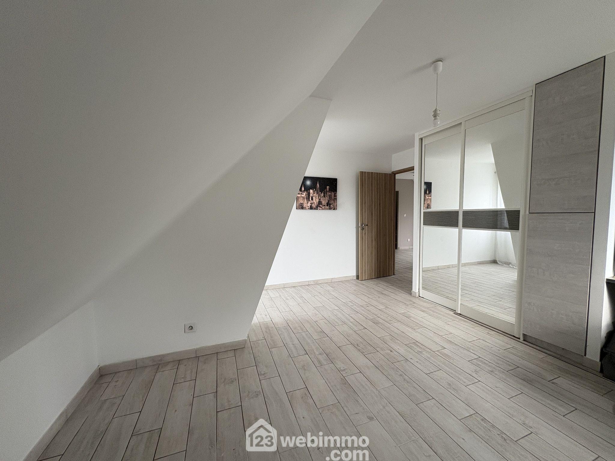 À l'étage, une belle pièce palière polyvalente, idéale pour un bureau ou une salle de jeux, mène aux trois grandes chambres (14,5 m² chacune), toutes équipées de placards intégrés. une grande salle d'eau avec douche et baignoire ainsi qu'un toilette séparé complètent cet étage